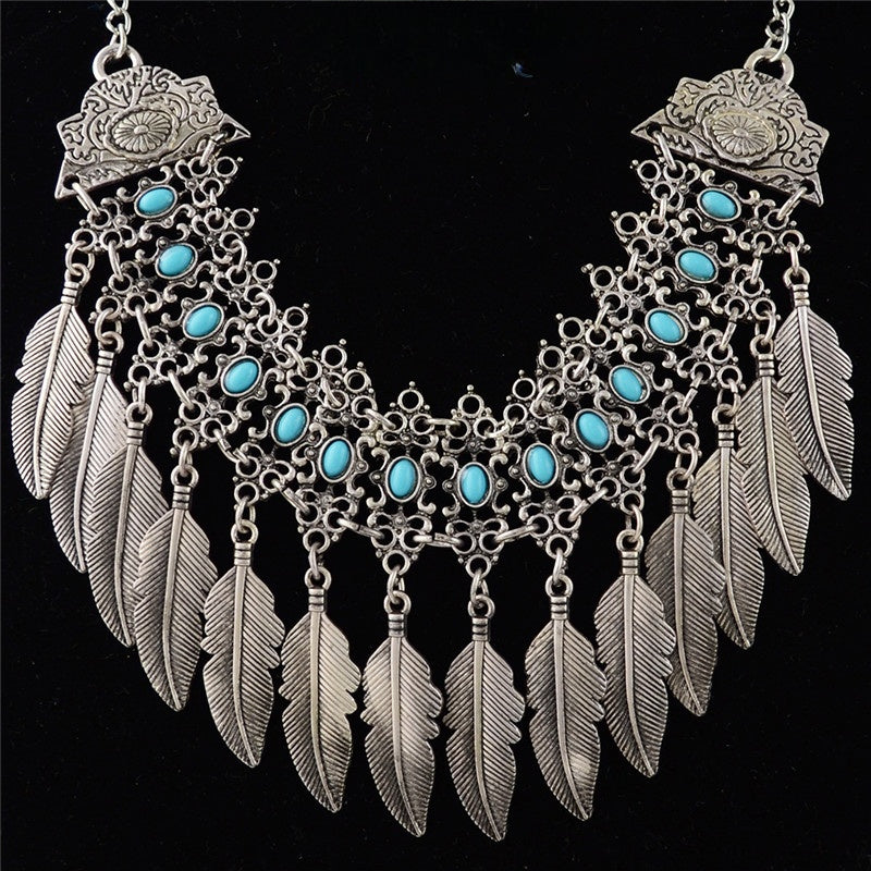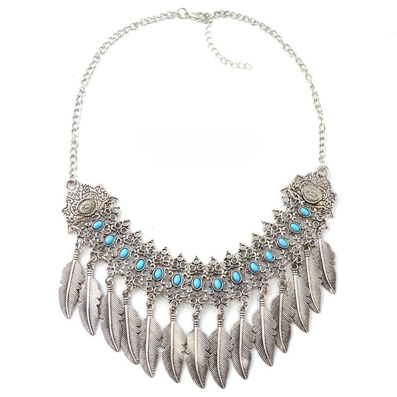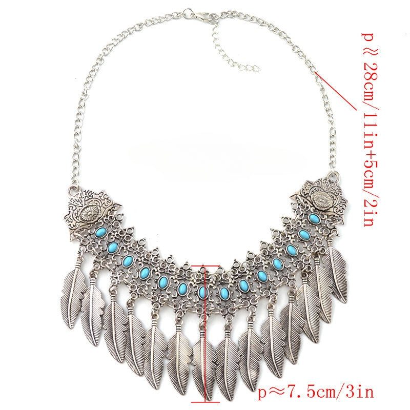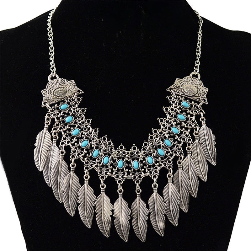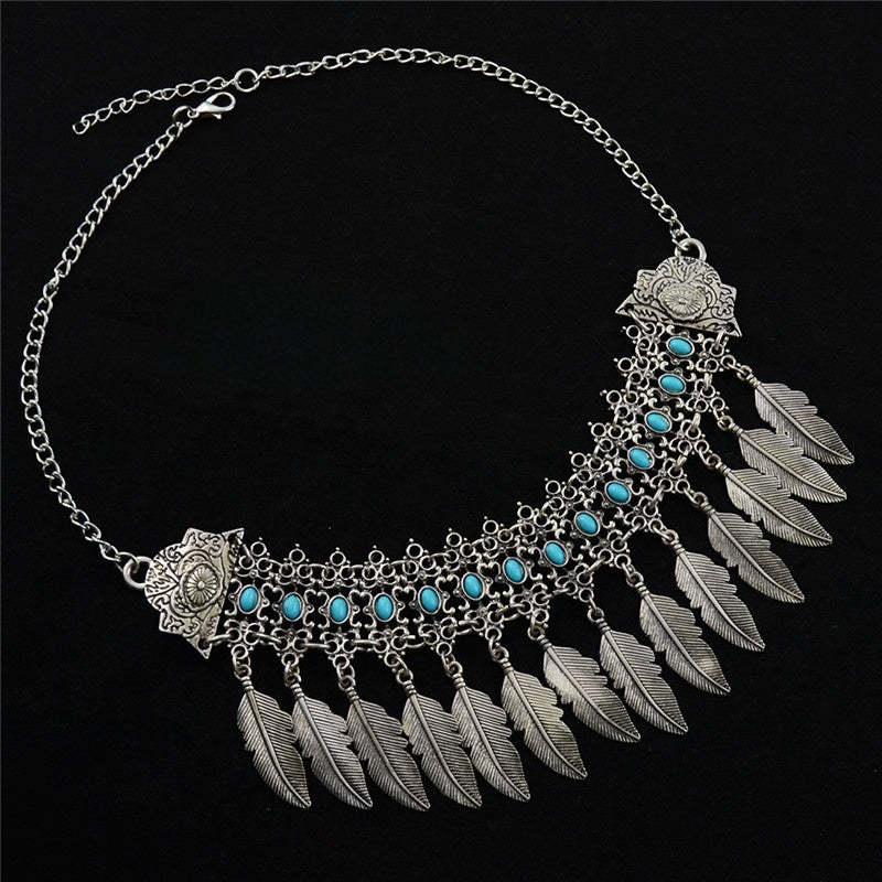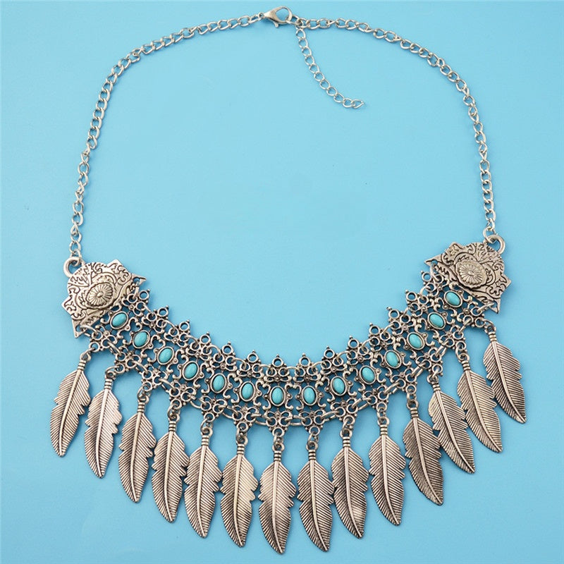 This stunning vintage necklace features a silver-plated alloy leaf design with a tassel and turquoise chain. Perfect for women's jewelry collection.
