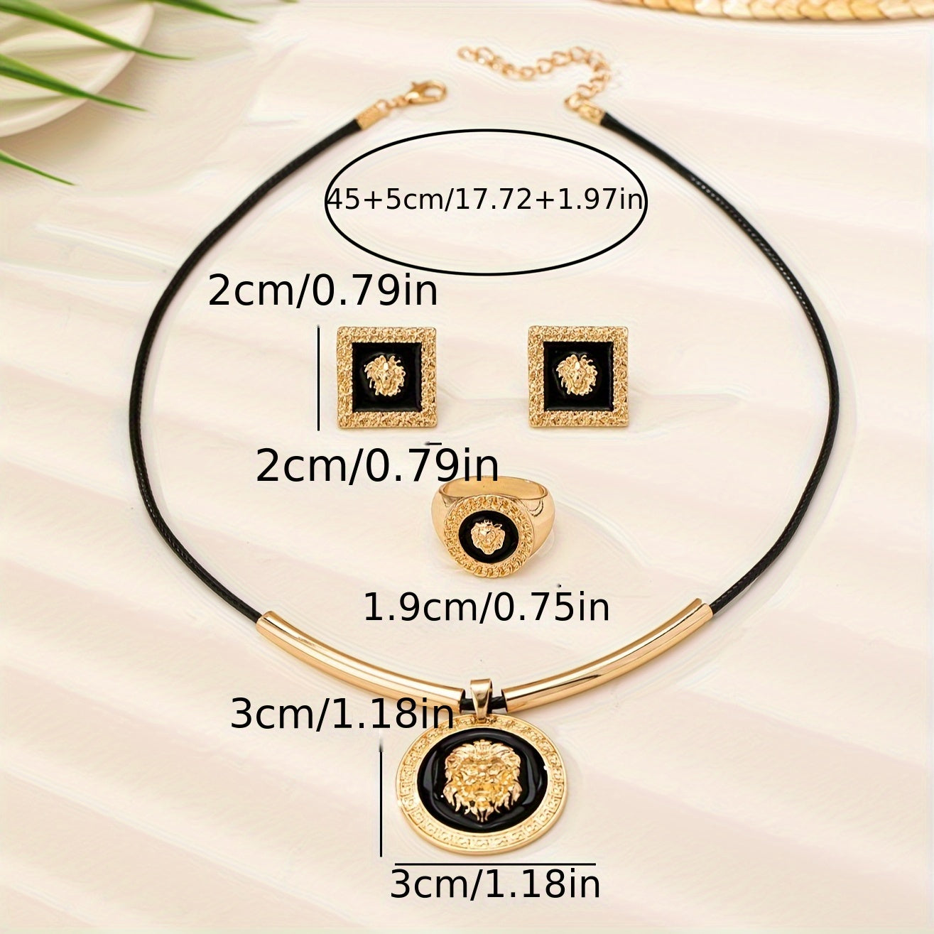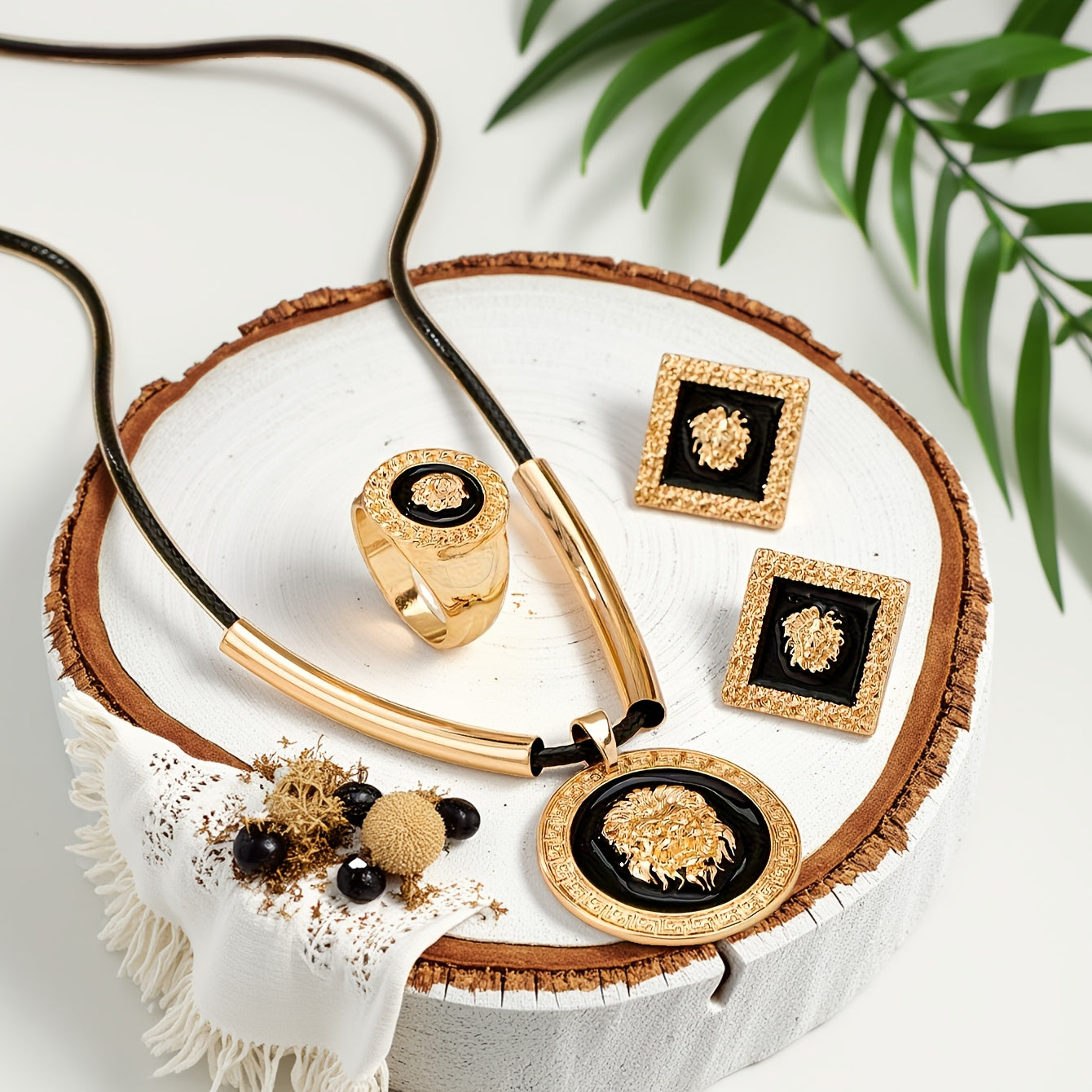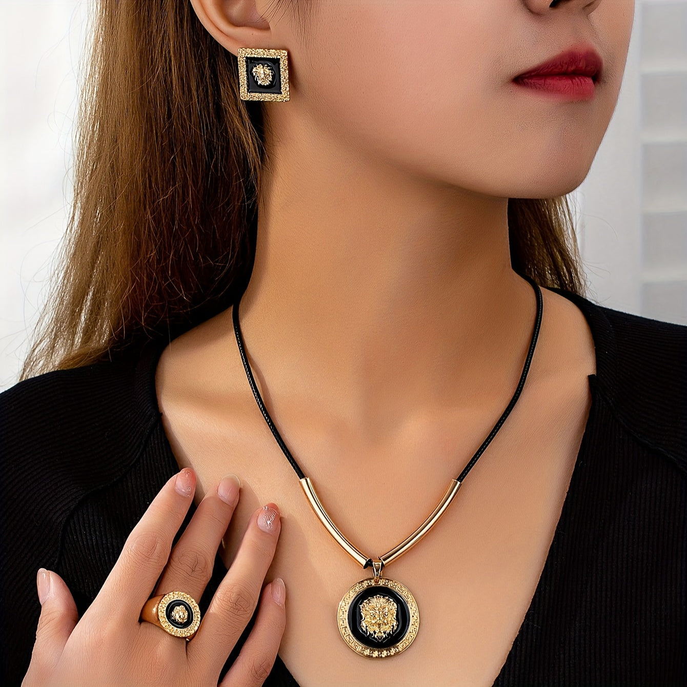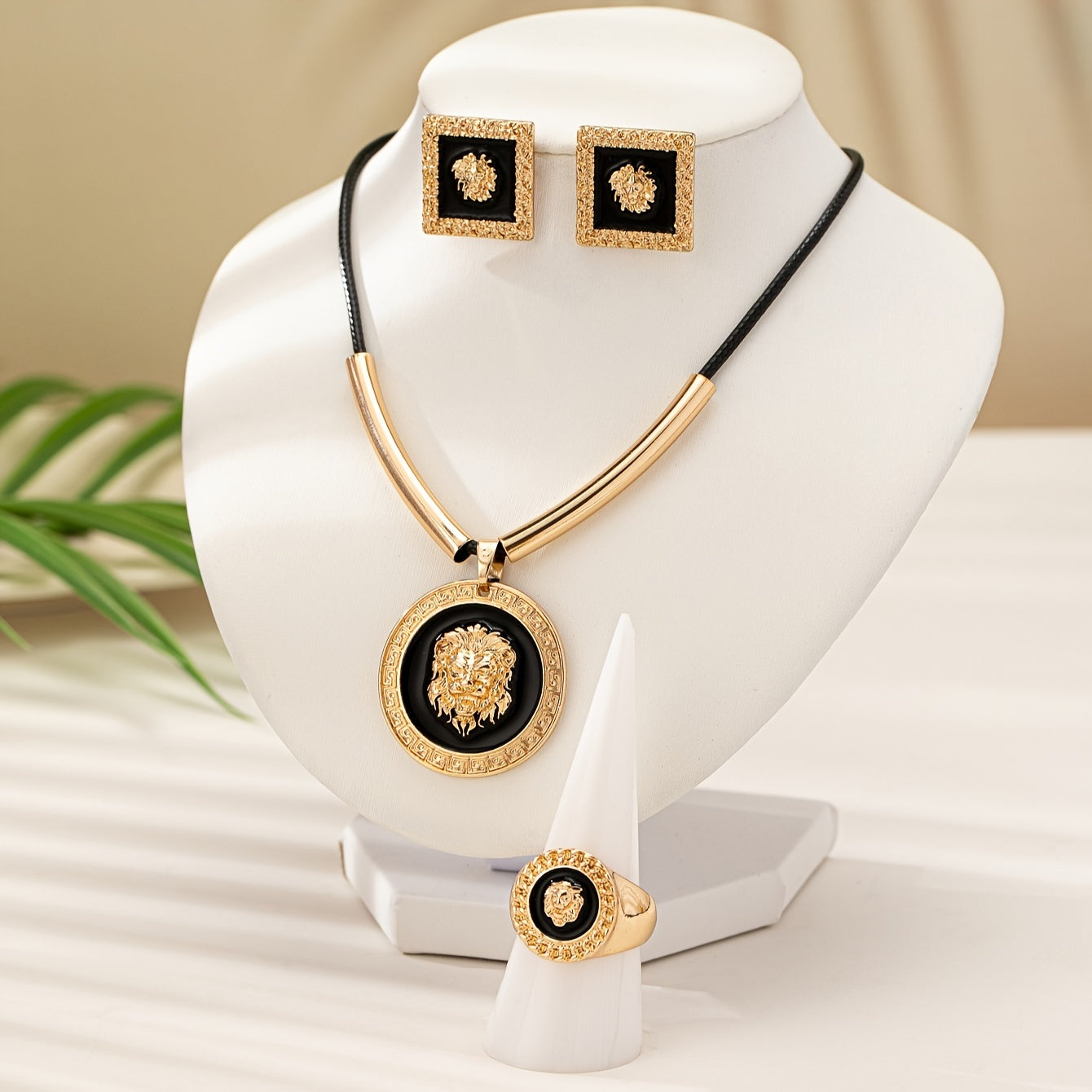 Embrace a retro style with this lion head pendant earrings, necklace, and ring set. Ideal for casual outfits, these pieces feature a geometric totem design for a unique touch.