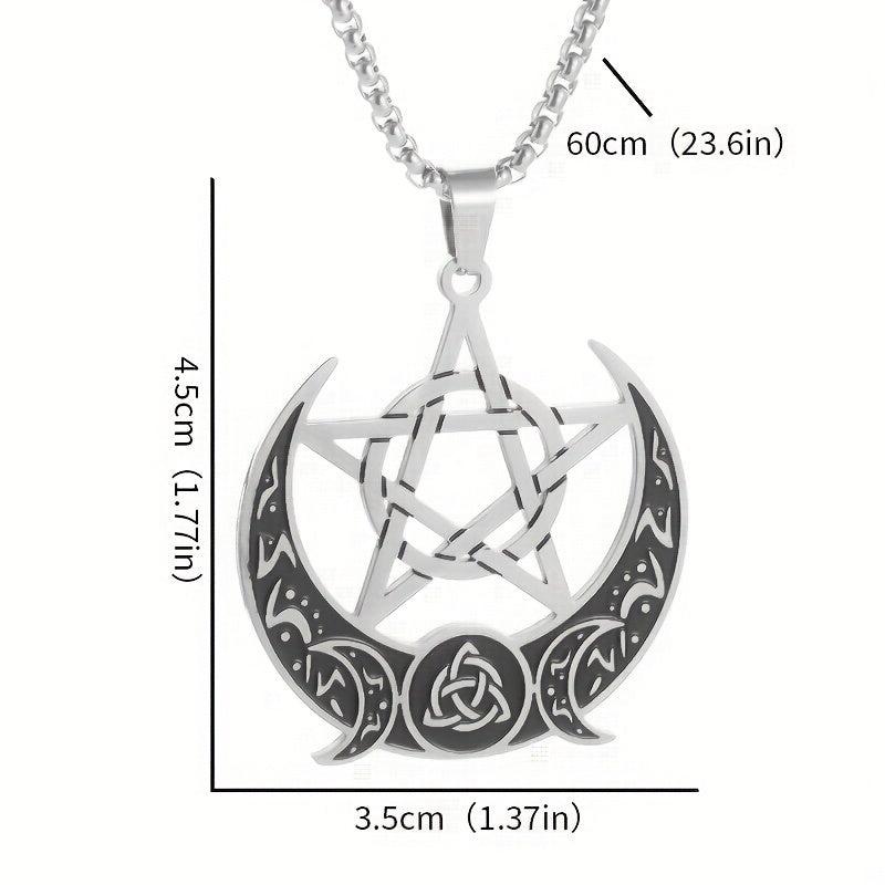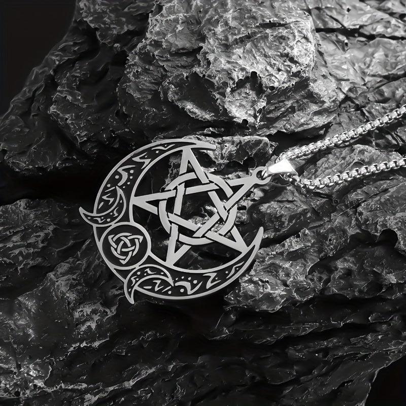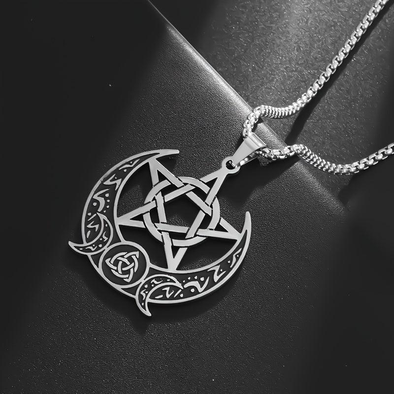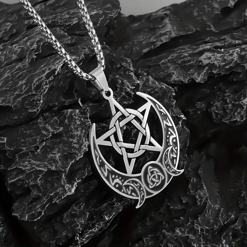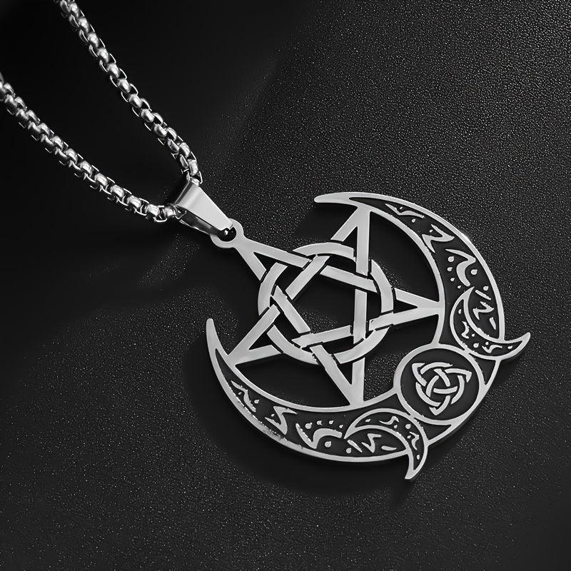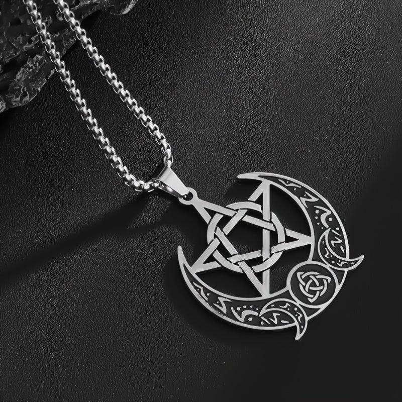 This vintage stainless steel pendant necklace features a Celtic pentagram moon design, perfect for party or casual wear.