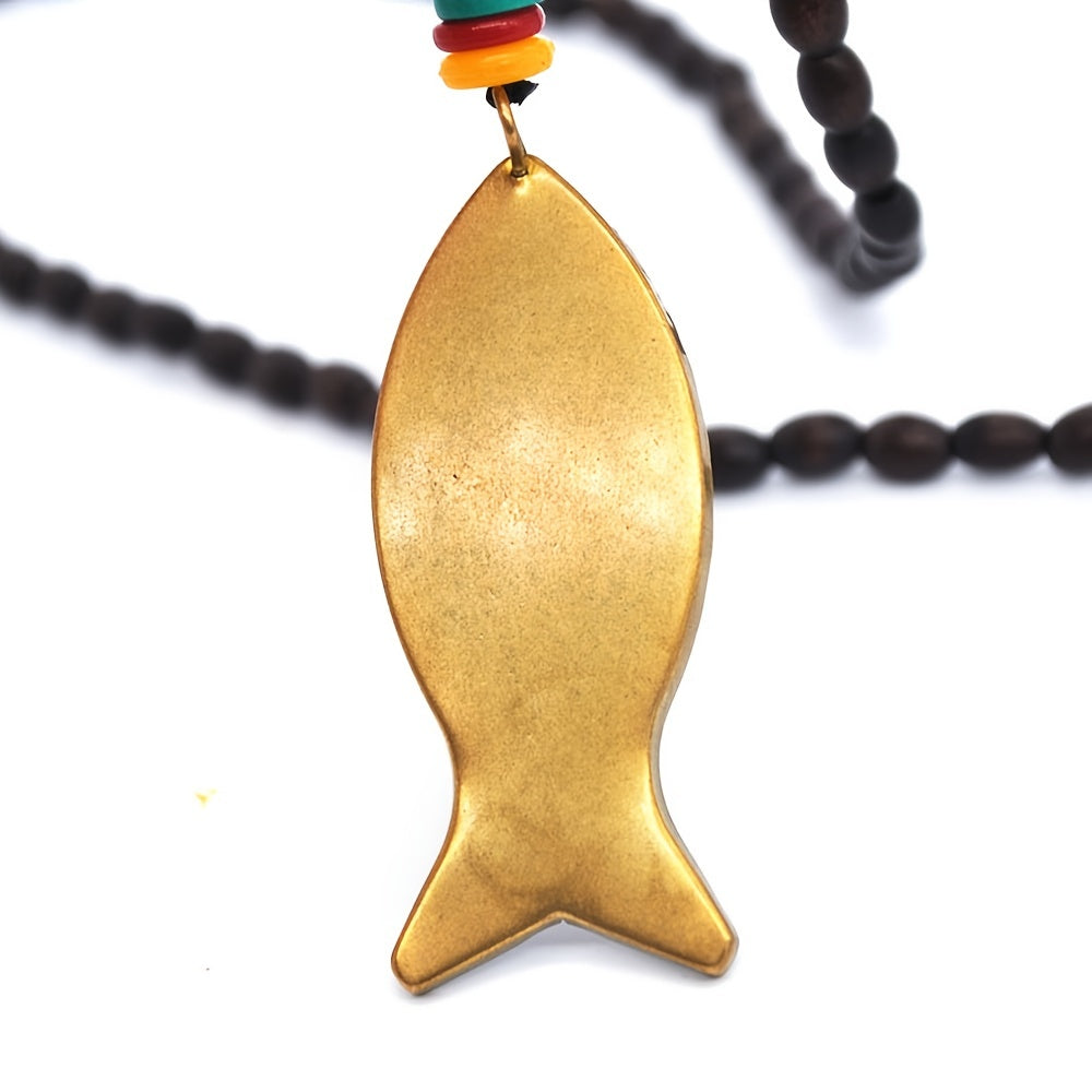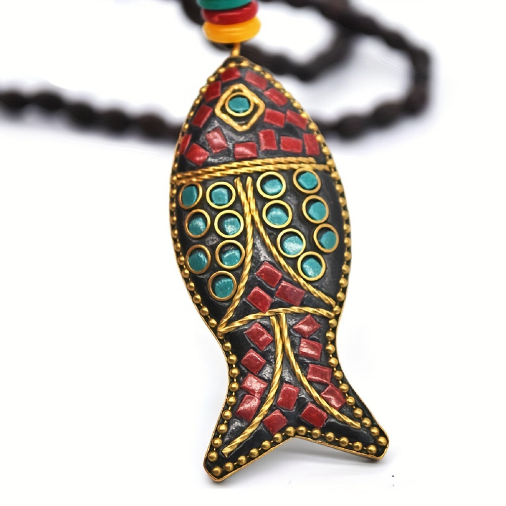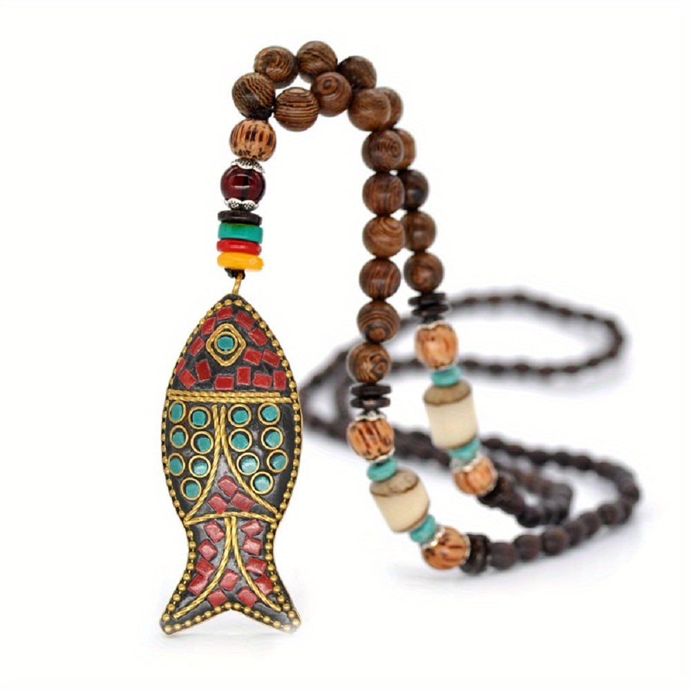 This vintage Nepal ethnic style necklace features a fish pendant and long beaded design, perfect for adding a unique touch to your outfit.
