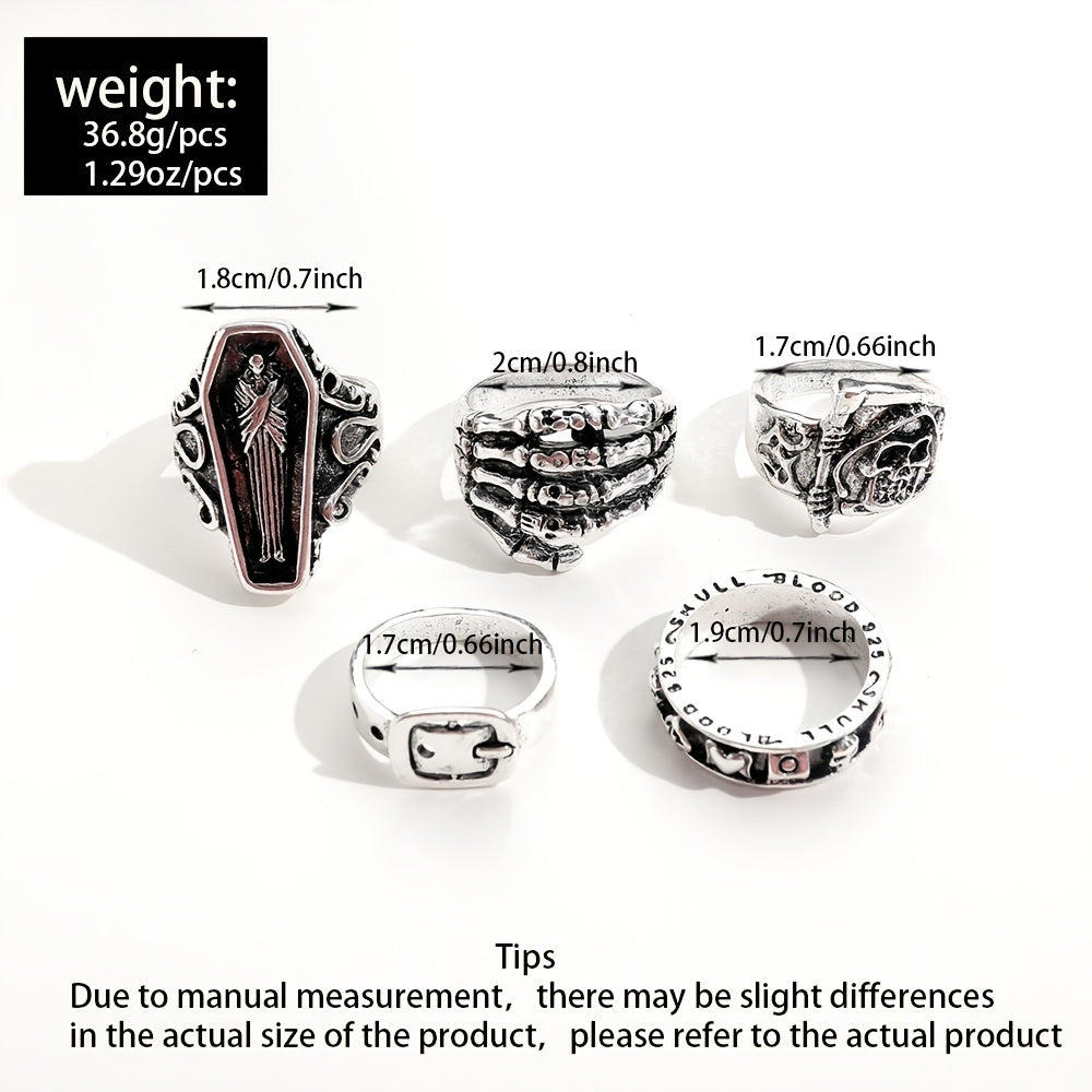 Embrace a dark and vintage punk style with this set of 5 skinny buckle rings featuring skull designs. Perfect for adding an edgy touch to your look.