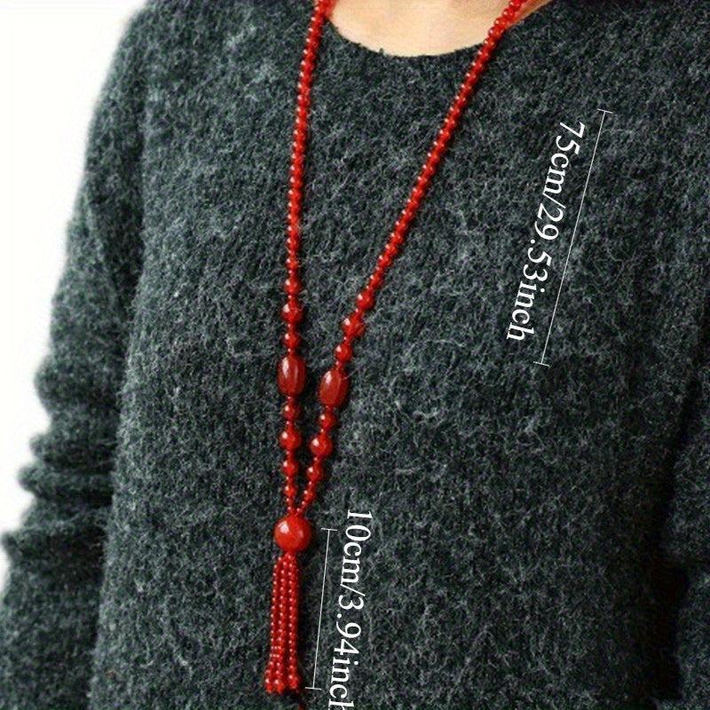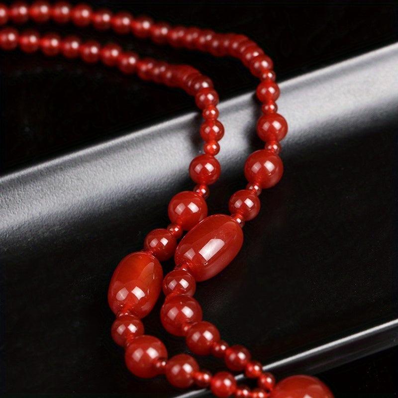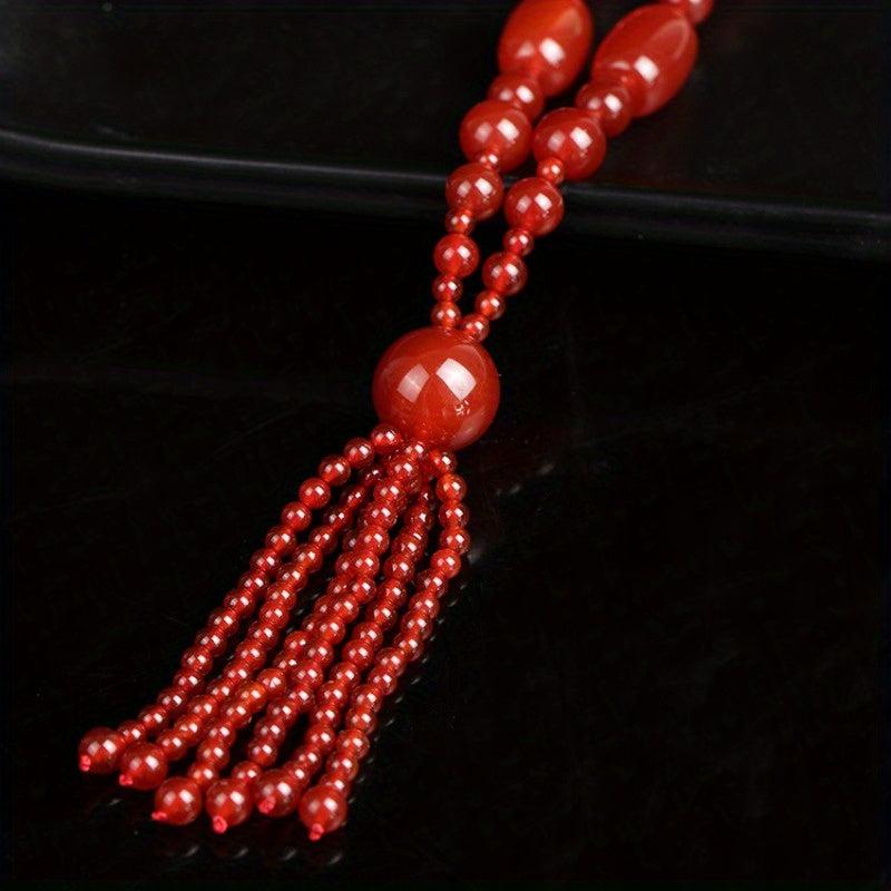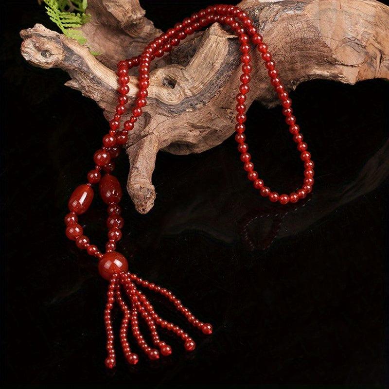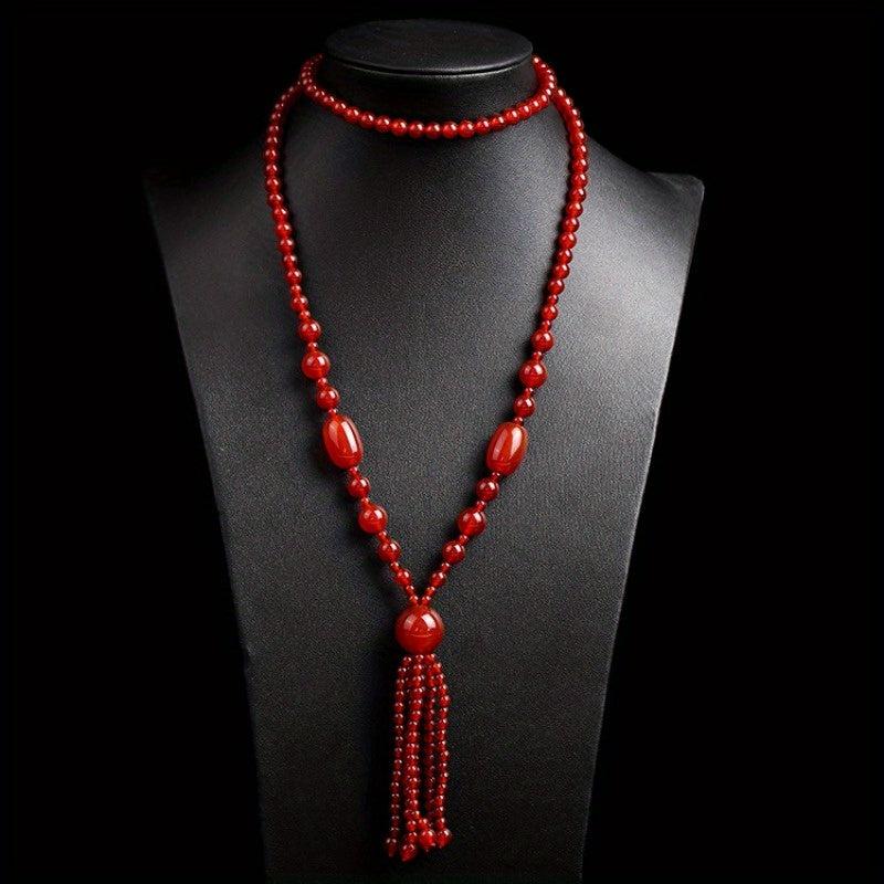 Elevate your casual attire with this vintage-inspired red agate necklace featuring a tassel pendant. Crafted from natural stone, this long sweater chain is a stunning accessory for women.