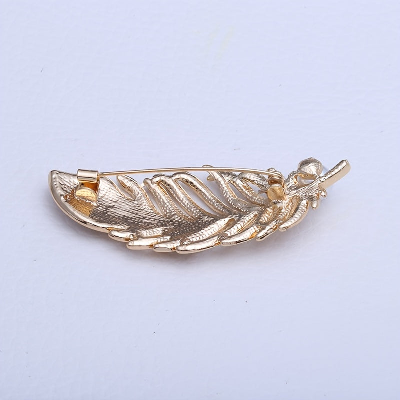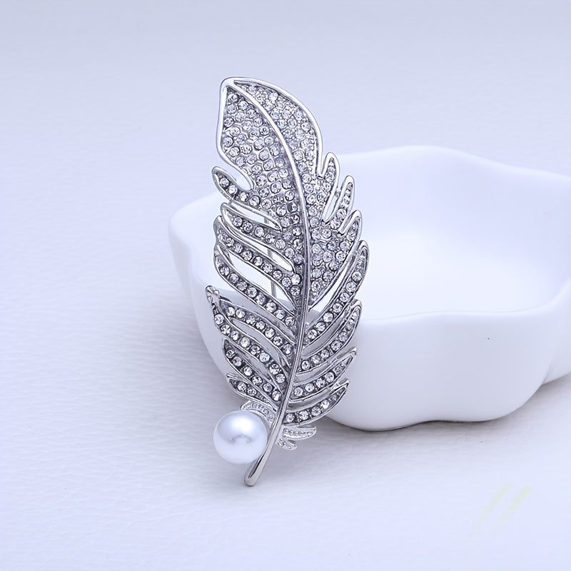 Add a touch of elegance to your outfit with this vintage rhinestones brooch in a delicate feather shape, embellished with faux pearls. Perfect for sweaters, scarves, shawls, or as a dress buckle pin. Makes a lovely gift for birthdays or Christmas.
