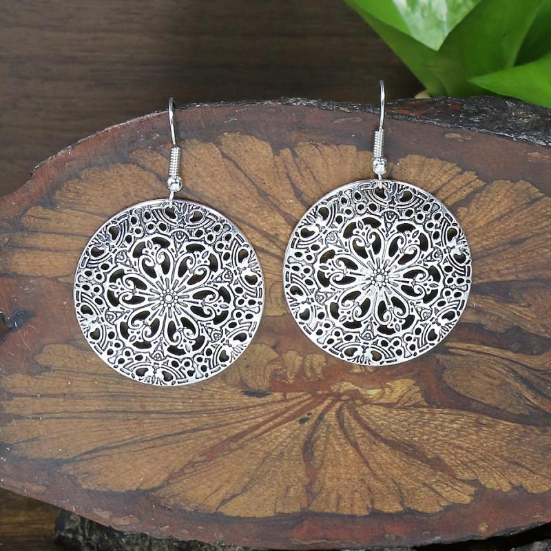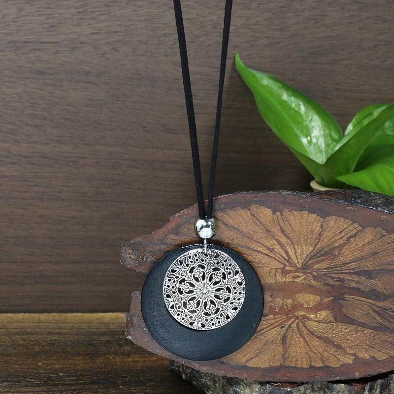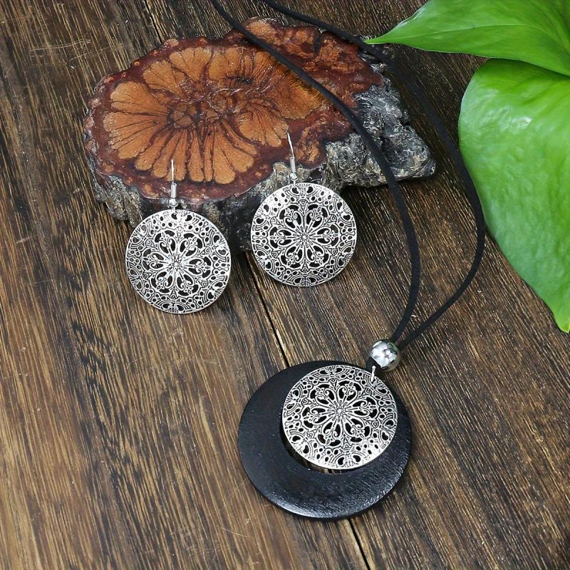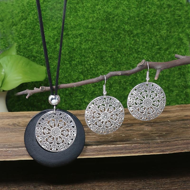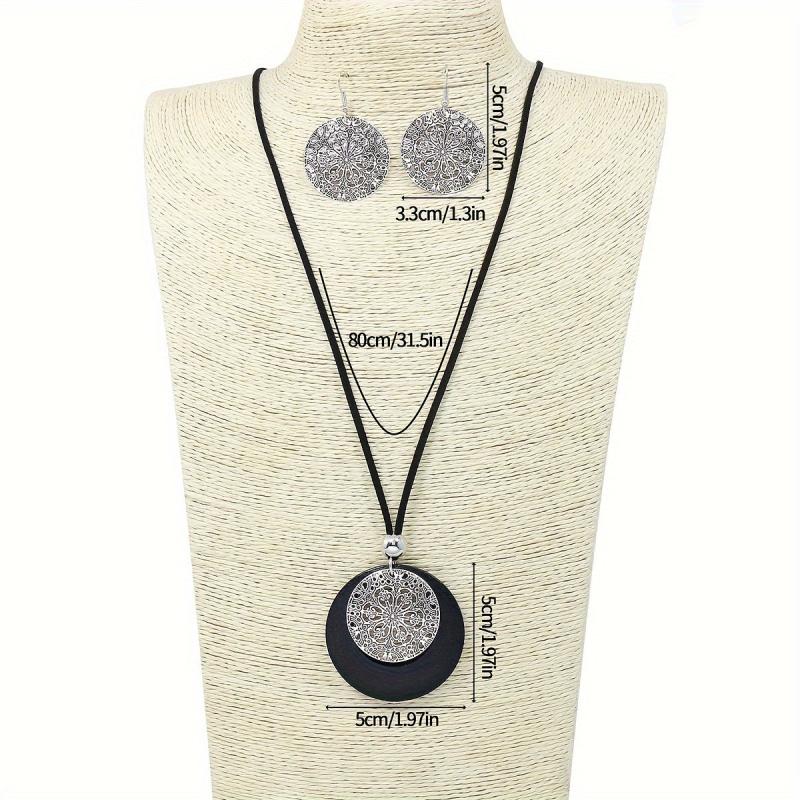 This vintage royal style jewelry set includes a pair of hollow out zinc alloy earrings, a wooden circle ring, and a layered pendant sweater chain. It is a fashionable accessory for women.