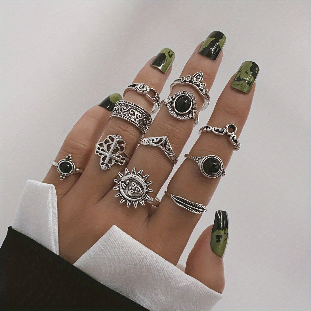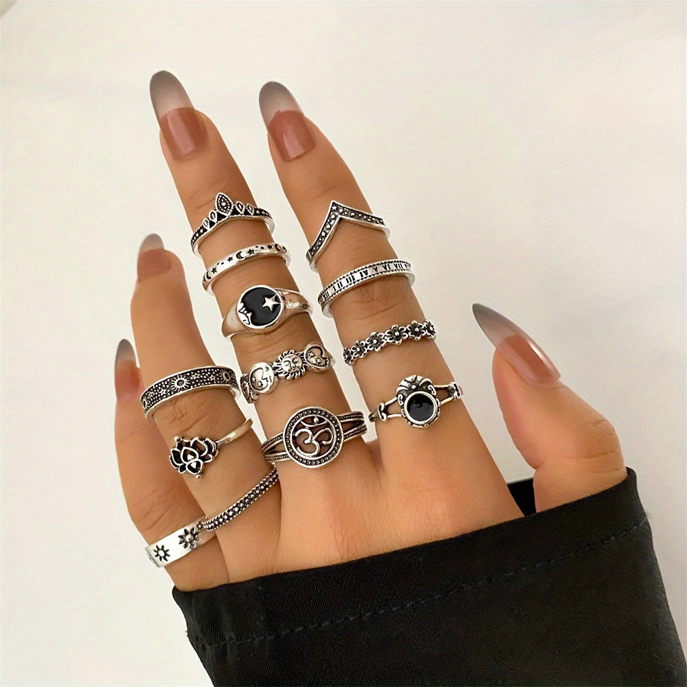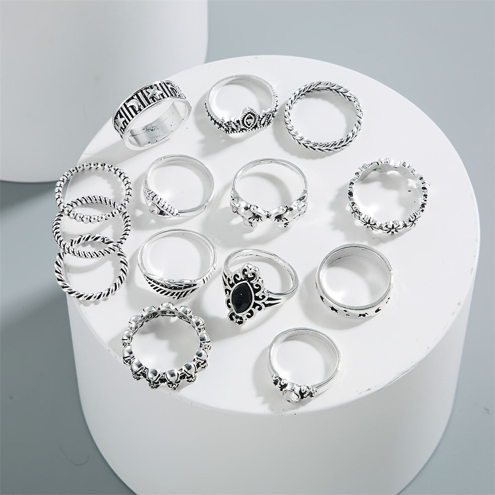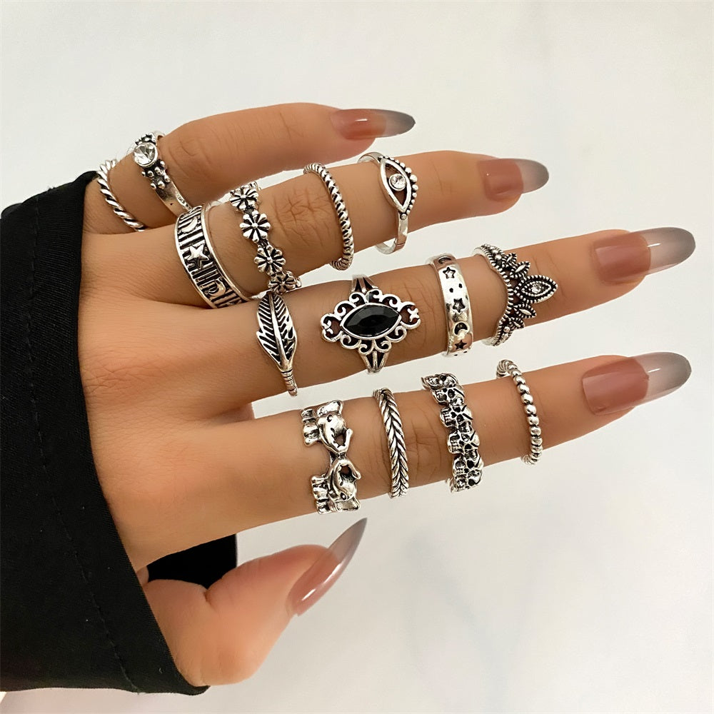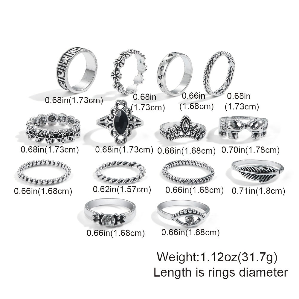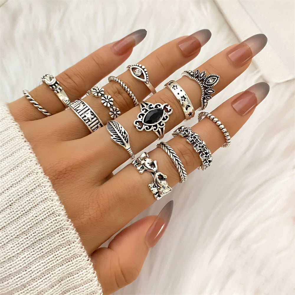Add a touch of elegance to your party look with this 14-piece set of vintage silver rings featuring elephant, skull, rhinestone, leaf, and flower designs. These hand accessories are perfect for any occasion.