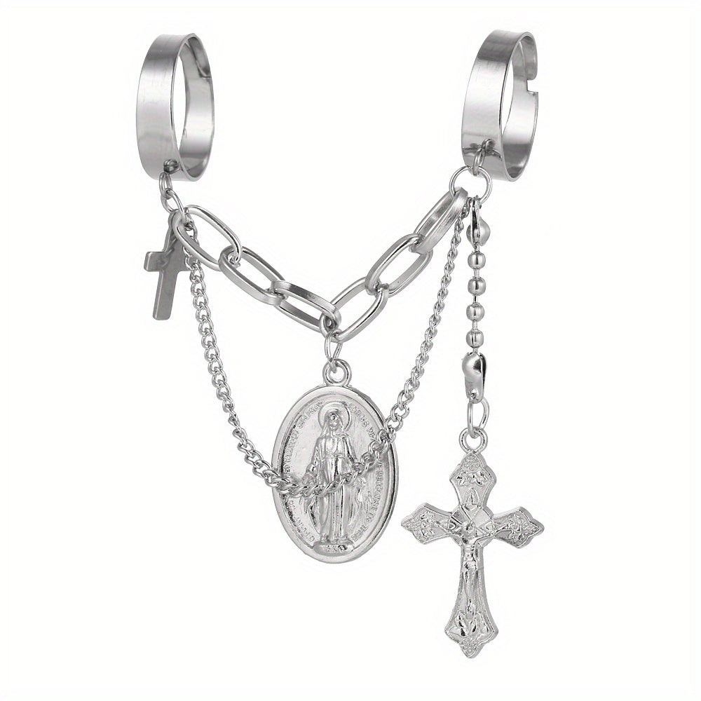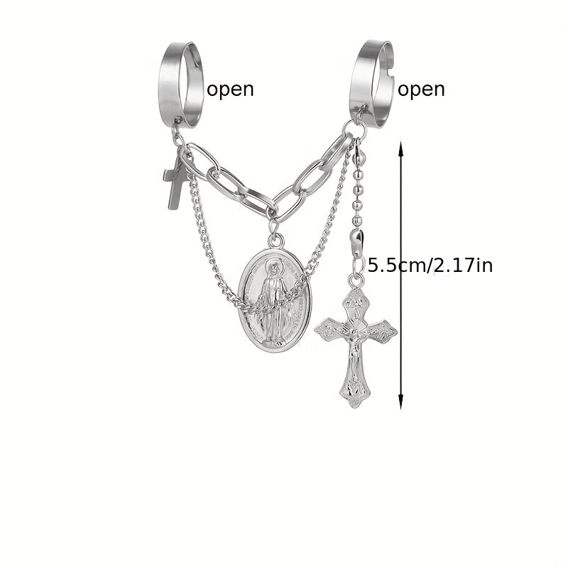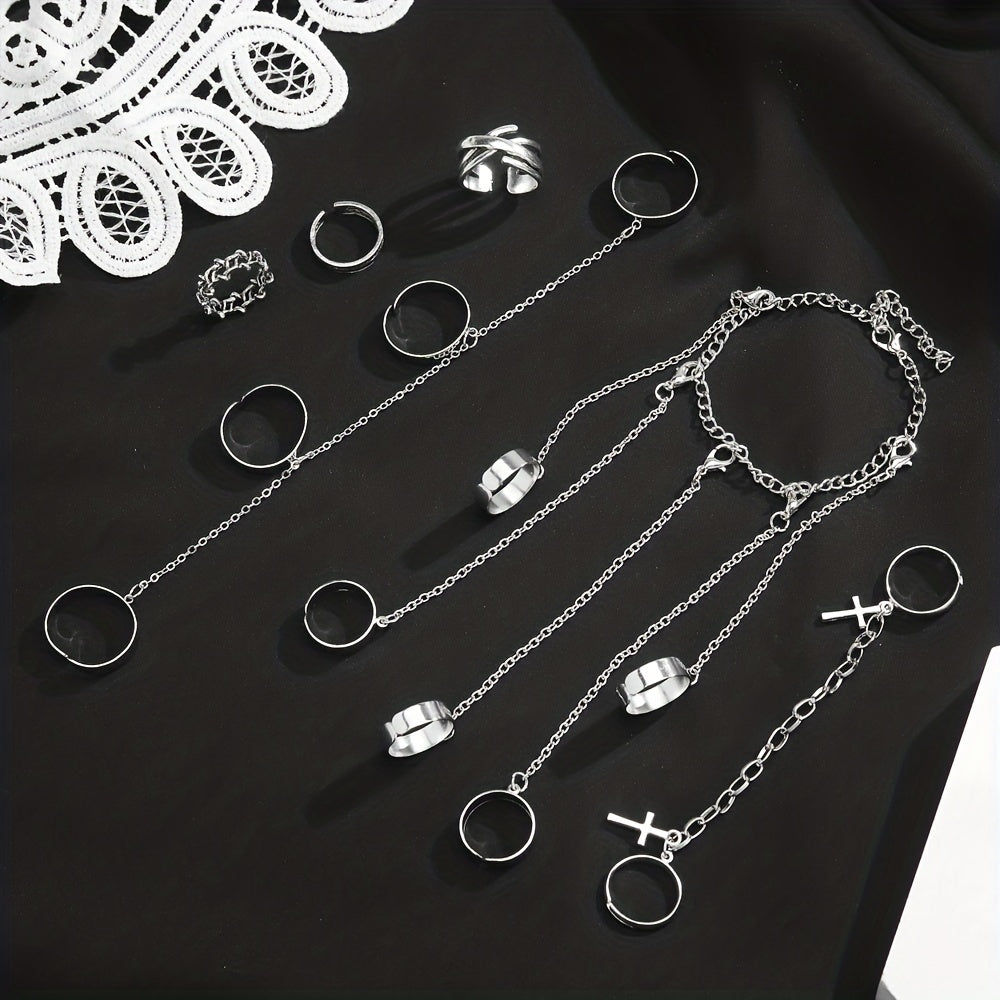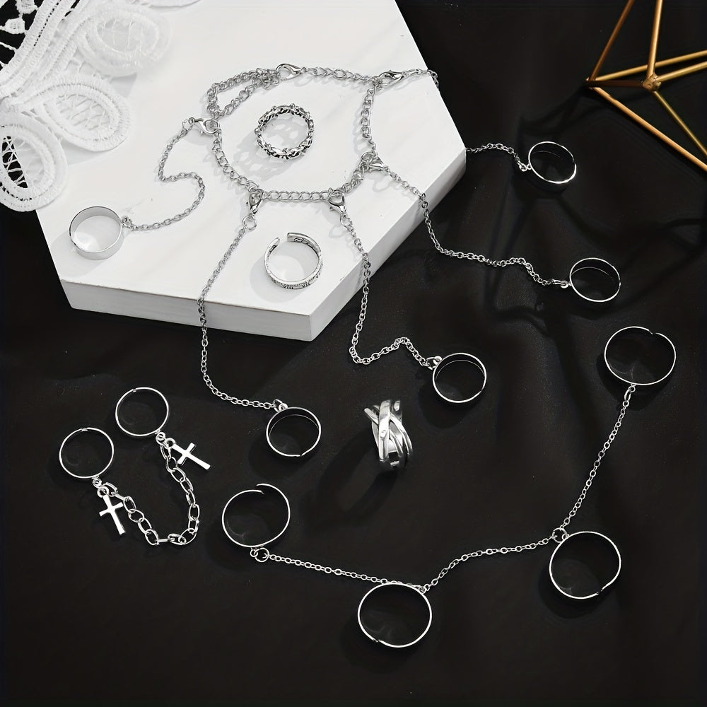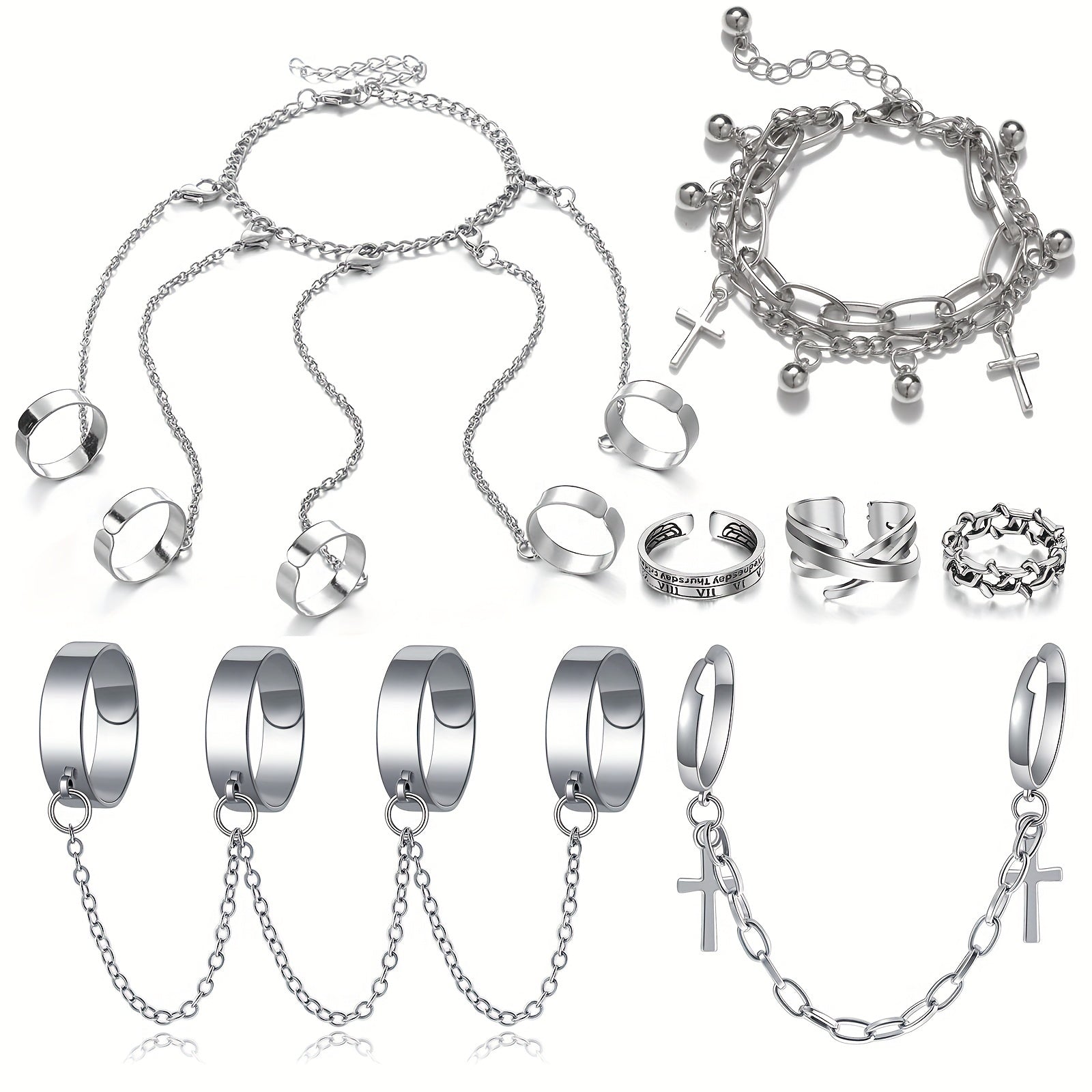 This adjustable statement stackable ring set is perfect for boys, girls, men, and women who love gothic punk style. It features a unique chain design with cross accents, making it a bold and versatile accessory.