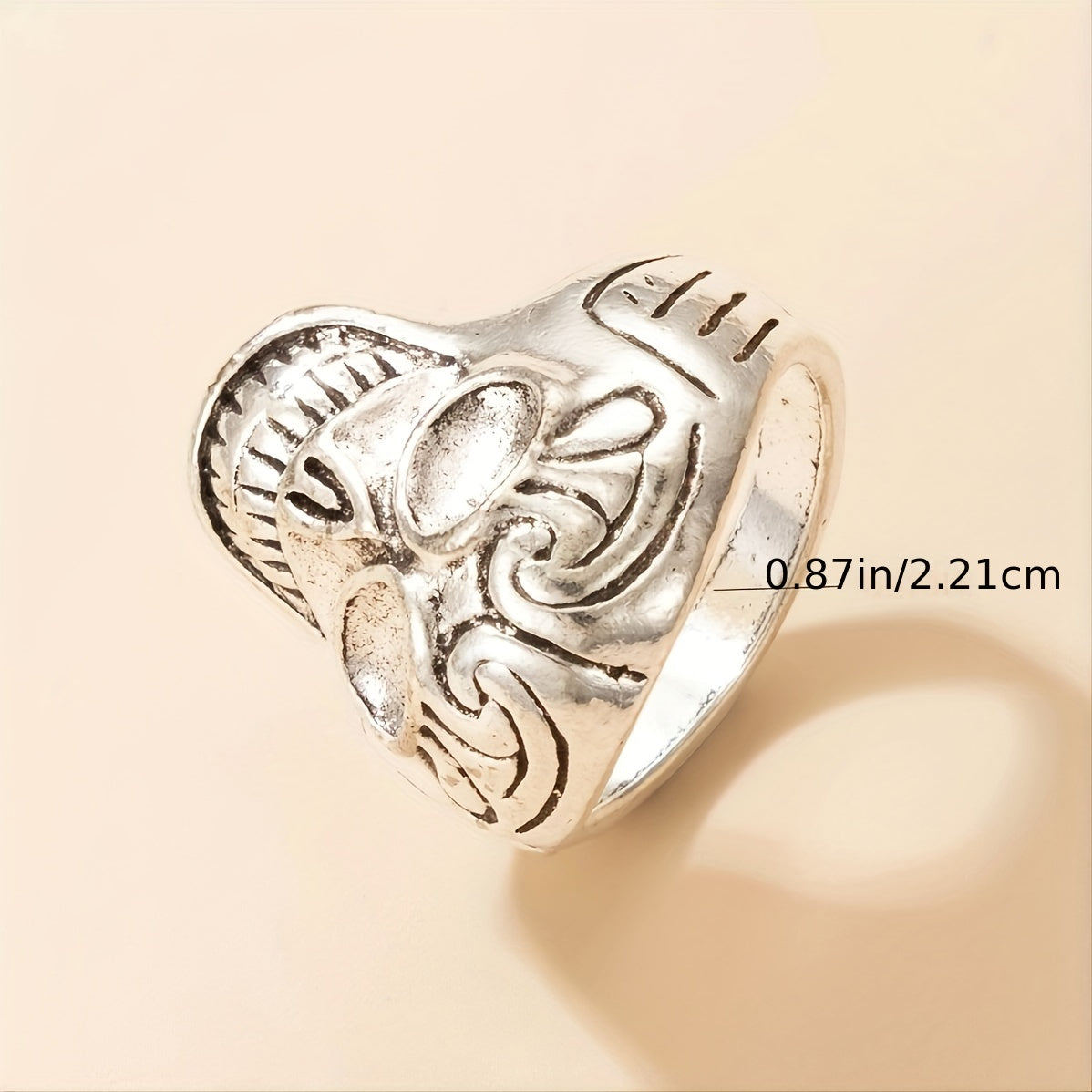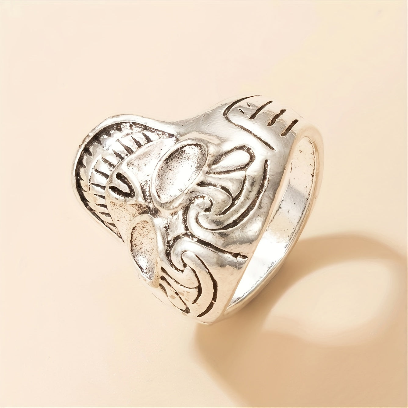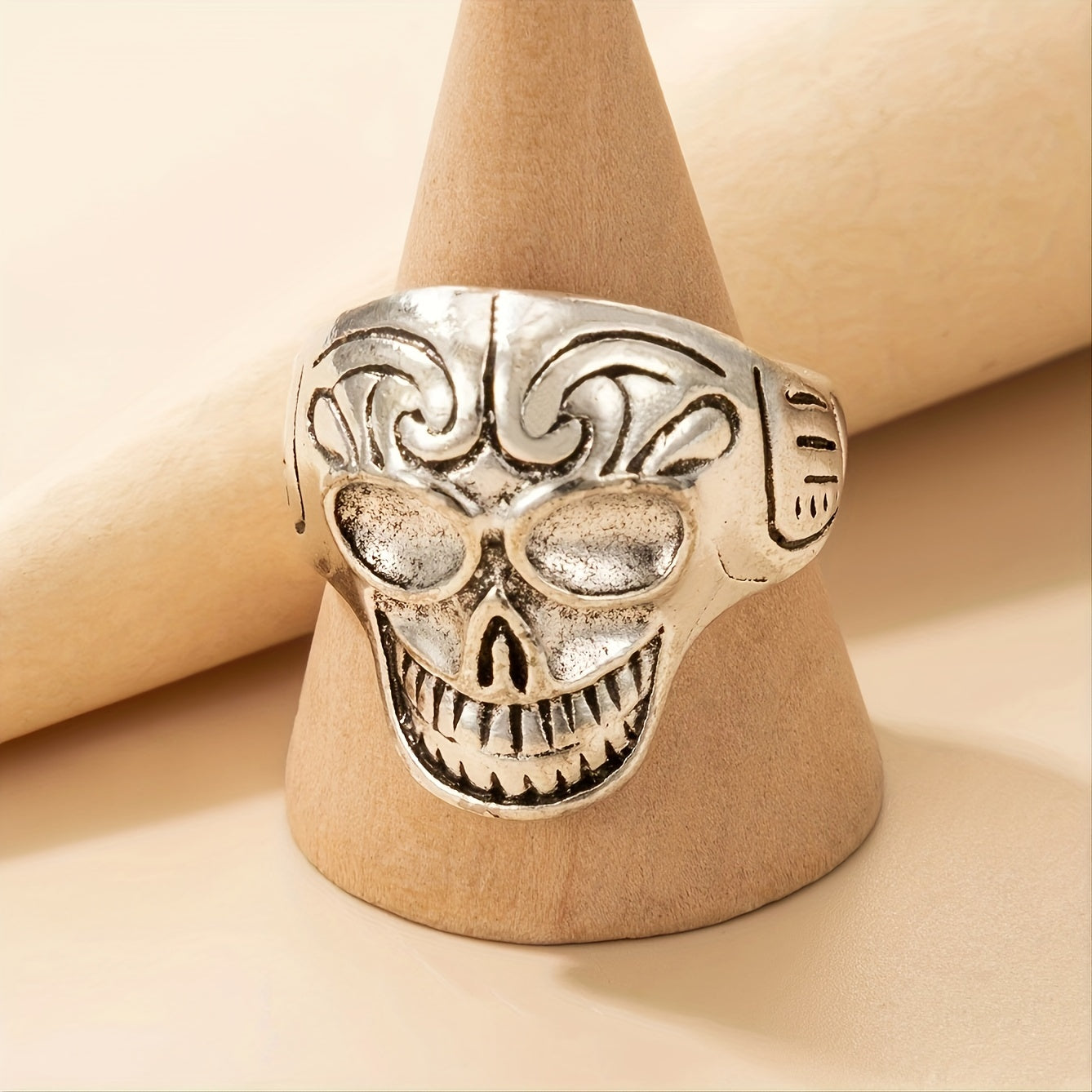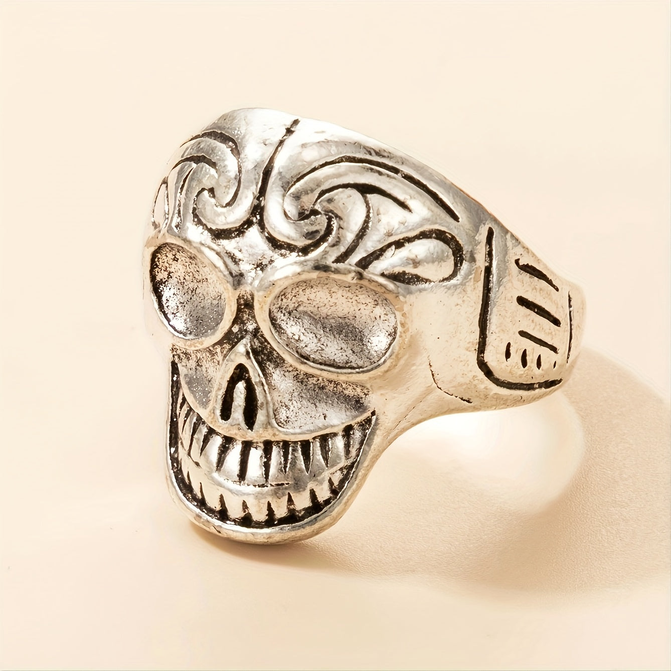 This skull ring features intricate carving and a punk style design, making it suitable for both men and women. Crafted from zinc alloy, it matches well with daily outfits and serves as the perfect Halloween accessory.