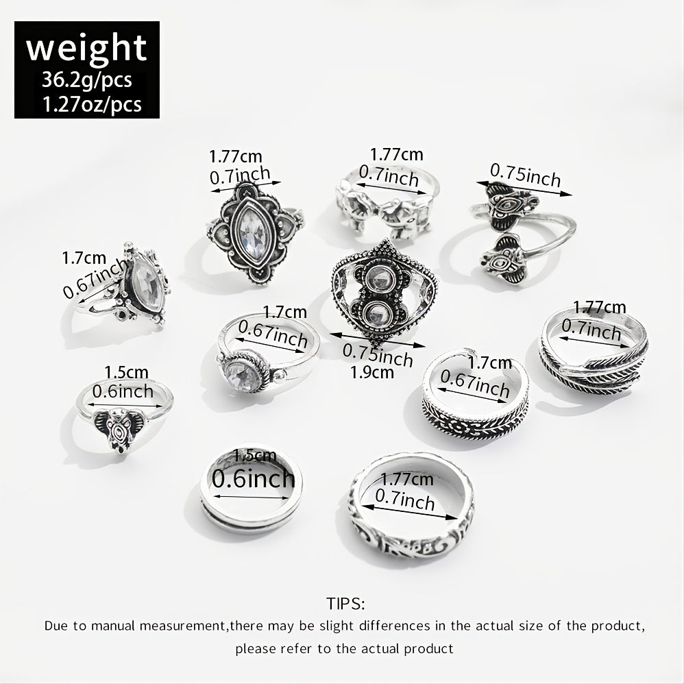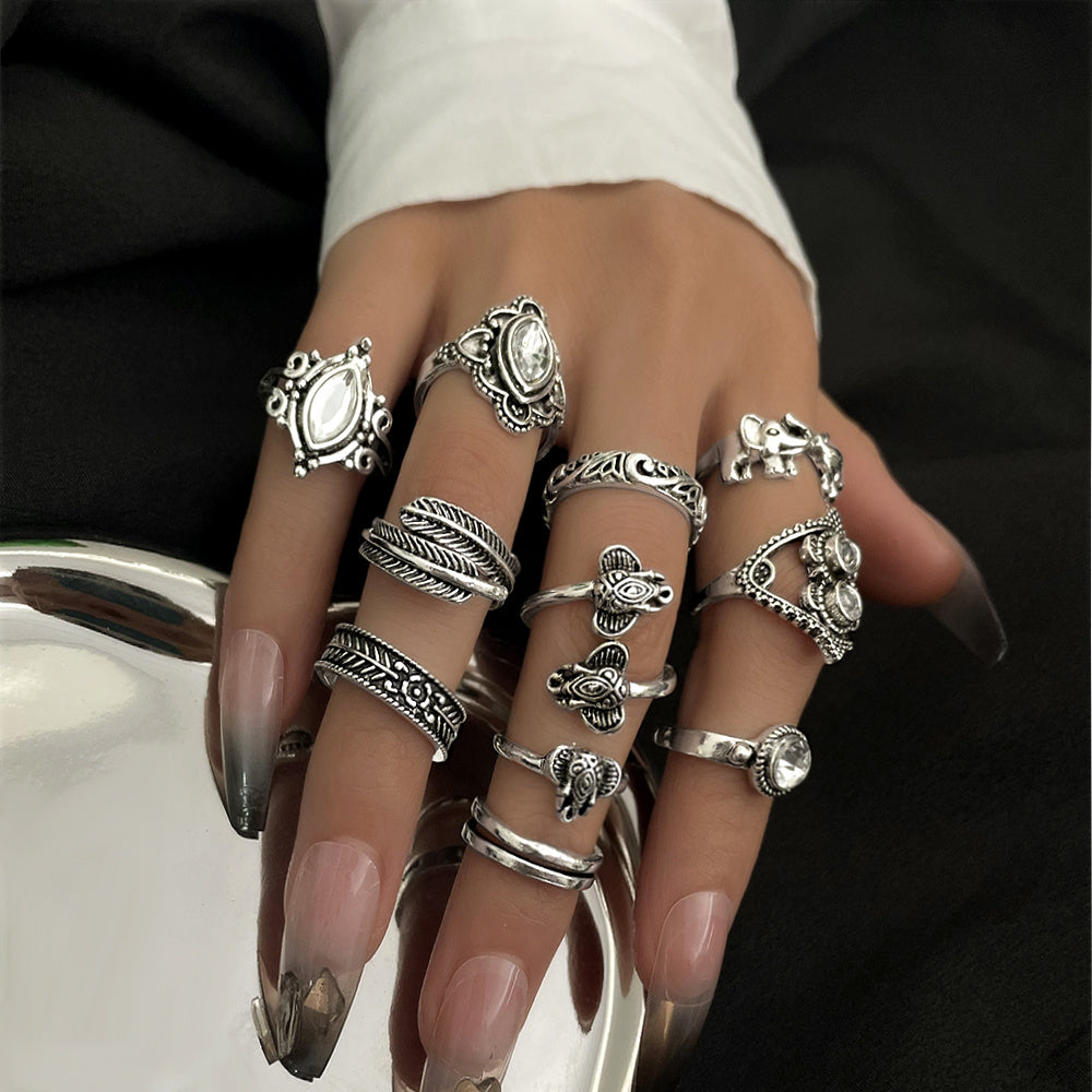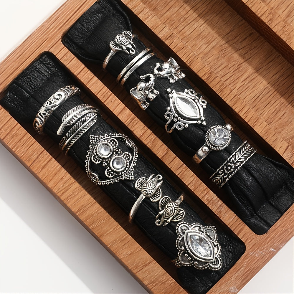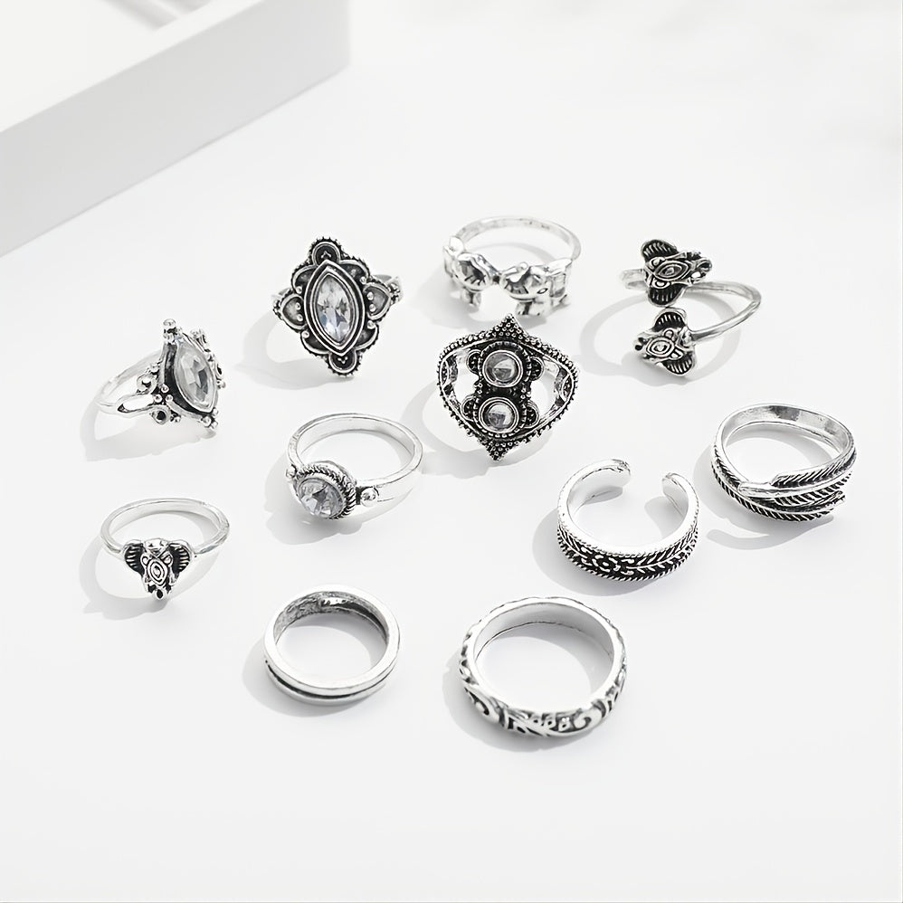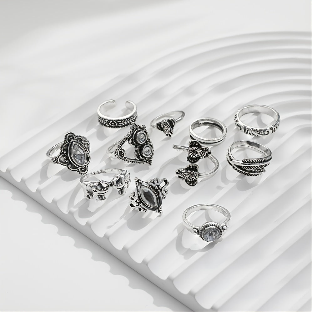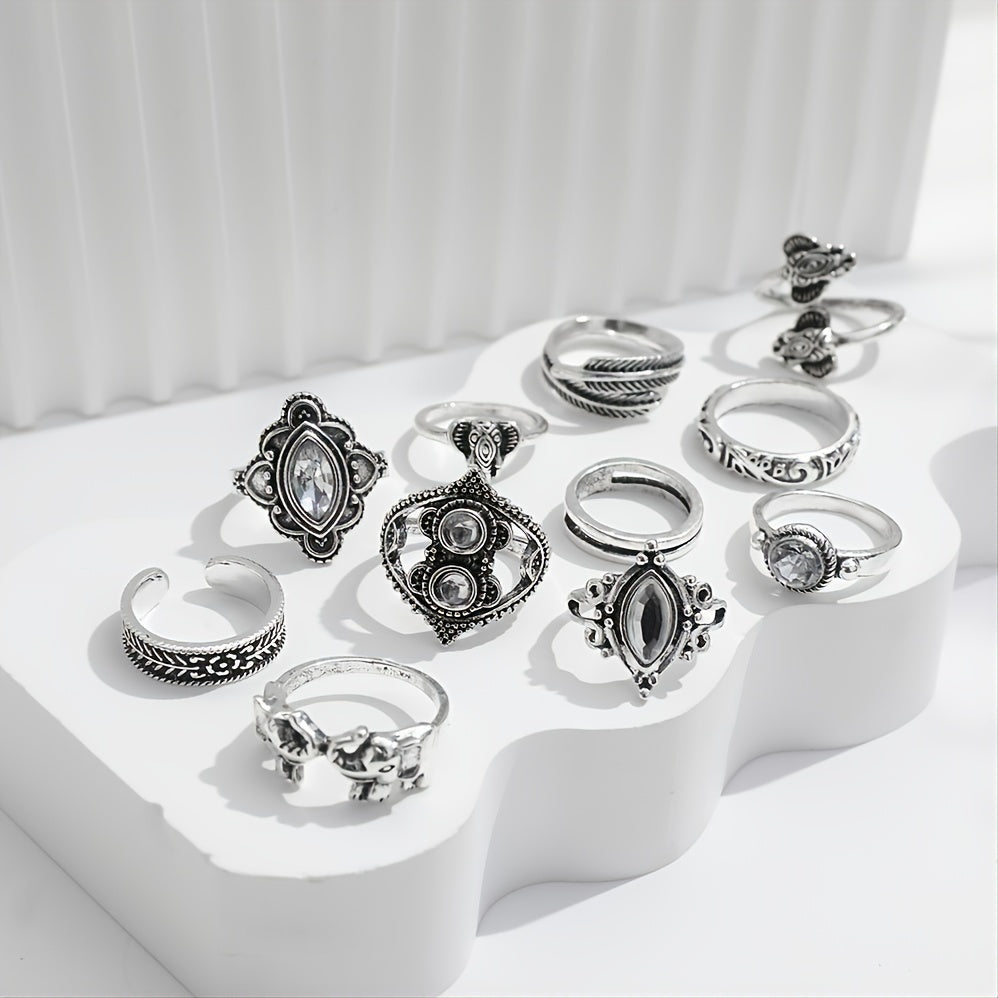 This 11-piece ring set features a mix of elephant, leaf, and rhinestone charms. Perfect for stacking or wearing individually, great for women and girls.