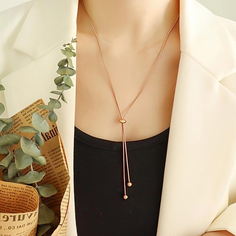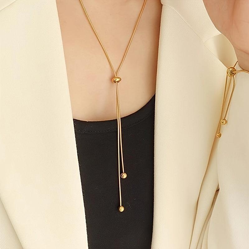 This elegant necklace features a long dangling design with spherical beads, perfect for daily wear or as a holiday gift. The 14K gold plating adds a touch of luxury to any outfit.