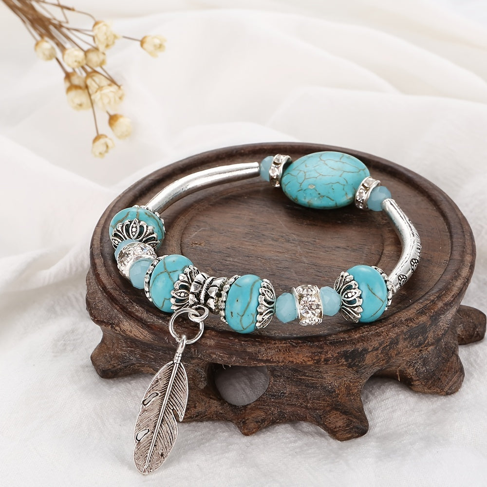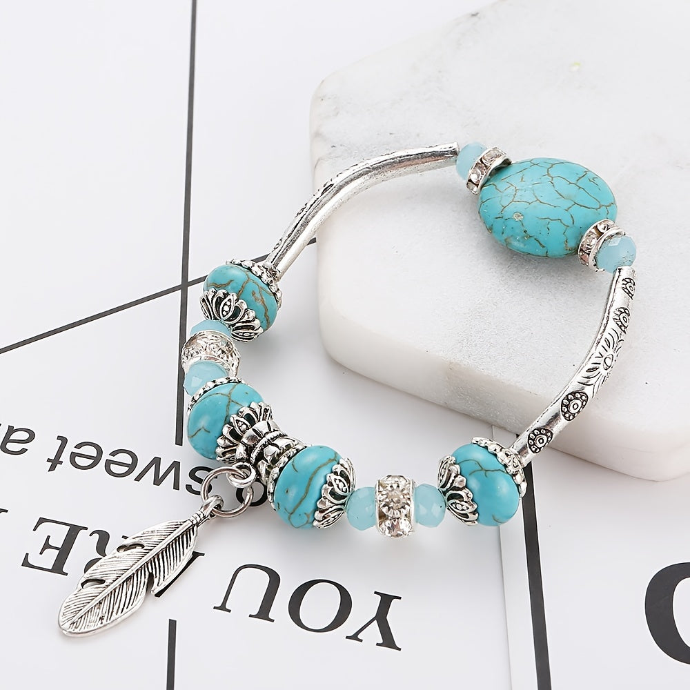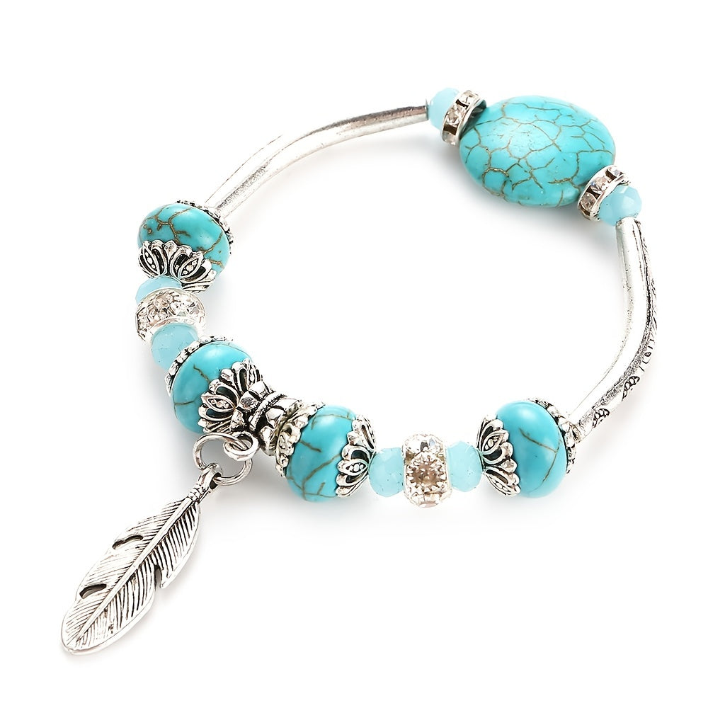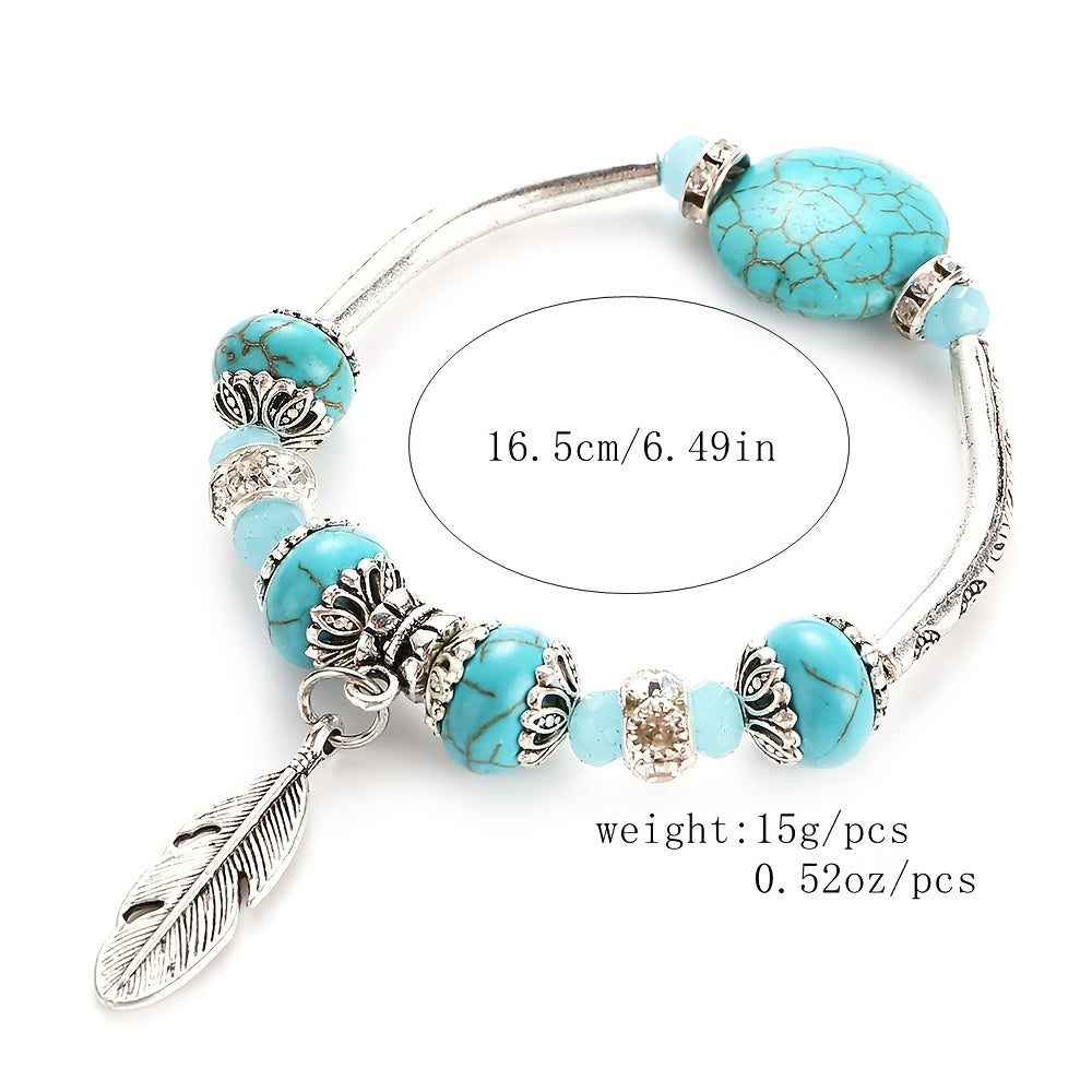 Add a touch of vintage charm to your look with this bracelet featuring a feather shape charm and turquoise beads. This hand jewelry piece is perfect for adding a boho chic vibe to your outfit.