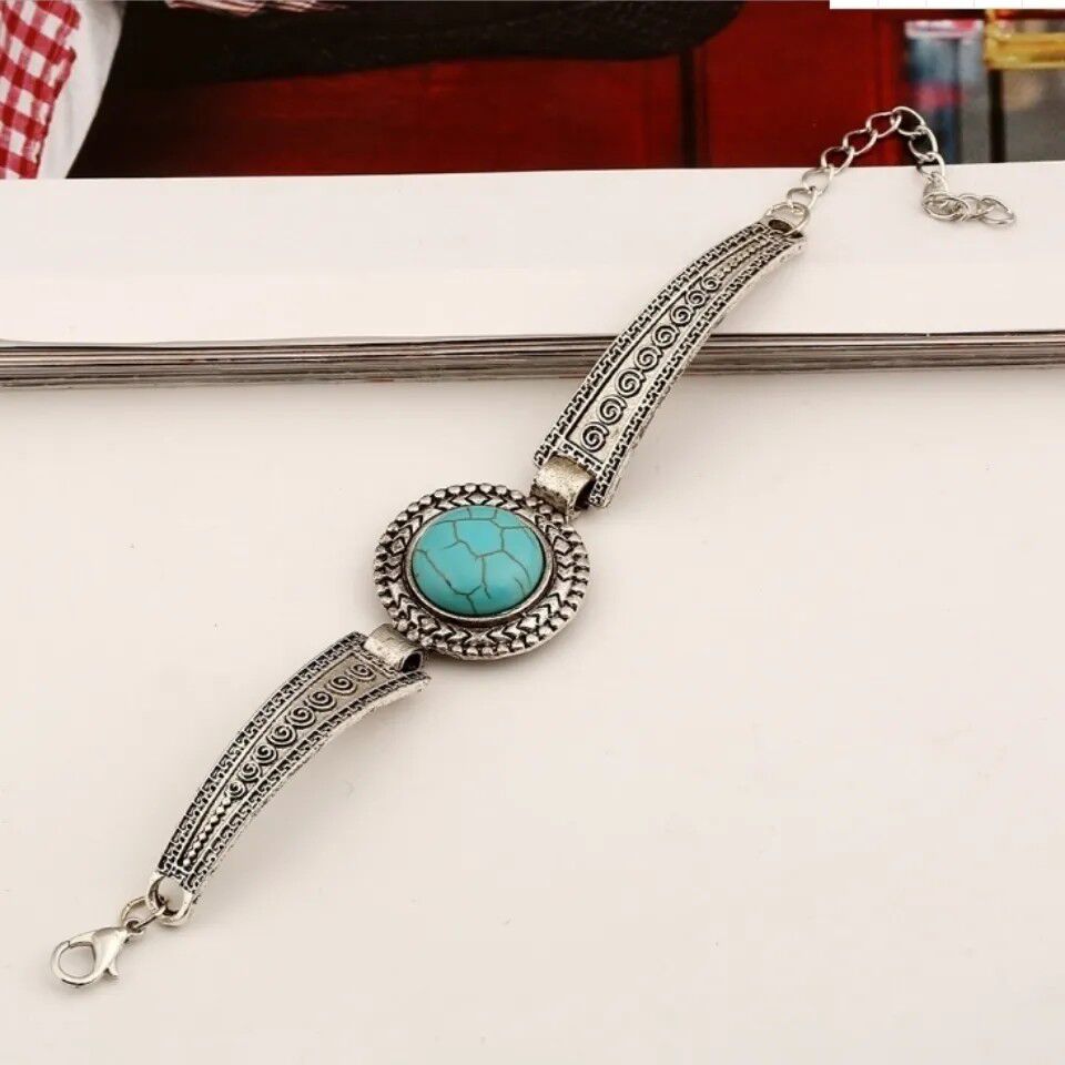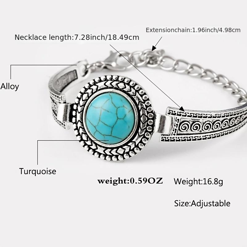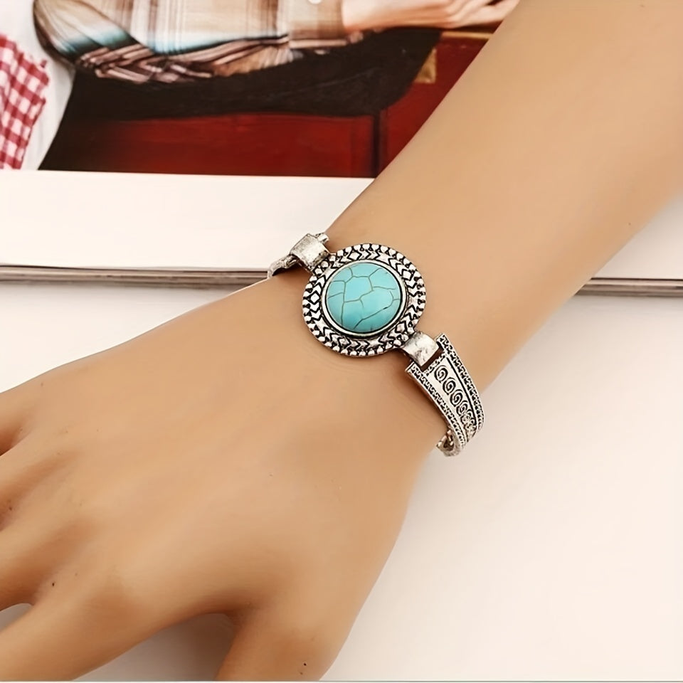 Add a touch of vintage charm to your outfit with this inlaid round turquoise bangle bracelet. Elevate your hand jewelry decor with this unique and trendy accessory.