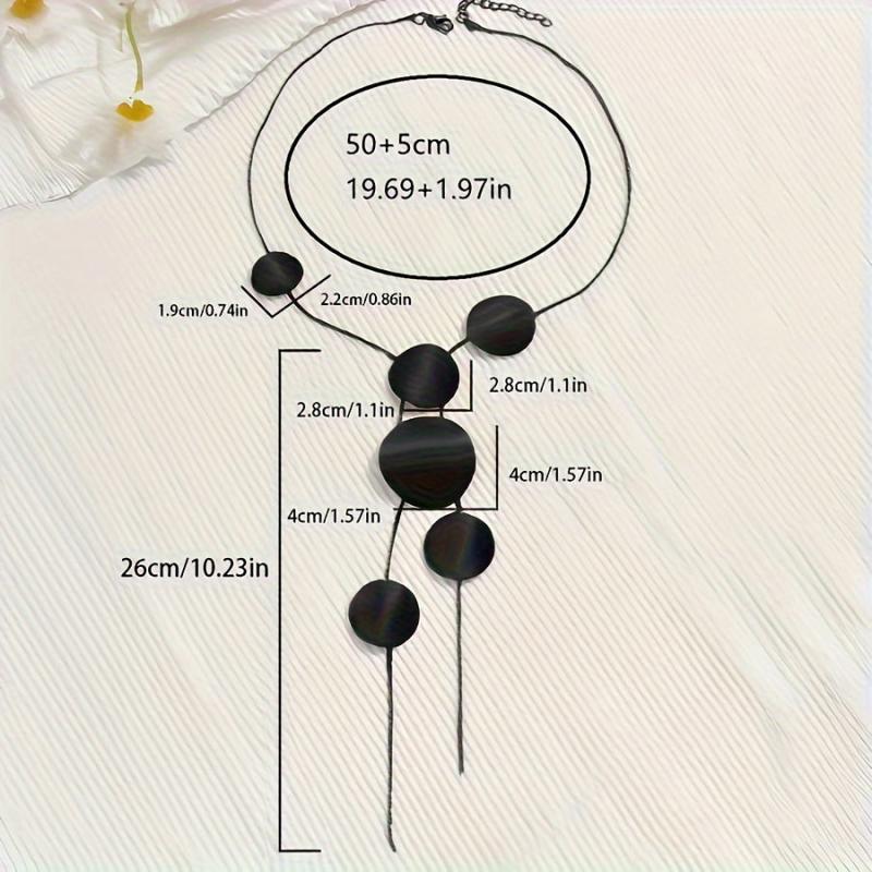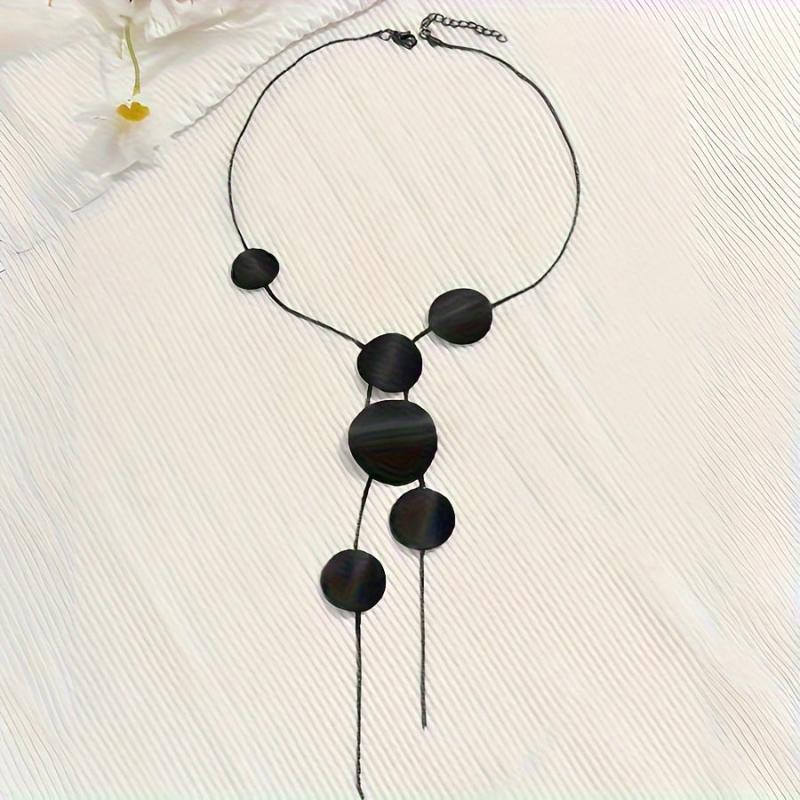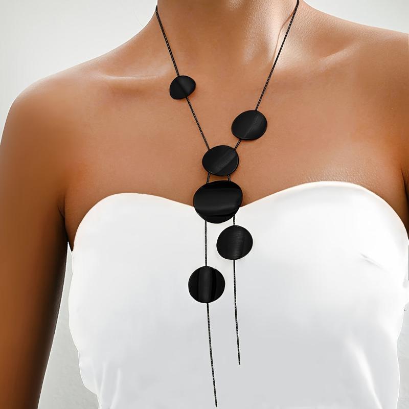 This sexy Y necklace features geometric circular iron pendants and tassel detail on an unplated long chain. Perfect for daily wear or party occasions.