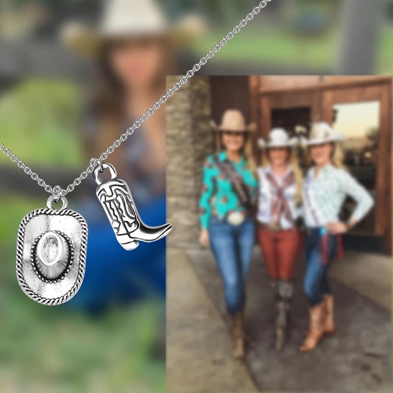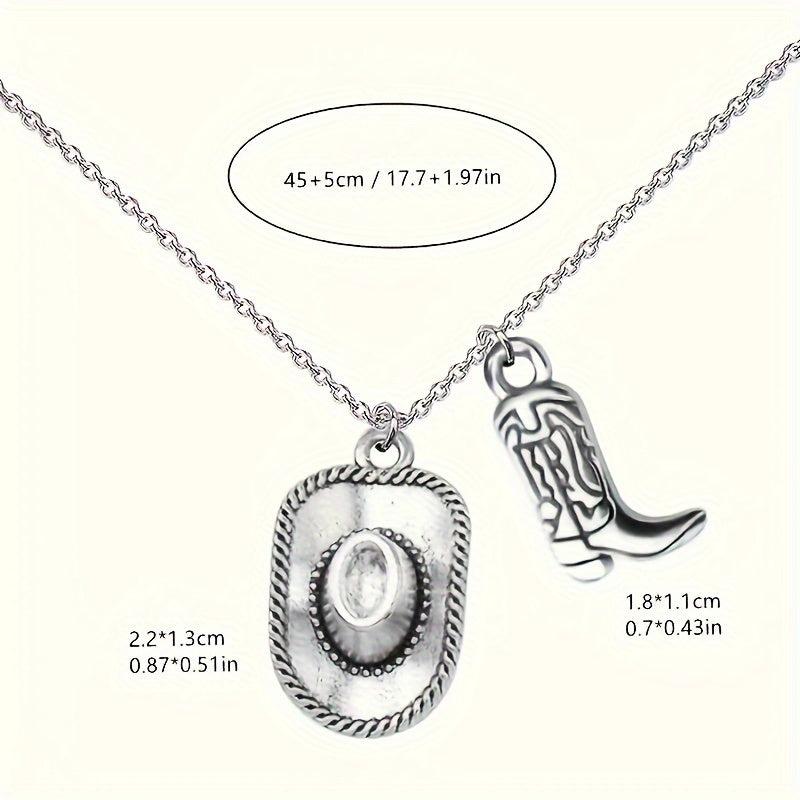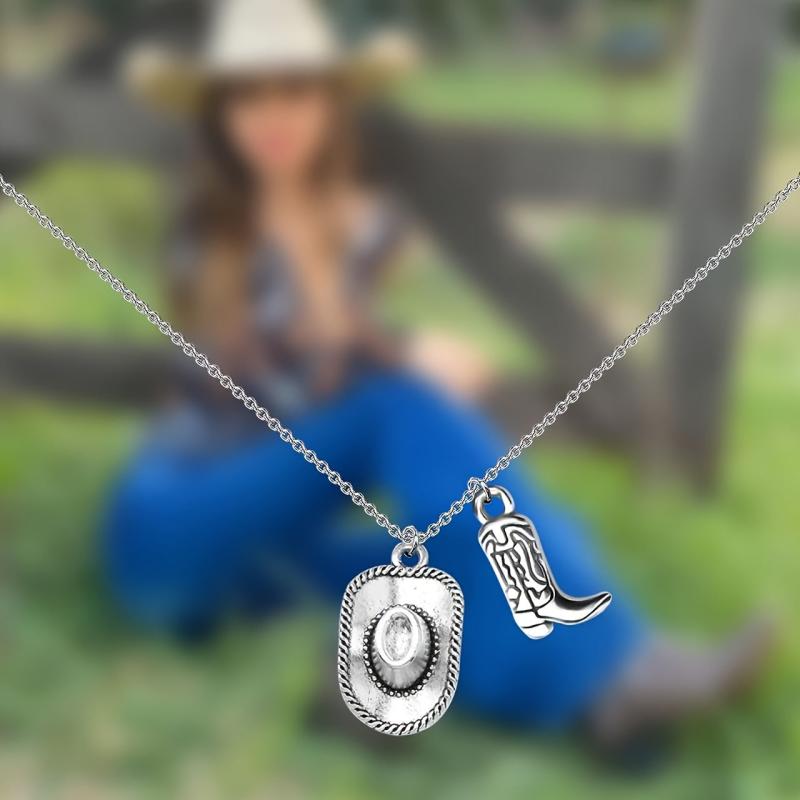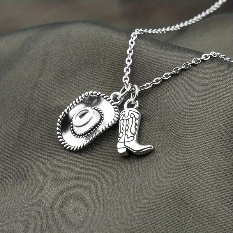 This pendant necklace features a vintage Western cowboy hat and boots design, perfect for cowgirl and cowboy enthusiasts.