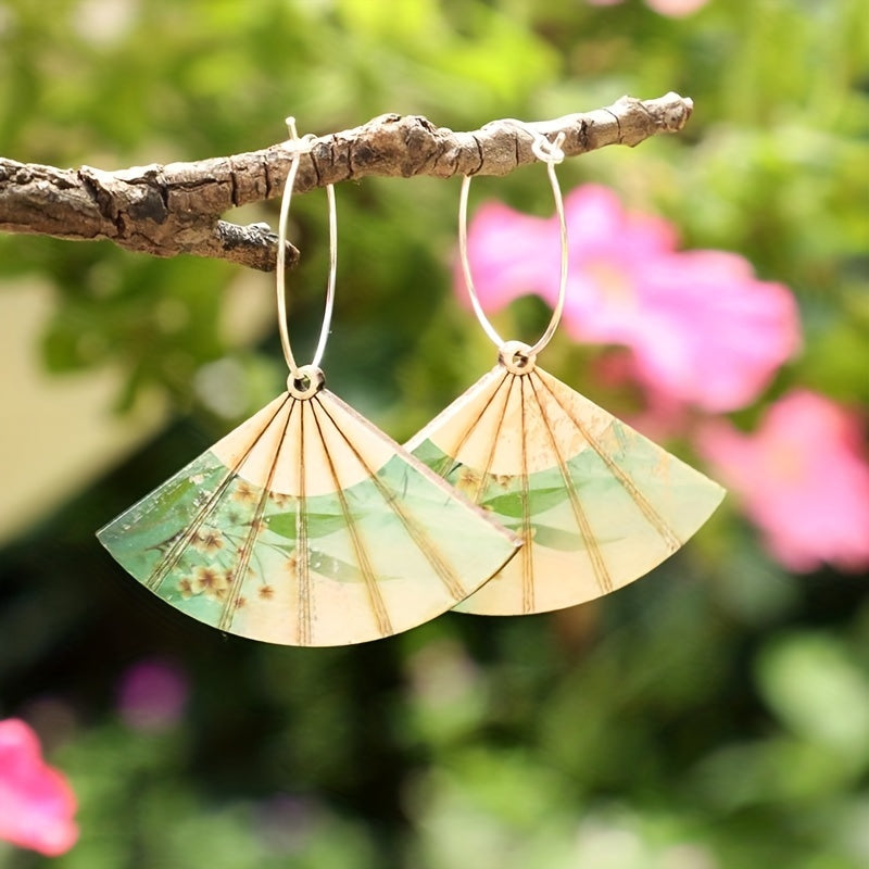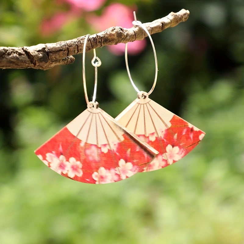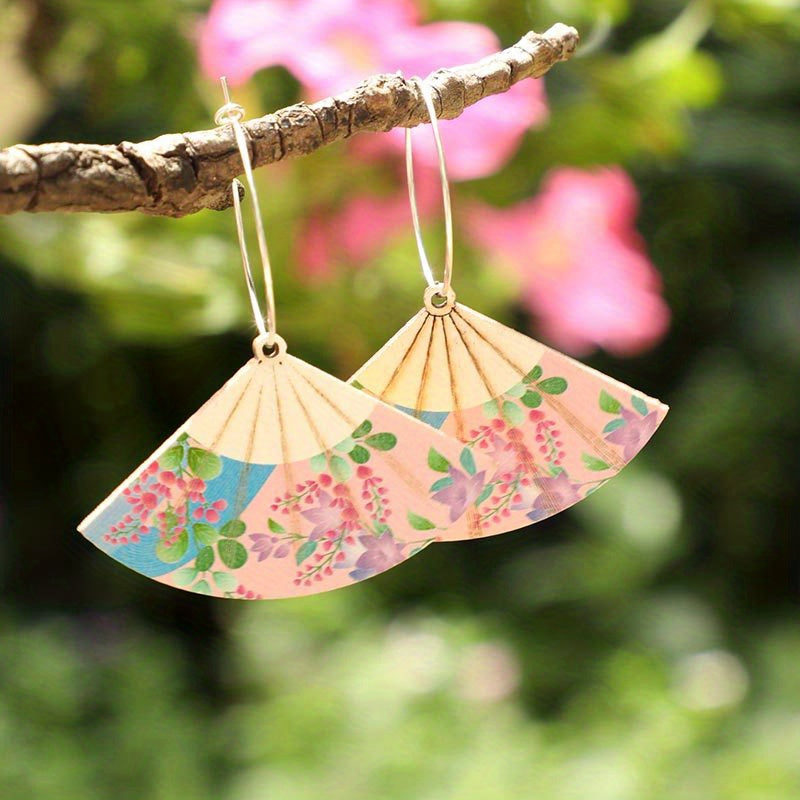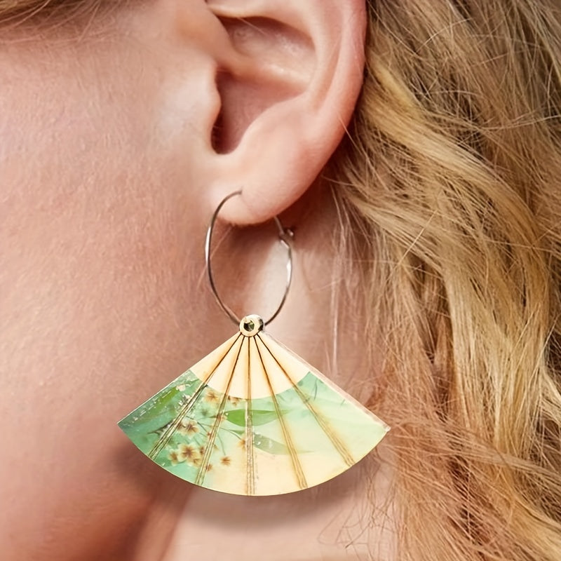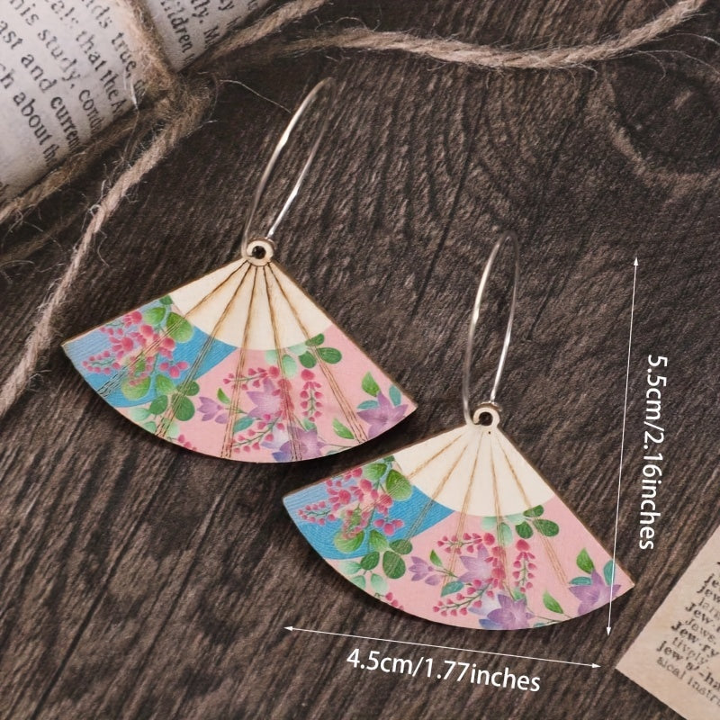 These unique earrings feature a classic fan flower pattern in a retro bohemian style. Made of wood, they add a touch of vintage charm to any outfit.