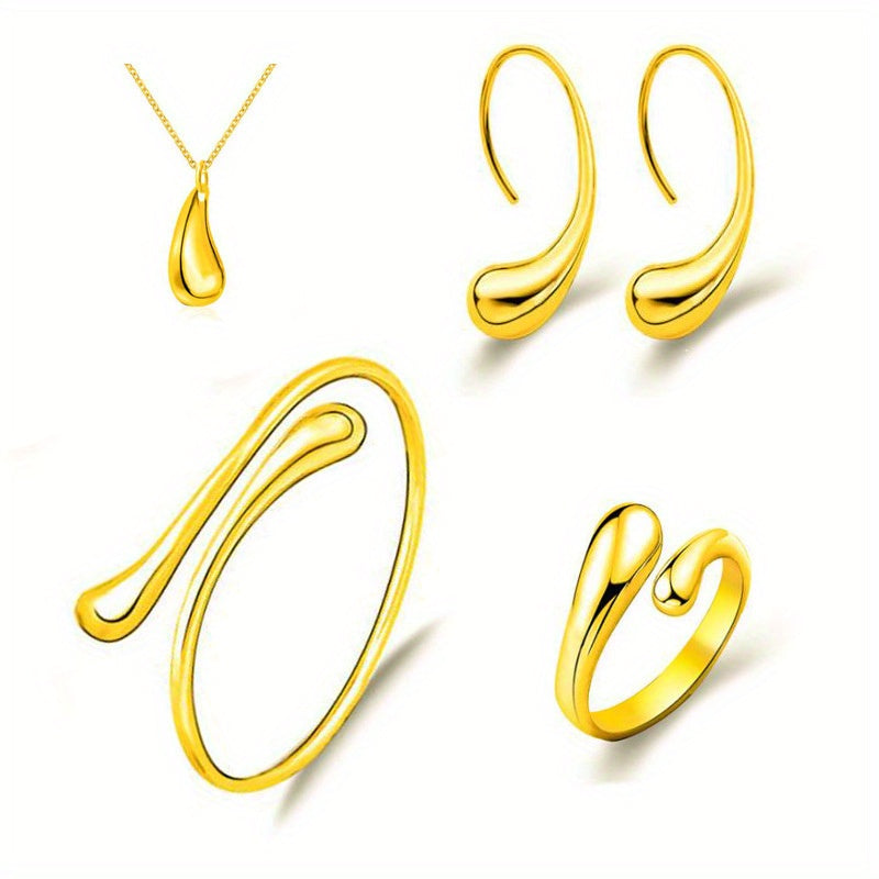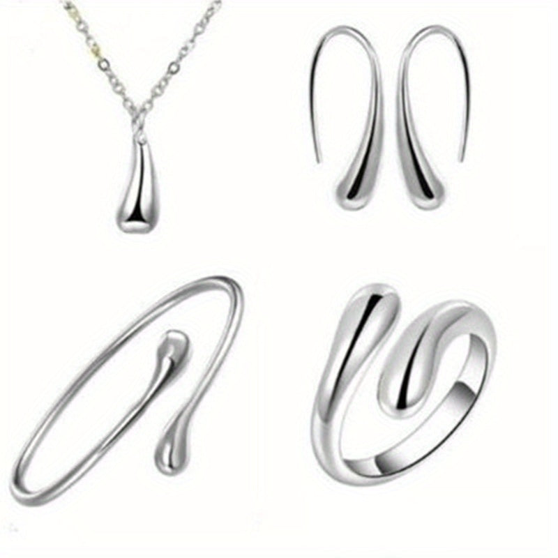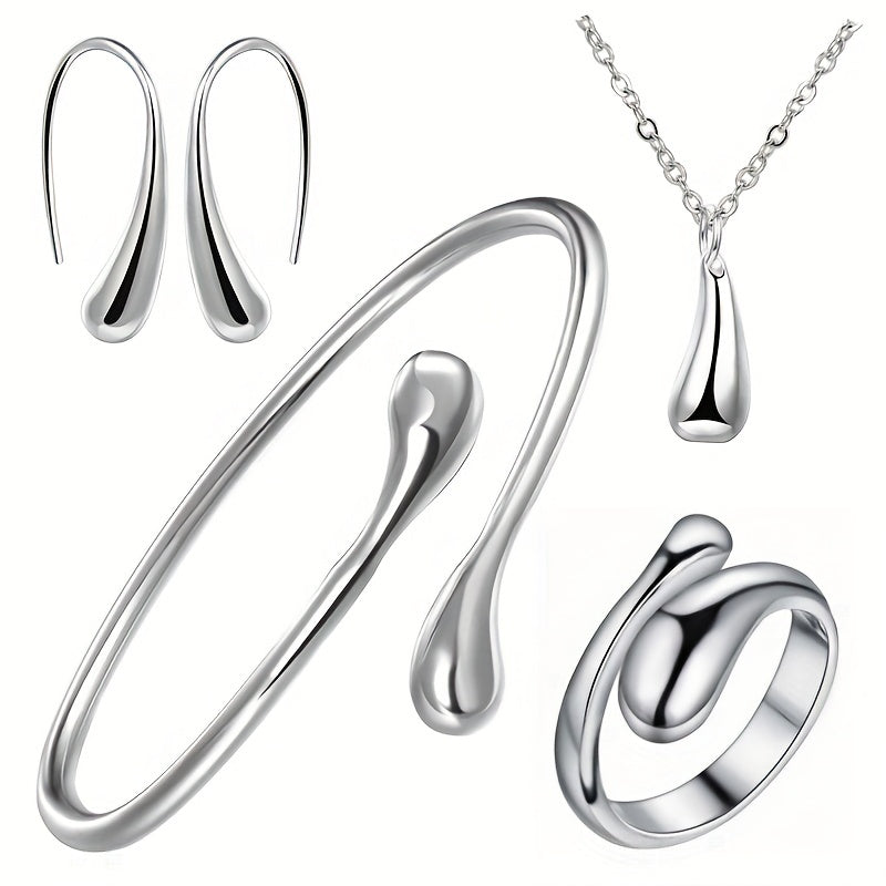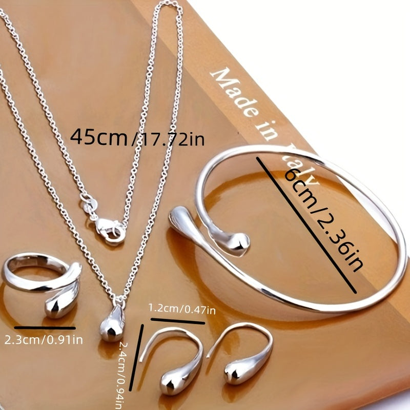 Elegant water drop jewelry set includes pendant necklace, cuff bangle bracelet, earrings, and opening finger ring. Perfect for adding a touch of sophistication to any outfit.