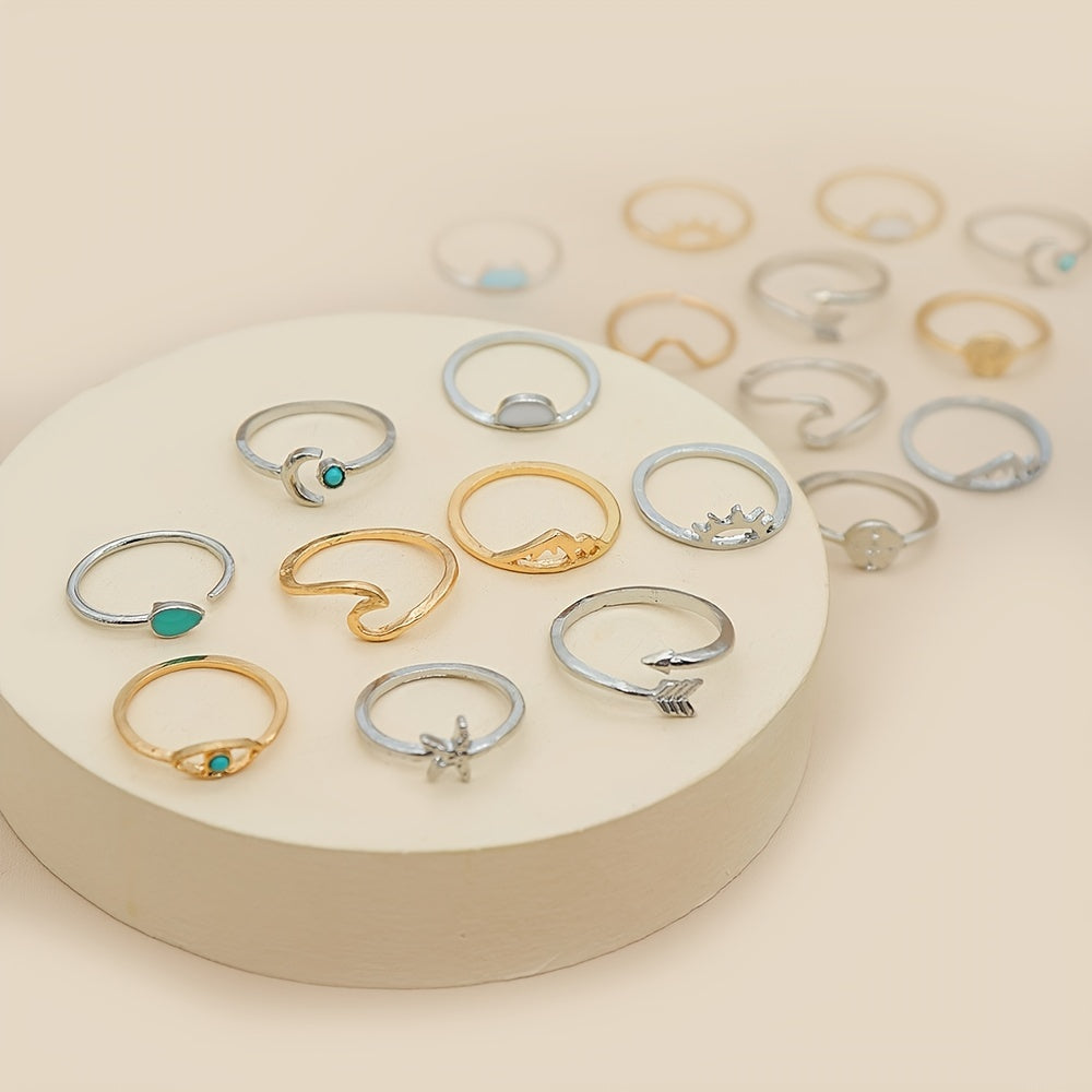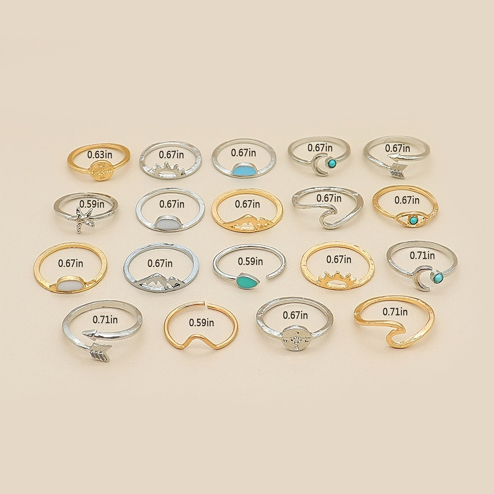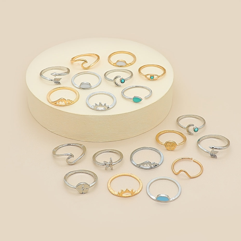 This set includes 19 silver rings with sea wave, sun, fishtail, starfish, and arrow designs. Made for women, the rings are adjustable and stylish.