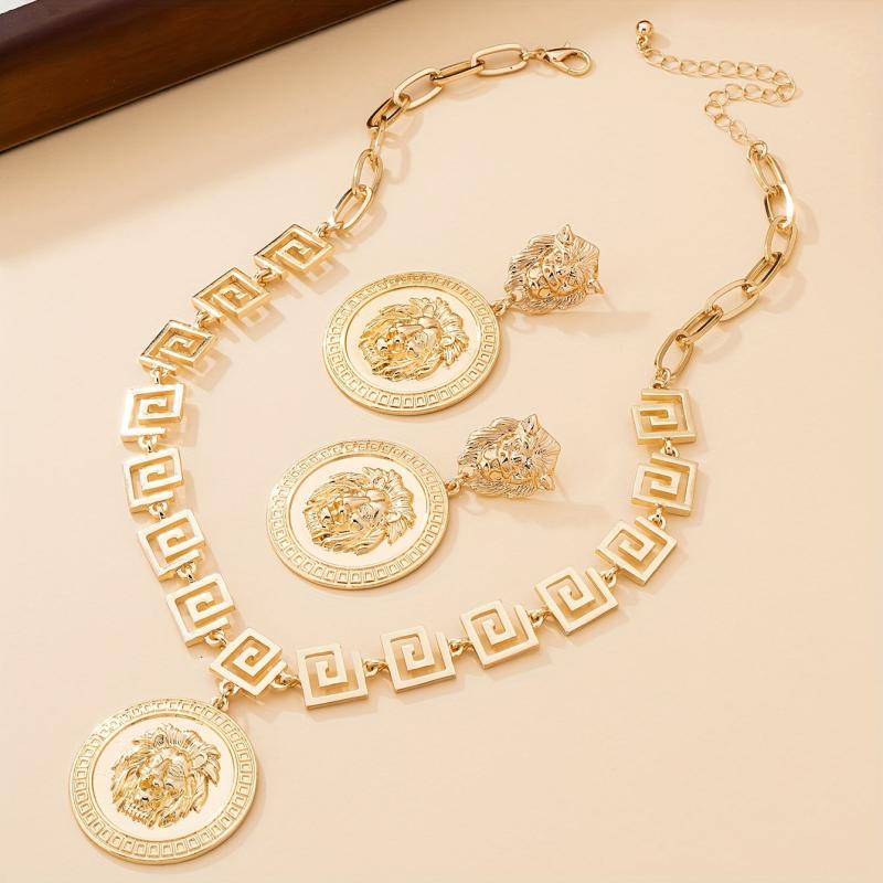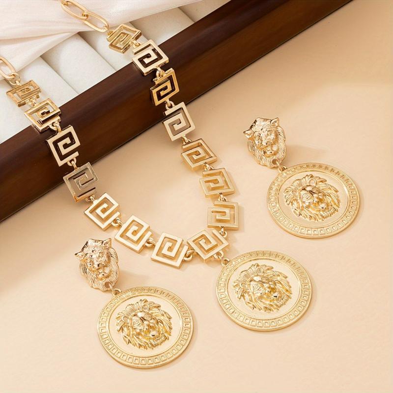 Enhance your style with this fashionable lion head pendant necklace and earrings set, perfect for women who love unique jewelry.