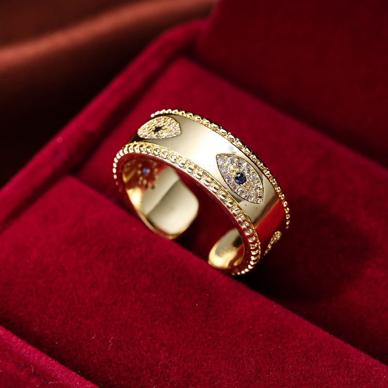 Add a touch of luck and style to your look with this stunning evil eye zircon ring. Plated in gold, this wide band finger ring is perfect for any occasion.