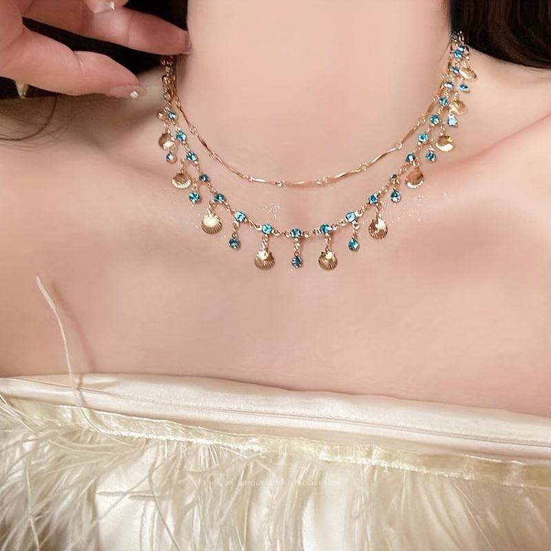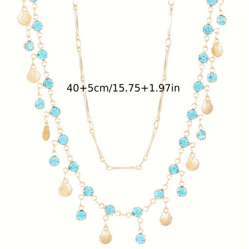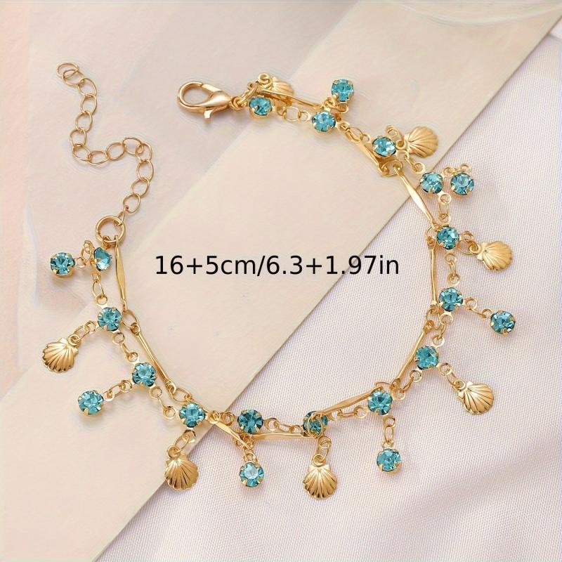 Complete your summer look with this beach accessory set featuring a golden shell necklace, bracelet, and earrings embellished with turquoise beads. A perfect gift for her!