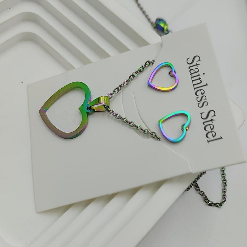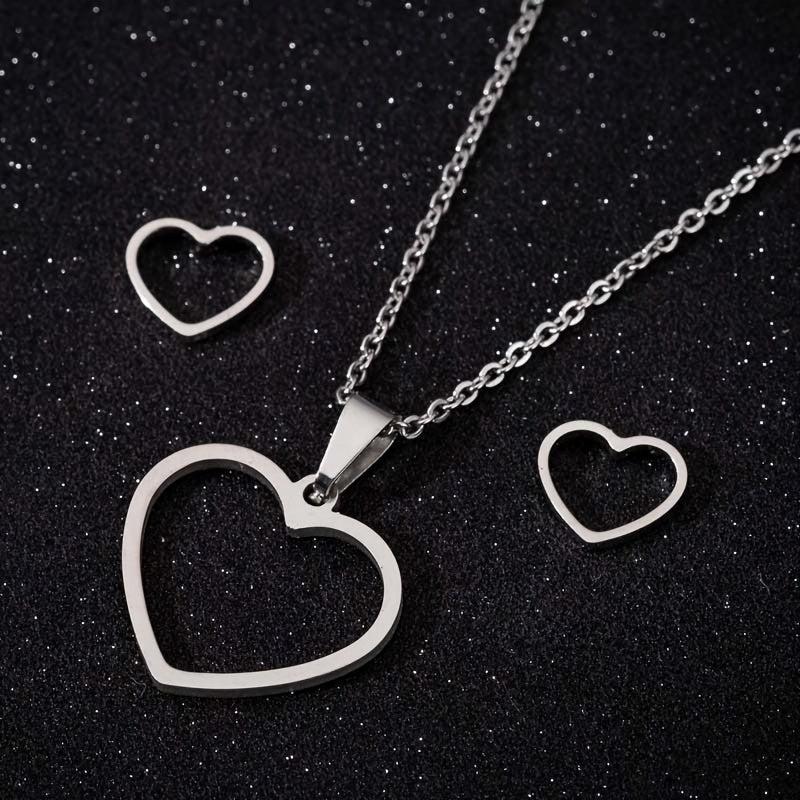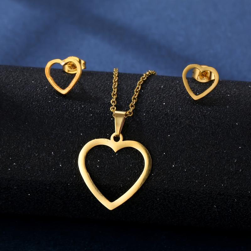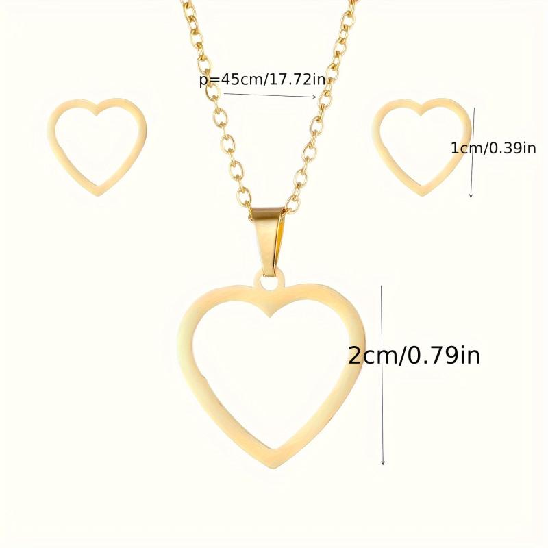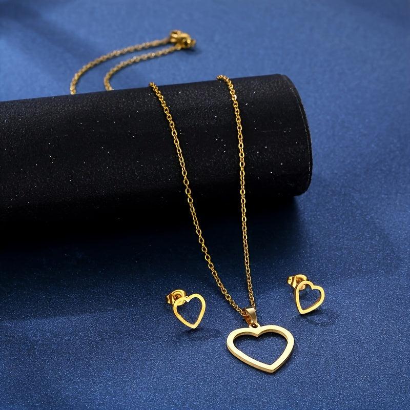 This elegant jewelry set includes a smooth pendant necklace, earrings, and collar chain made of high-quality stainless steel. The set features a stunning design with a golden love theme, perfect for adding a touch of glamour to any outfit.