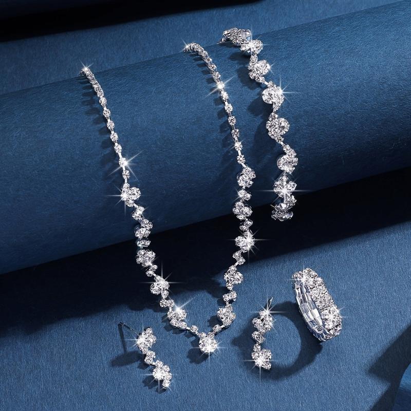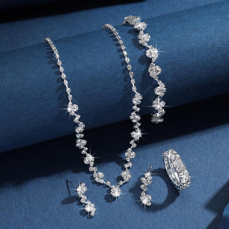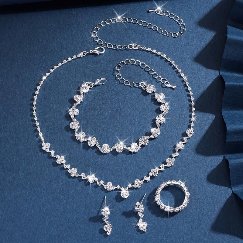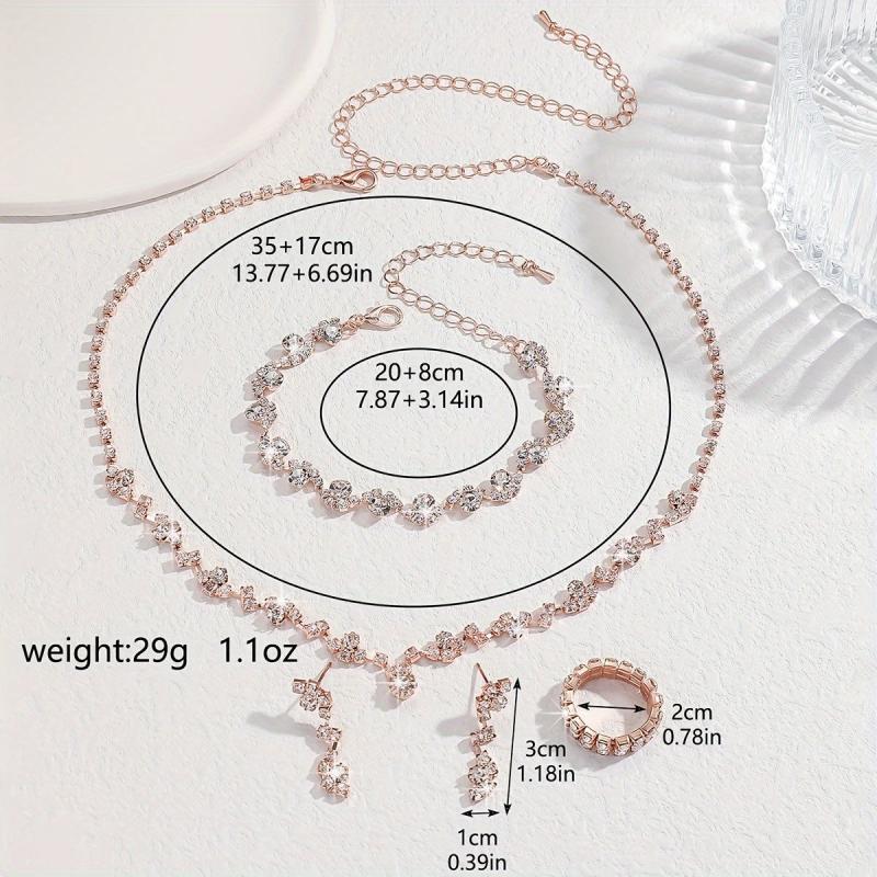 This stunning jewelry set includes a necklace, earrings, bracelet, and ring, making it a perfect gift for special occasions. The elegant design and quality craftsmanship will add a touch of sparkle to any outfit.
