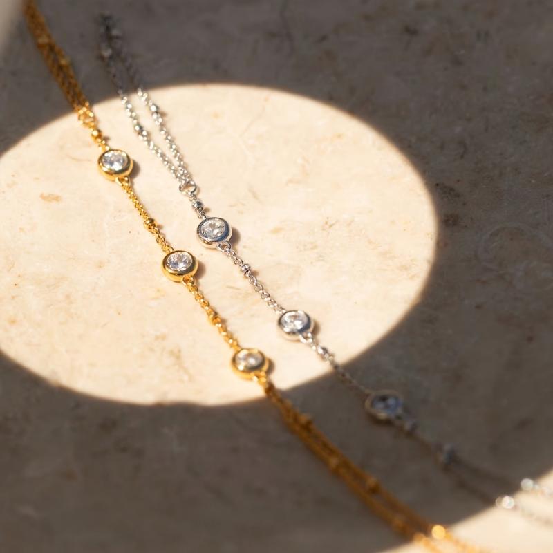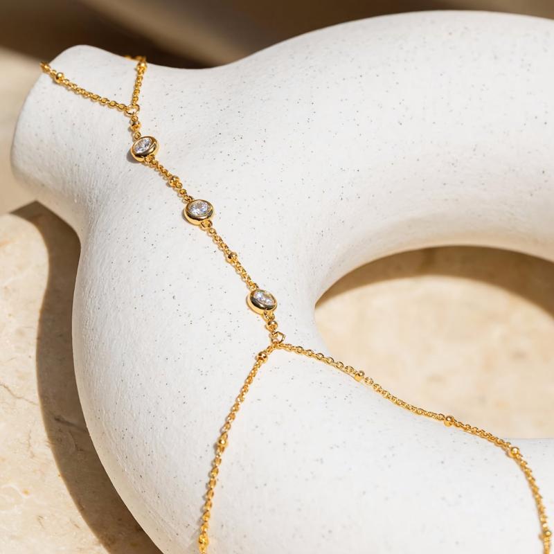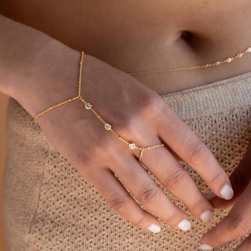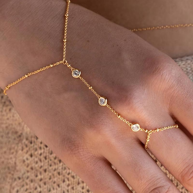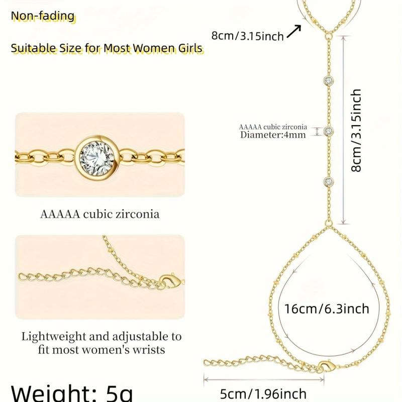 This stylish hand chain bracelet features a waterproof stainless steel strand in a golden tone, adorned with sparkling stones. Perfect for parties and vacations.
