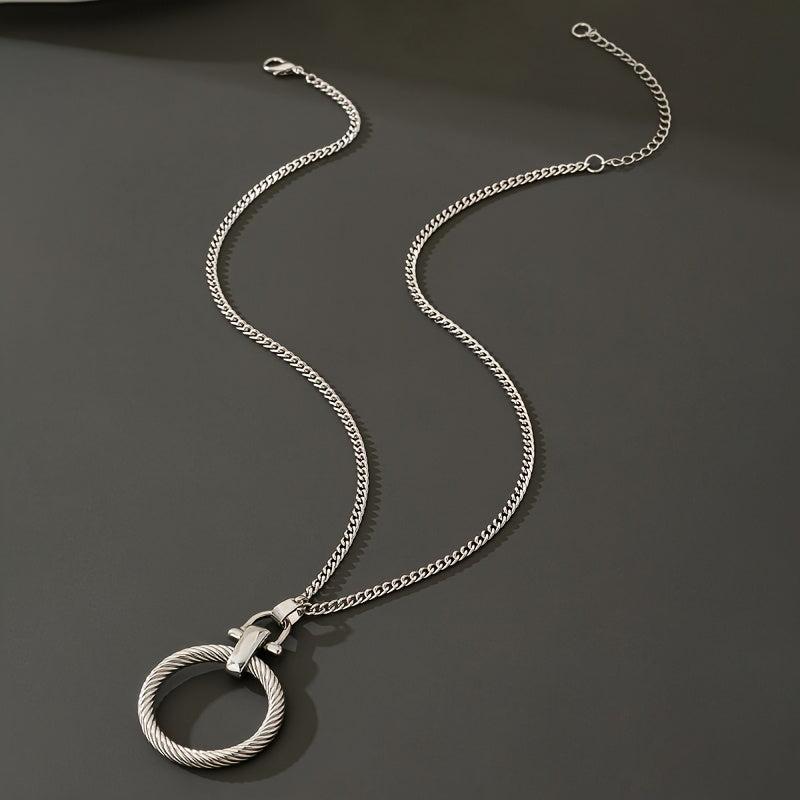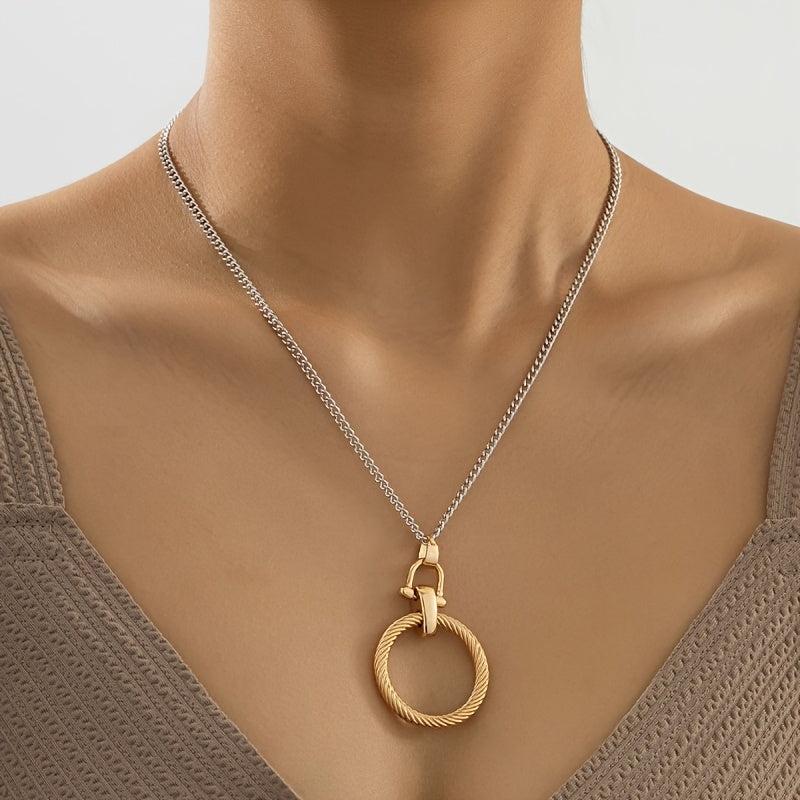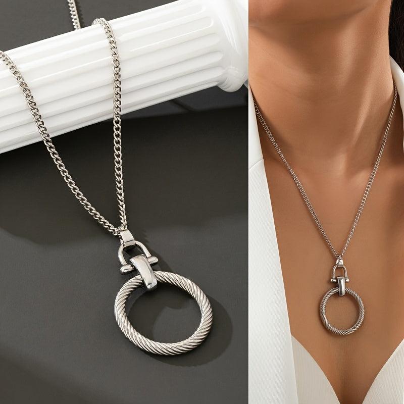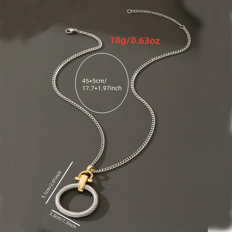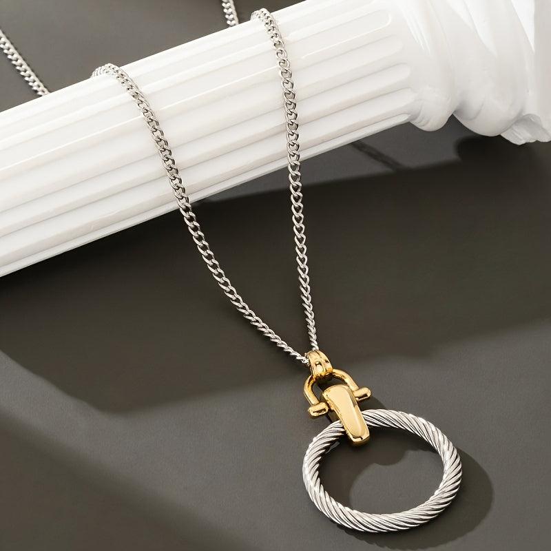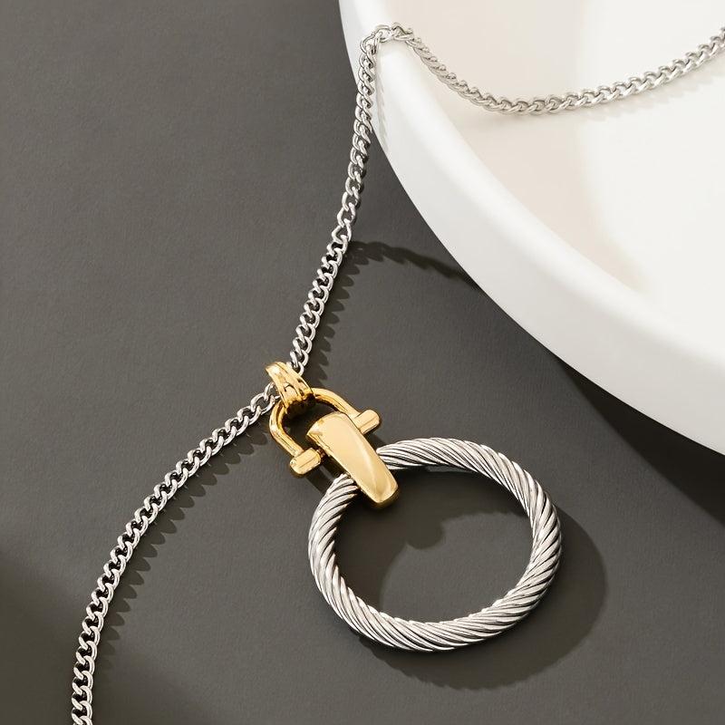 This women's necklace features a titanium steel braided chain with an interlocking circle pendant. It is durable and perfect for everyday wear or special occasions like parties. The versatile design makes it a great accessory for casual or formal outfits, ideal for the Middle Eastern style.