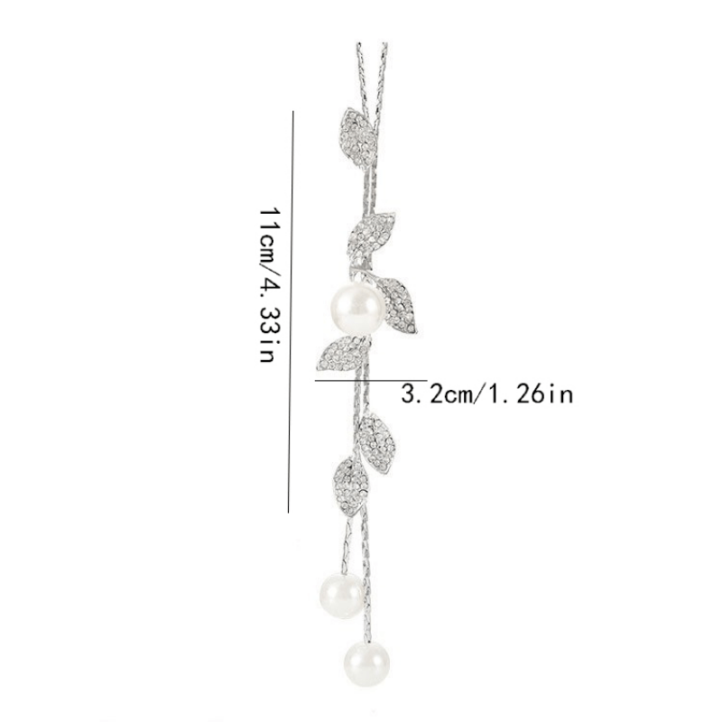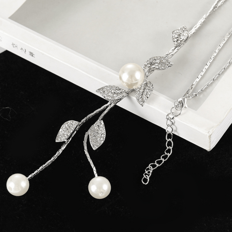 This elegant necklace features a leaf-shaped pendant adorned with rhinestones and faux pearls. It is a versatile piece that can be worn as a sweater chain or a statement necklace.