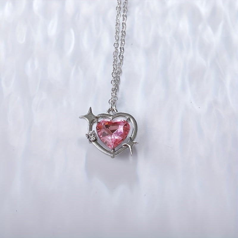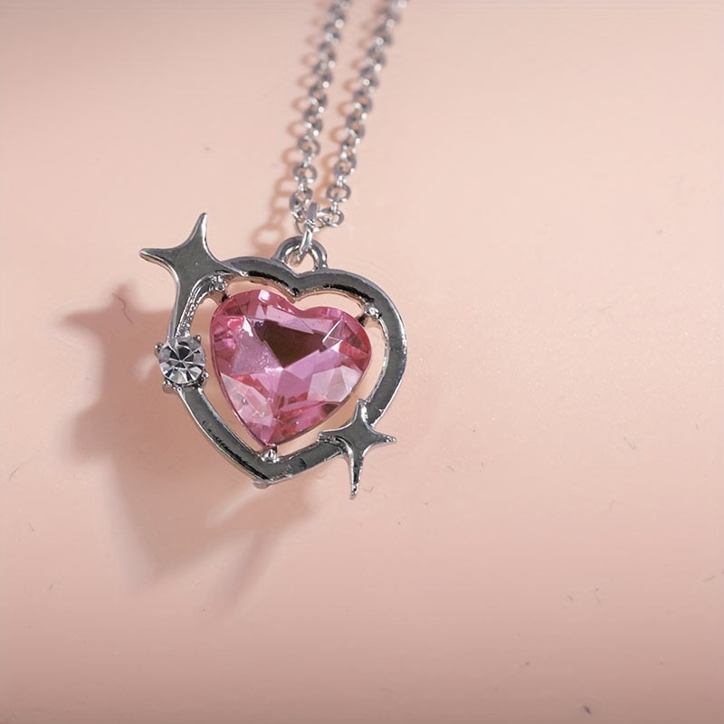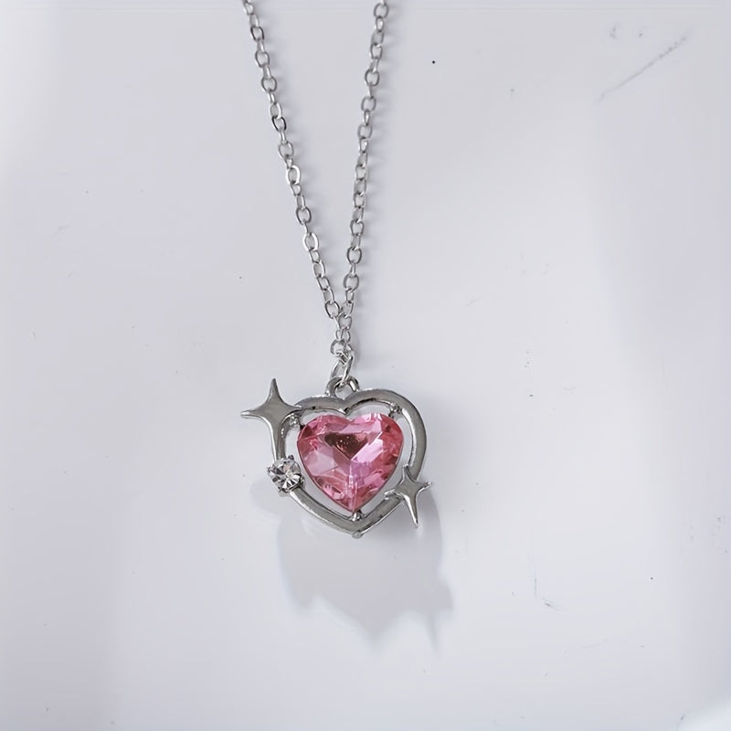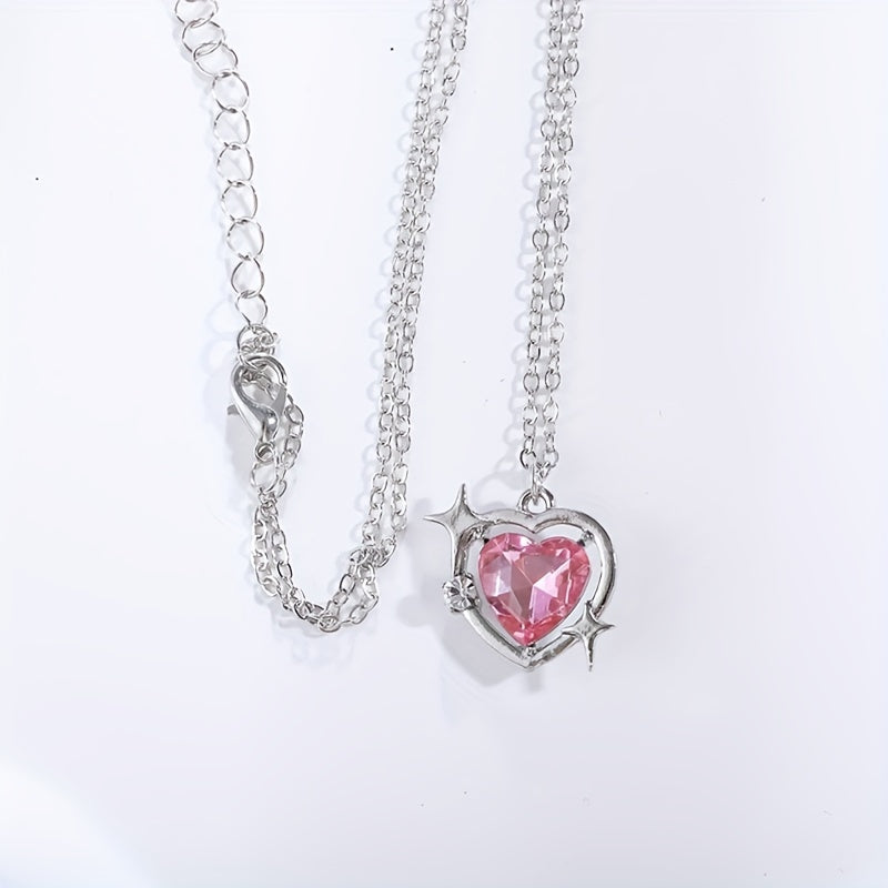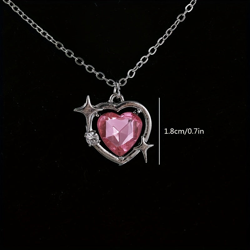Y2K Love Heart Pendant Necklace Pink Crystal Punk Clavicle Chain