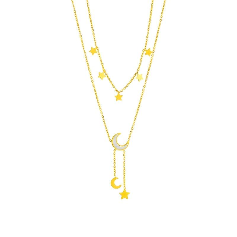 Add a touch of Y2K college style to your look with this stainless steel necklace featuring a triple star and moon pendant with tassel chain. Perfect for daily wear and parties, this durable jewelry makes a great gift.