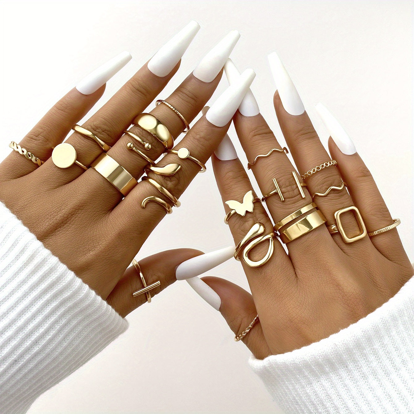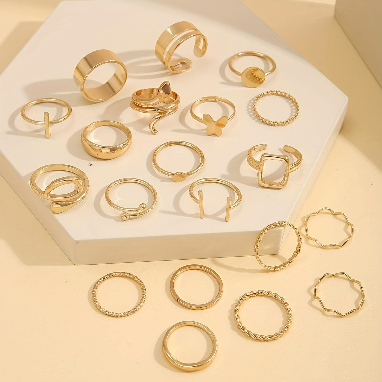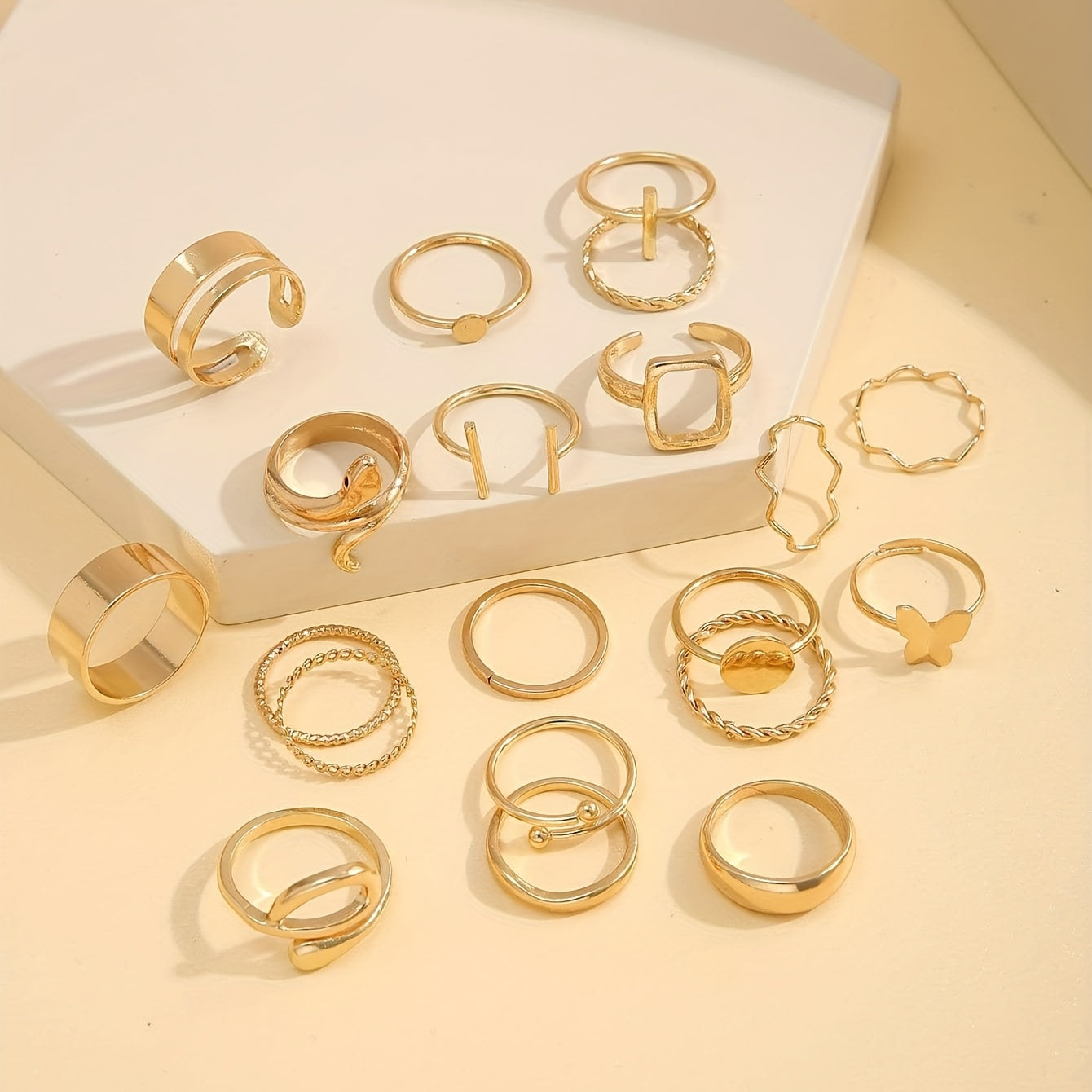 Enhance your daily outfits and party looks with this set of 20 Y2k style stacking rings featuring snake, butterfly, and cross patterns. Perfect for mixing and matching to create unique and trendy looks.