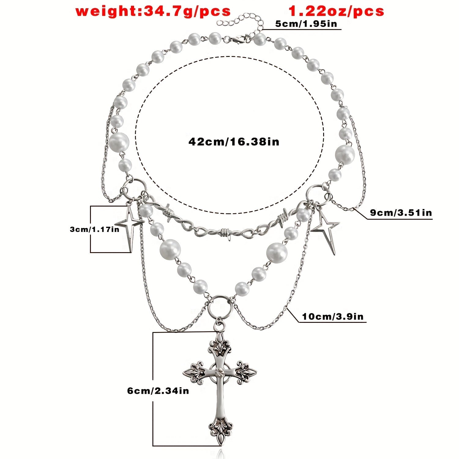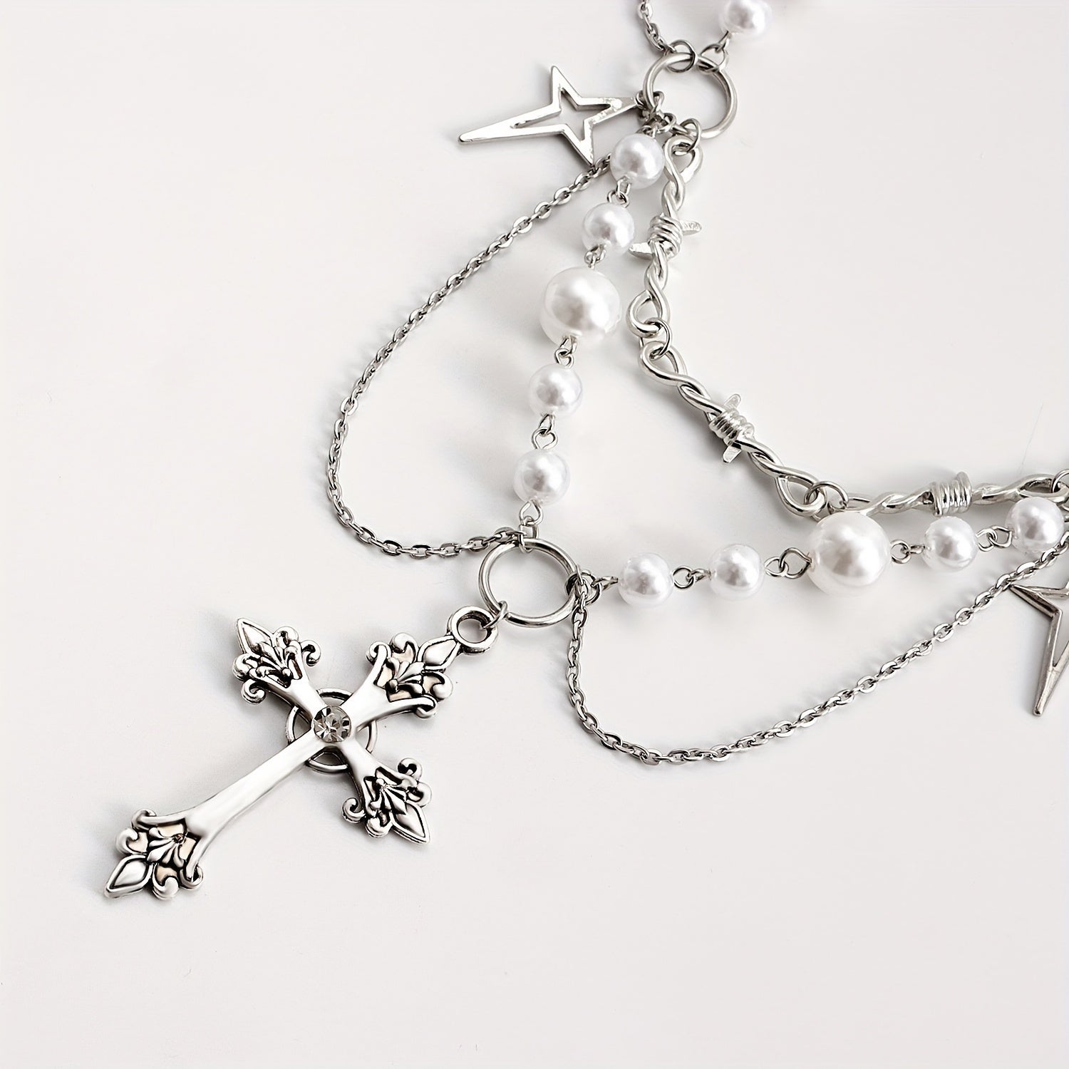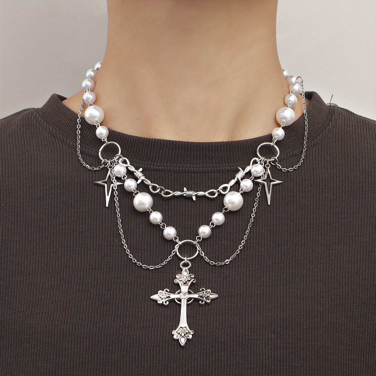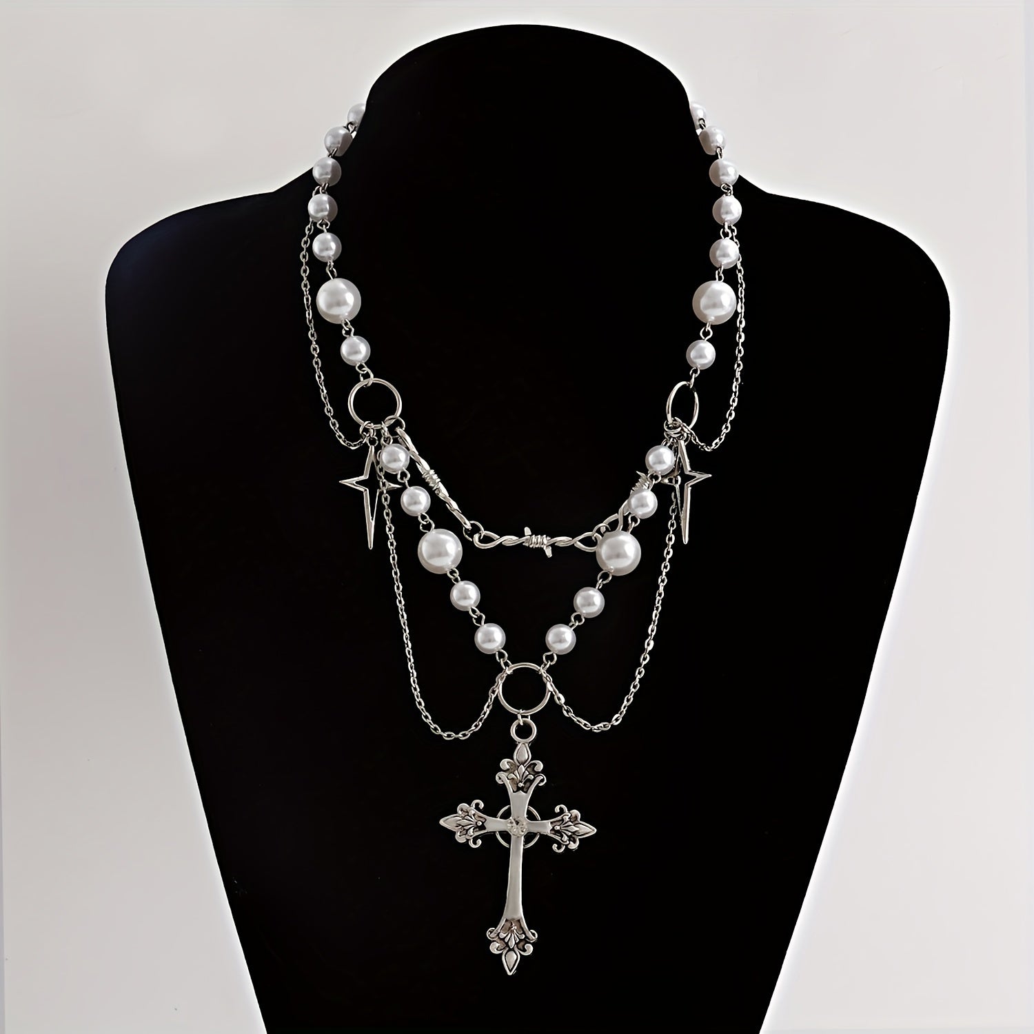 Add a touch of gothic charm with this stylish pendant necklace featuring a pearl and silvery cross design. Perfect for expressing love and faith.