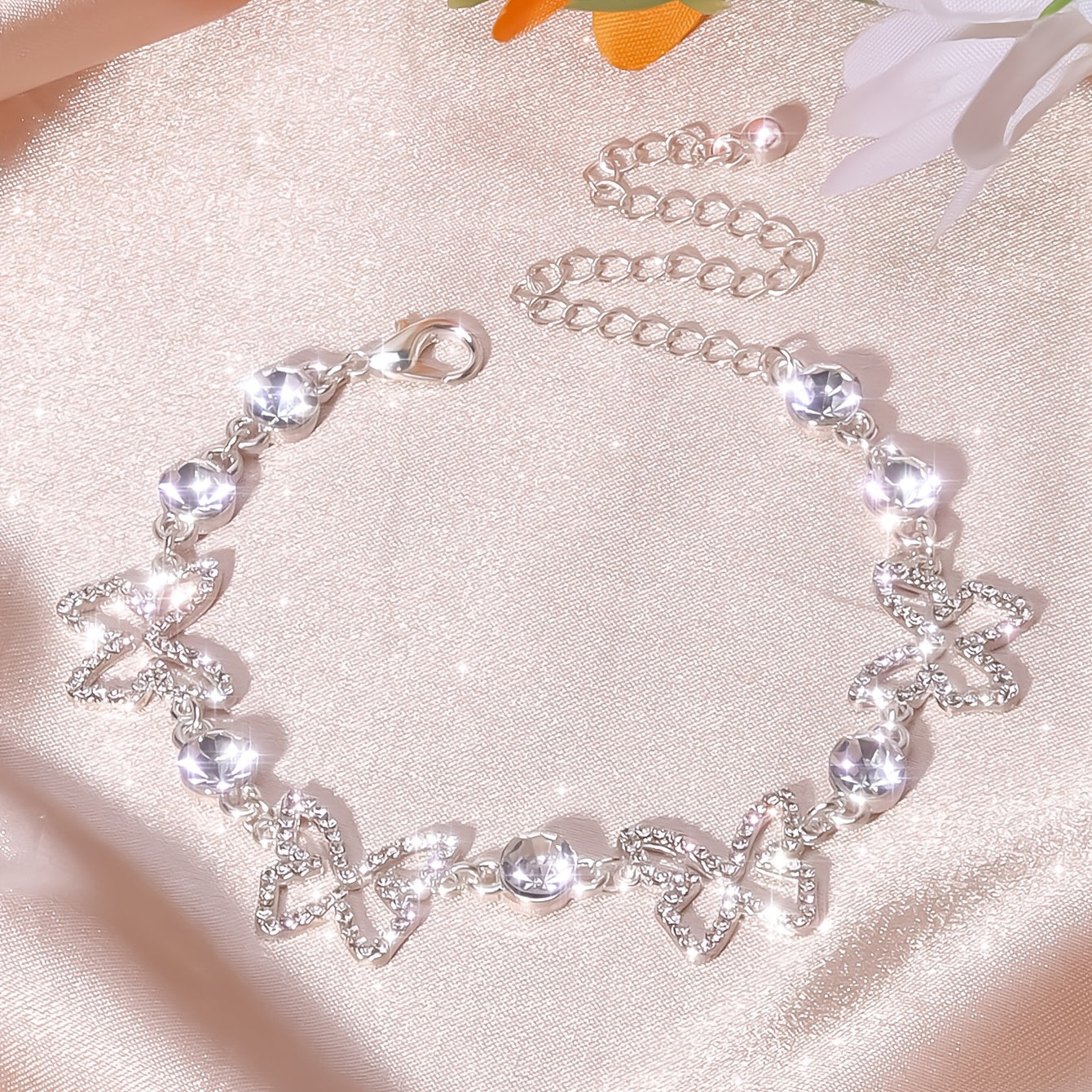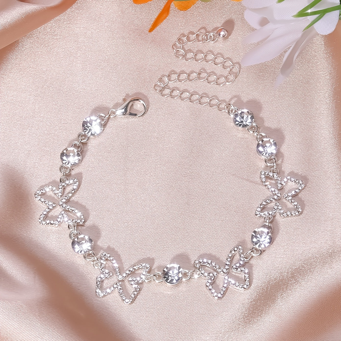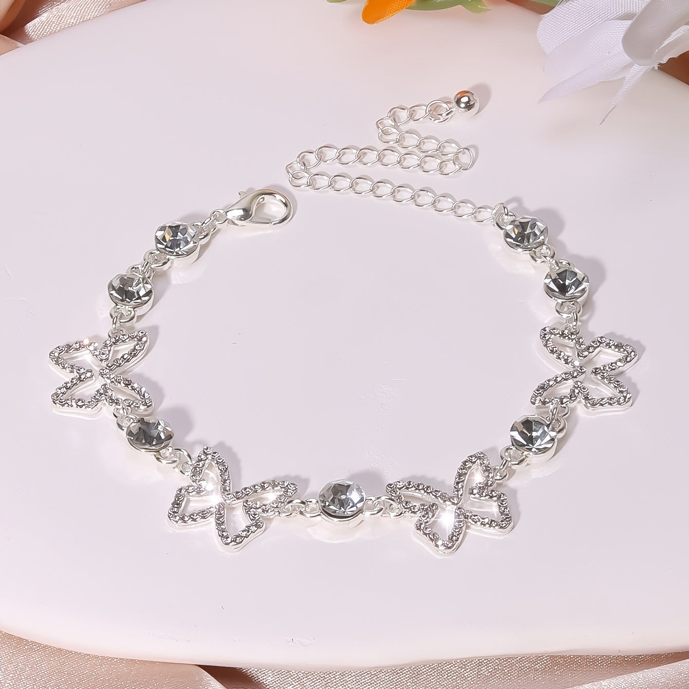 This elegant zircon chain bracelet features a hollow butterfly shape design with sparkling beads. It is adjustable to fit different wrist sizes, making it ideal for weddings or special occasions. Add a touch of glamour with this crystal jewelry piece.