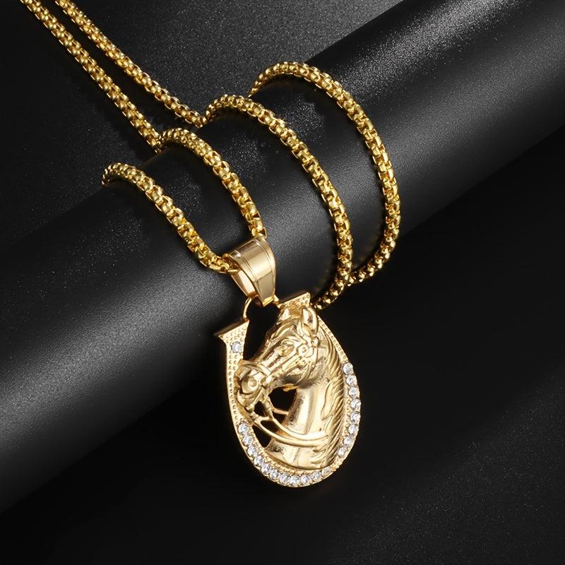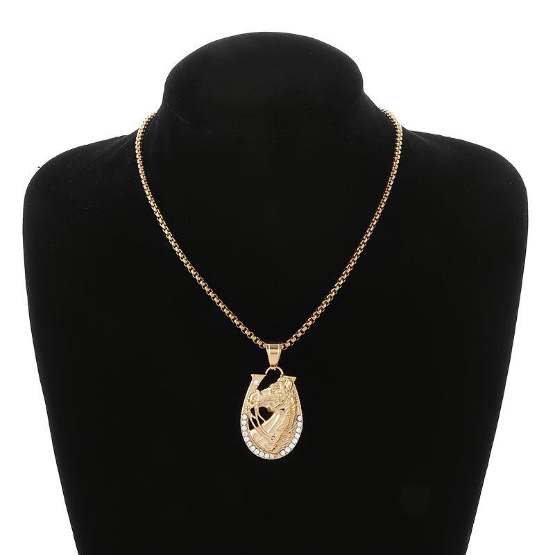 Make a statement with this unique horse head horseshoe pendant necklace. Perfect for hip hop and rock themed parties. Show off your personality with this eye-catching piece of jewelry.