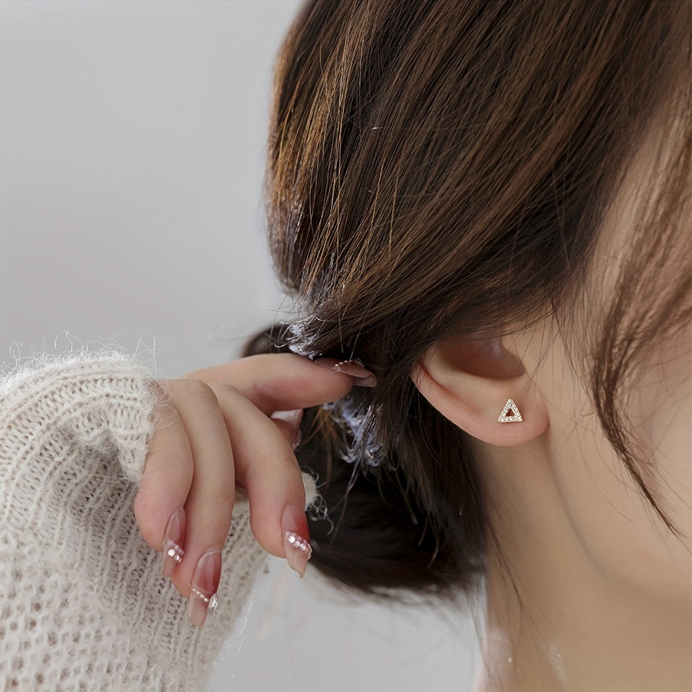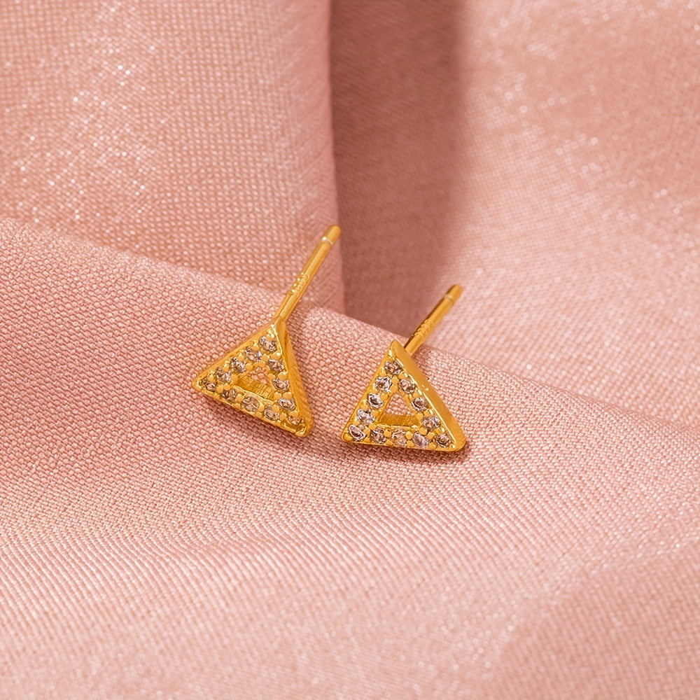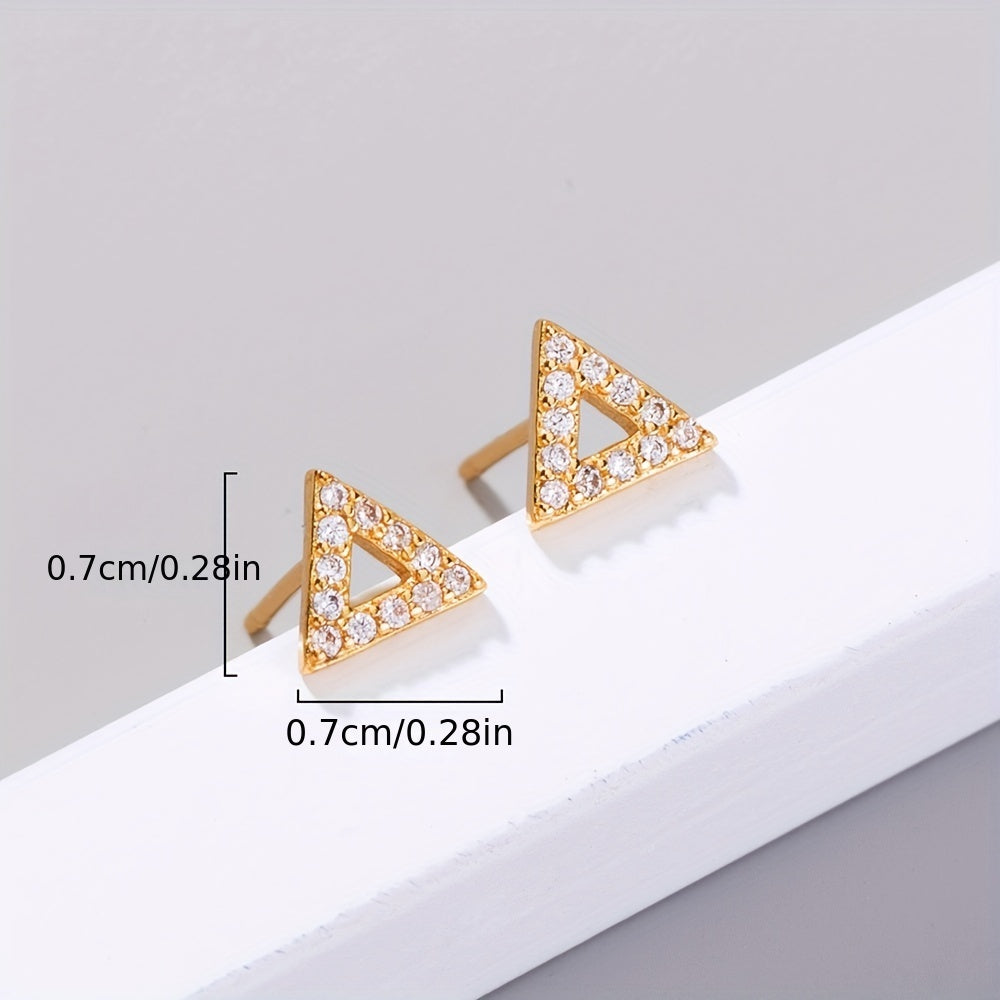 These minimalist style stud earrings feature sparkling zircon inlays on triangle round design. Perfect gift for females.