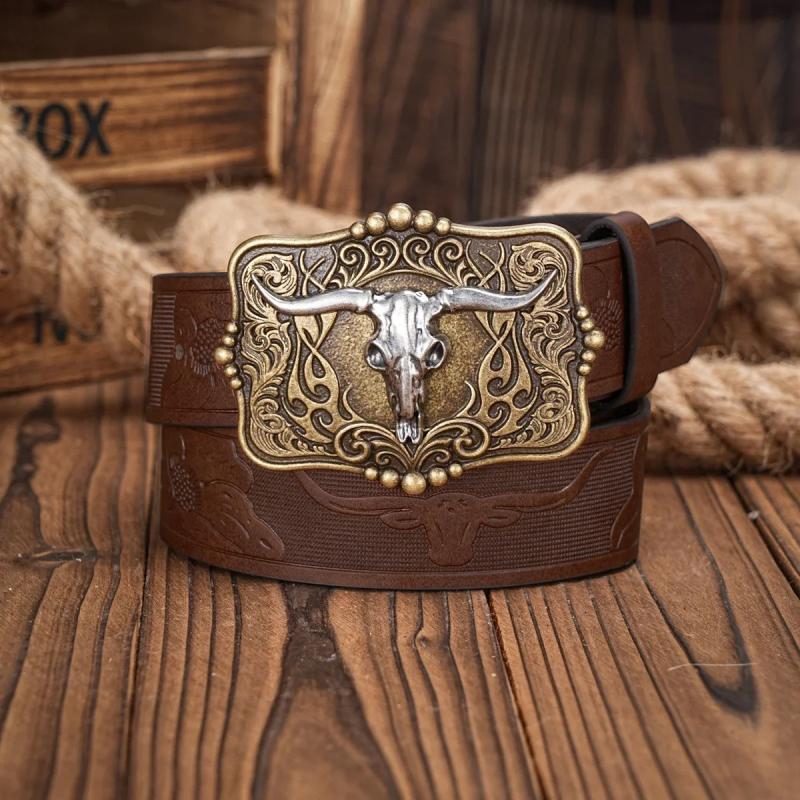 Unisex belt featuring a unique Western cowboy design with a bull skull and floral carving on brown faux leather. Perfect accessory for men and women to elevate their jeans and casual outfits.