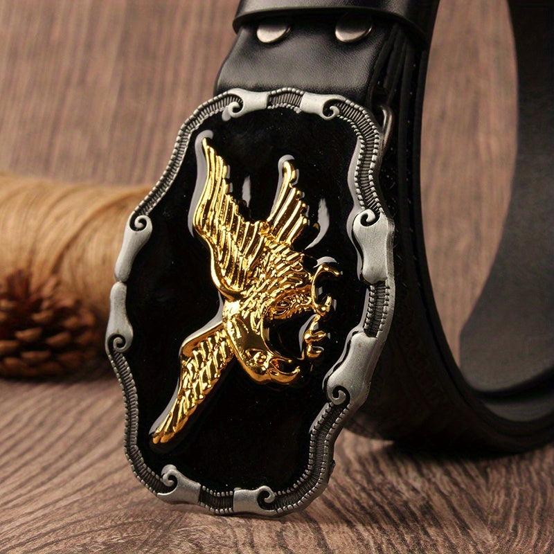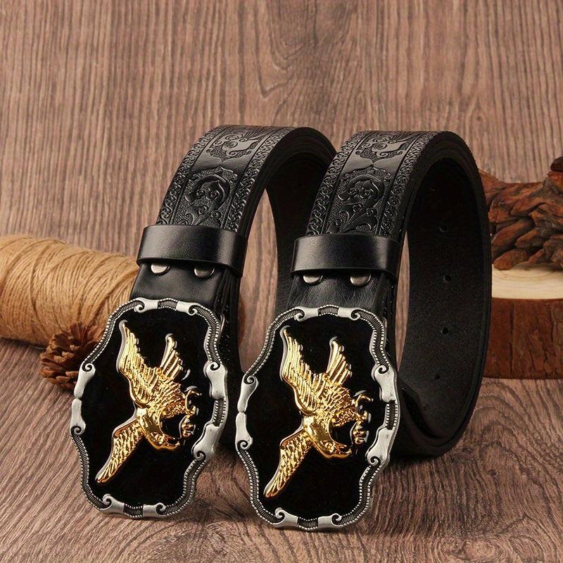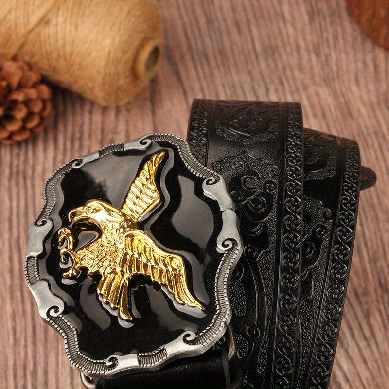This men's and women's Western belt features a faux leather strap with a golden tone eagle floral engraved buckle. It is perfect for jeans, casual, and formal outfits.