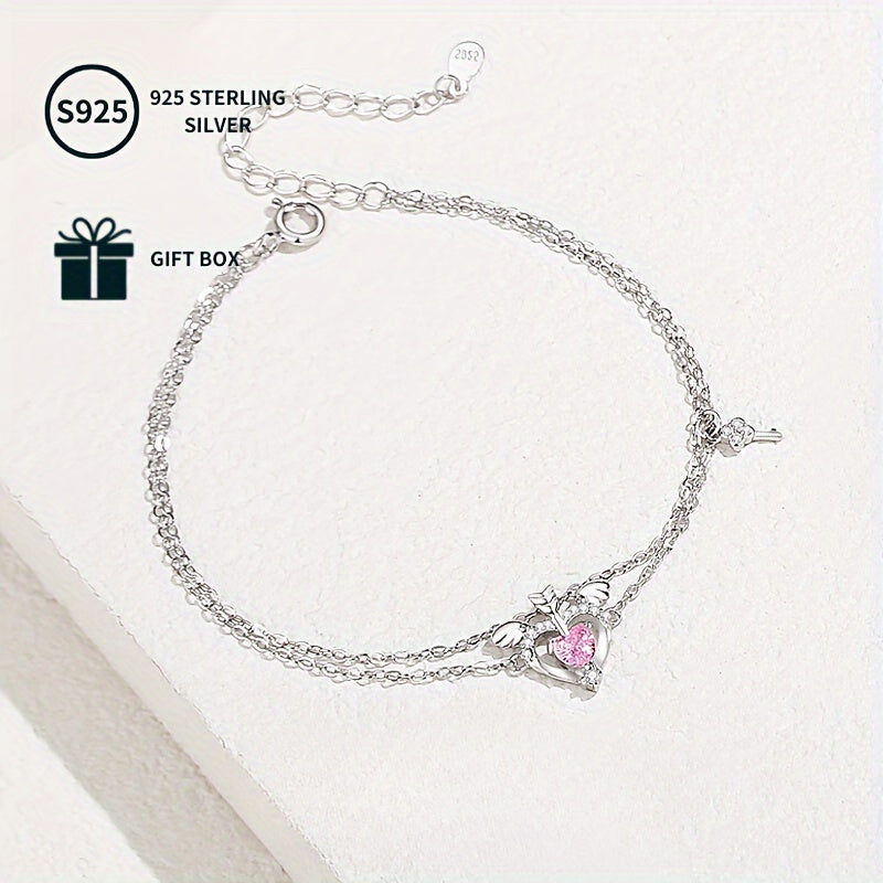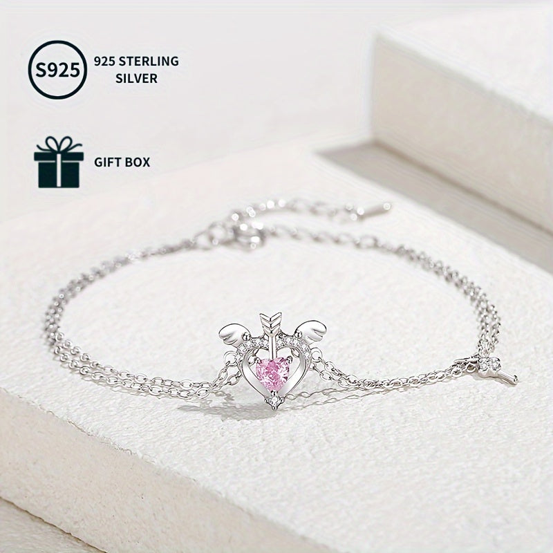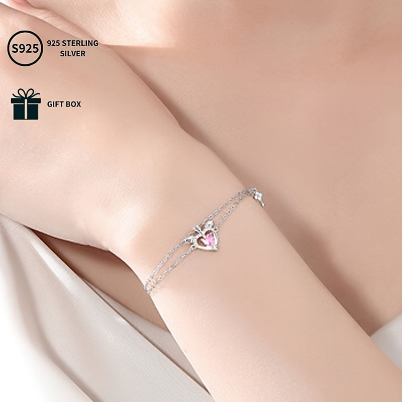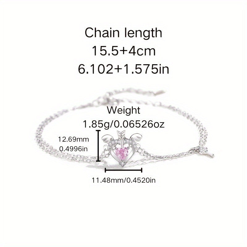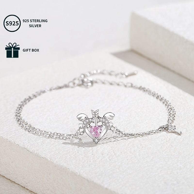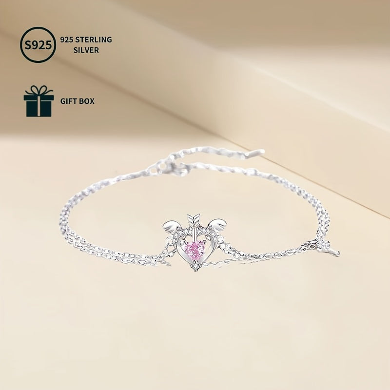 This double layer angel bracelet in sterling silver is perfect for everyday wear, family gatherings, and music festivals. Featuring pink cubic zirconia stones, it adds a touch of elegance to any outfit.