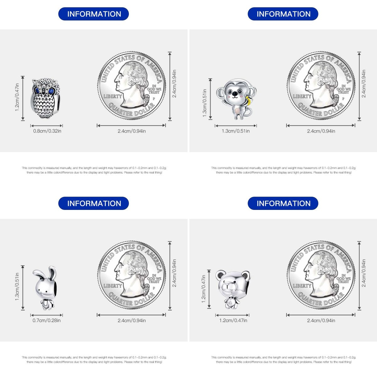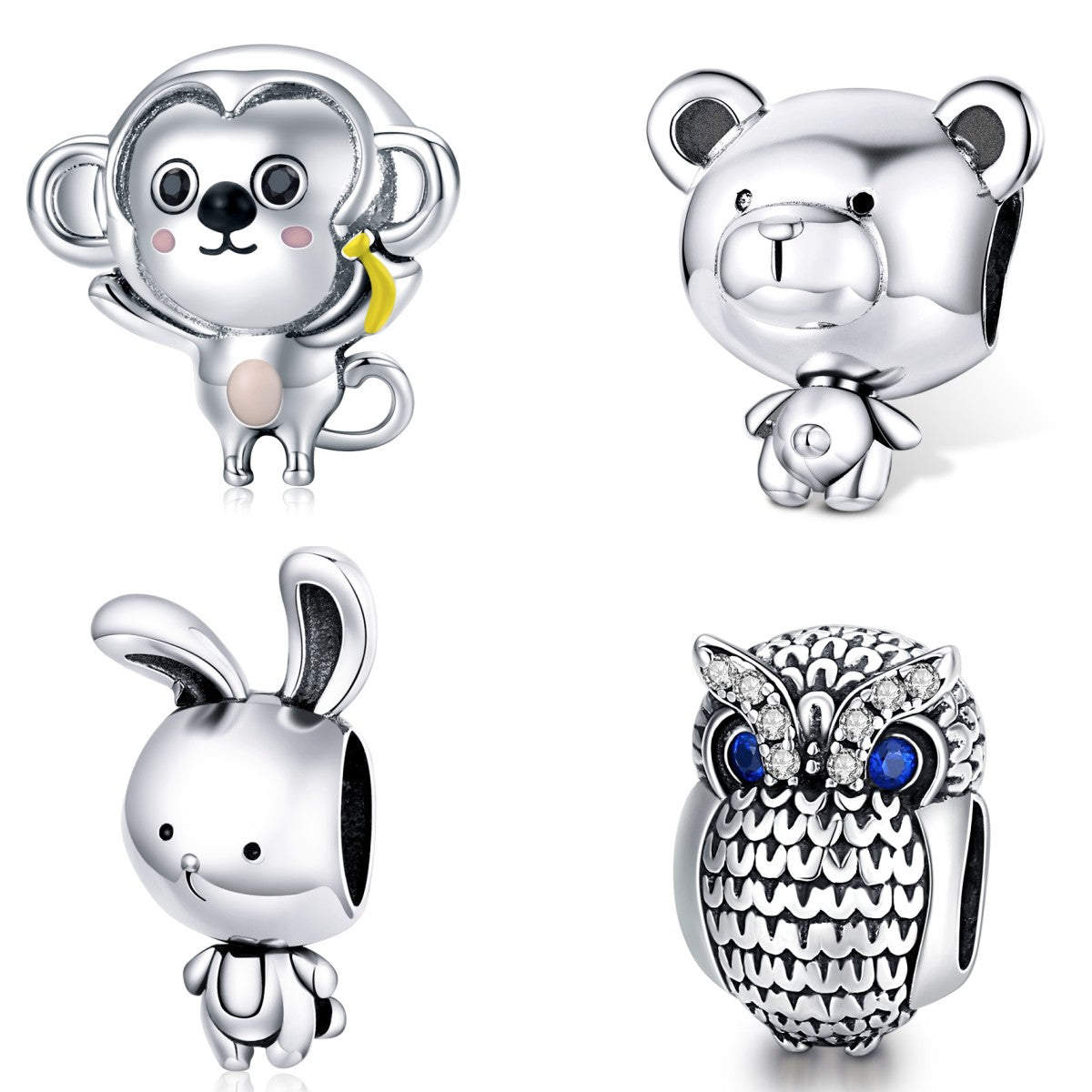 Adorable bear, rabbit, monkey, and owl charms made of 925 sterling silver. Perfect for bracelets and necklaces.