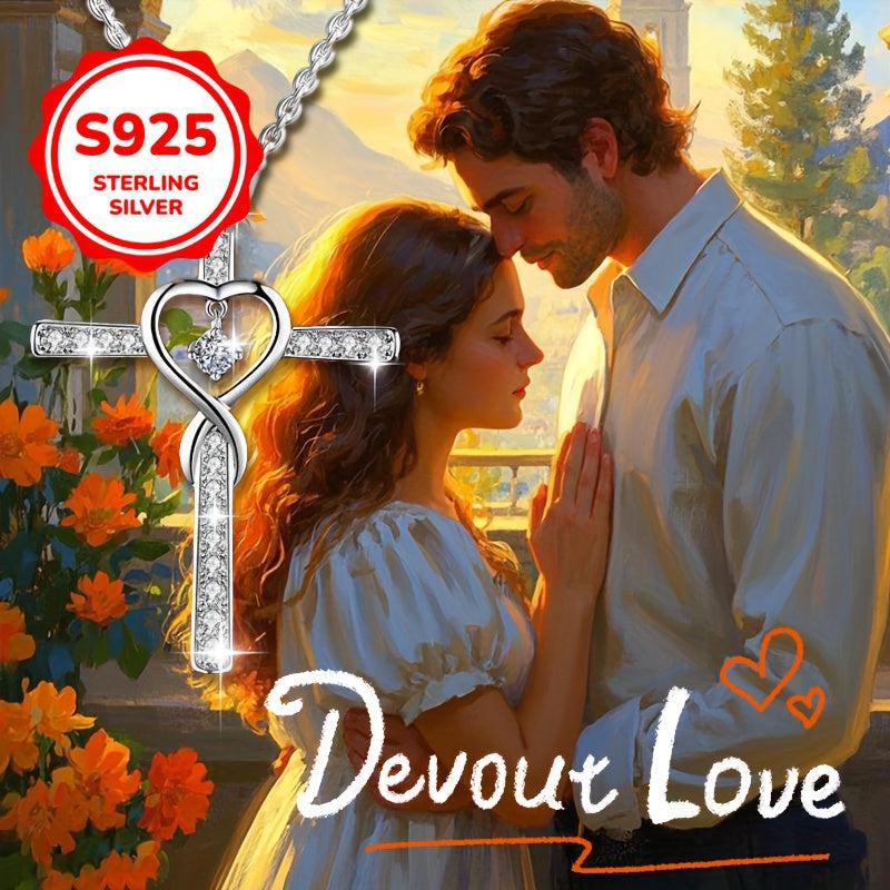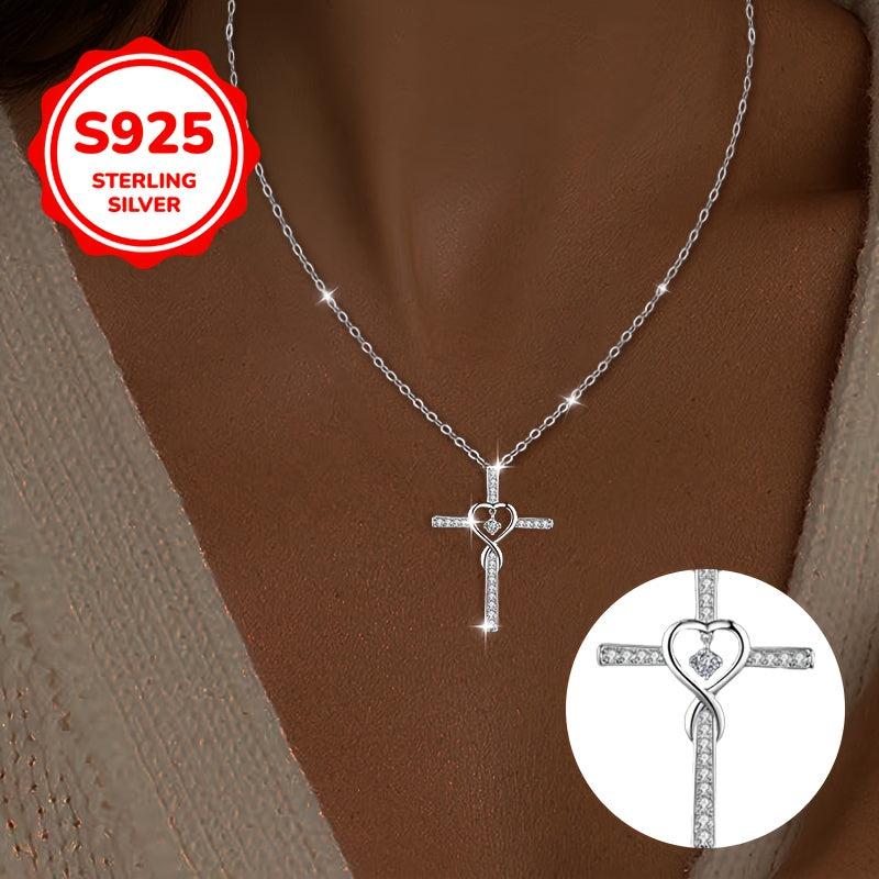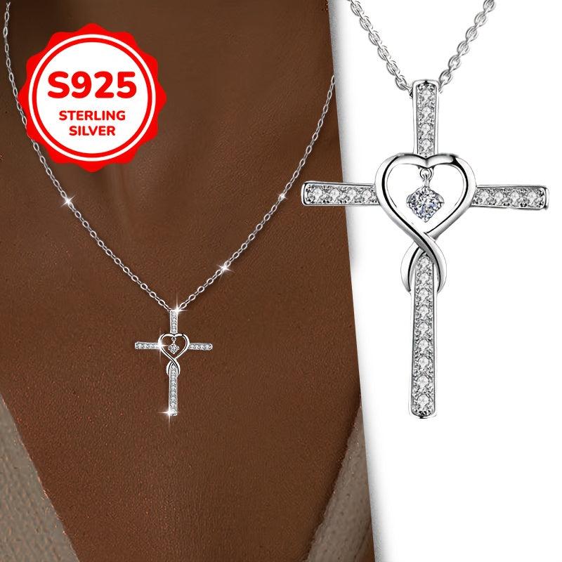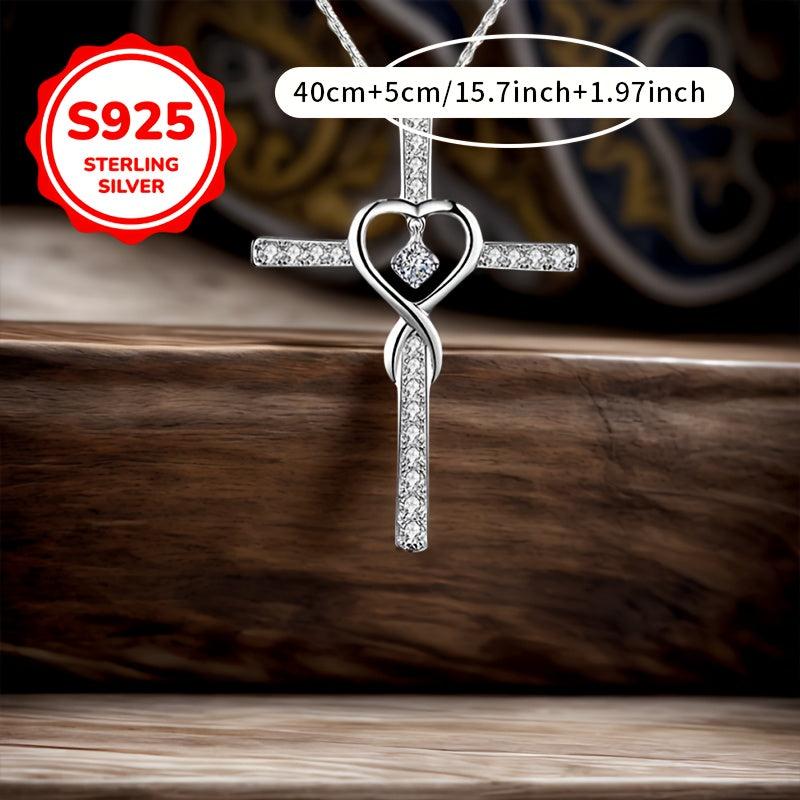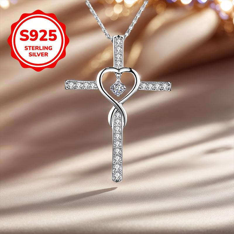 Elegant women's pendant necklace with intertwined cross and heart design, adorned with bling for a royal flair. Made of high-quality S925 silver.