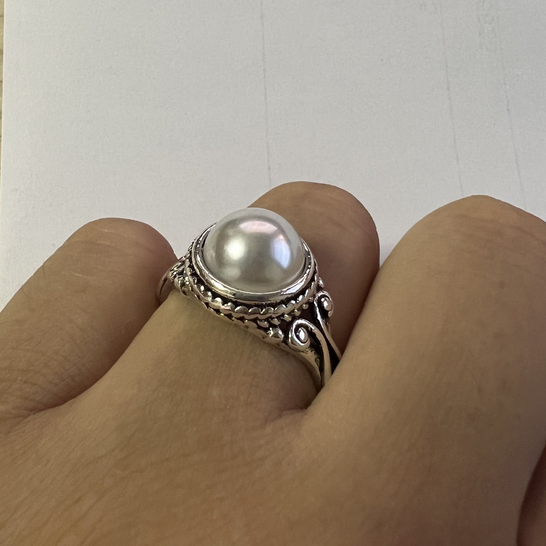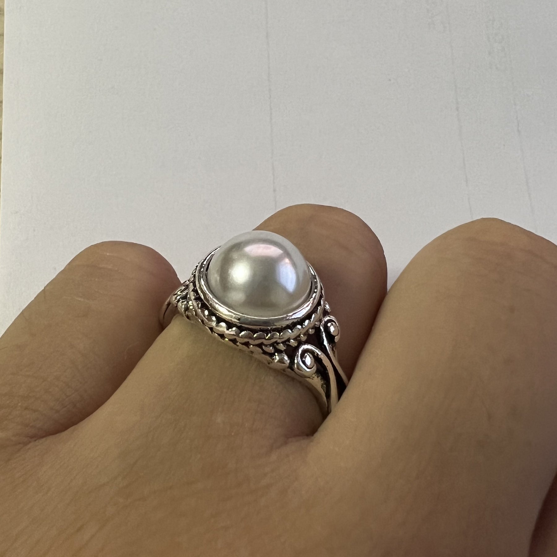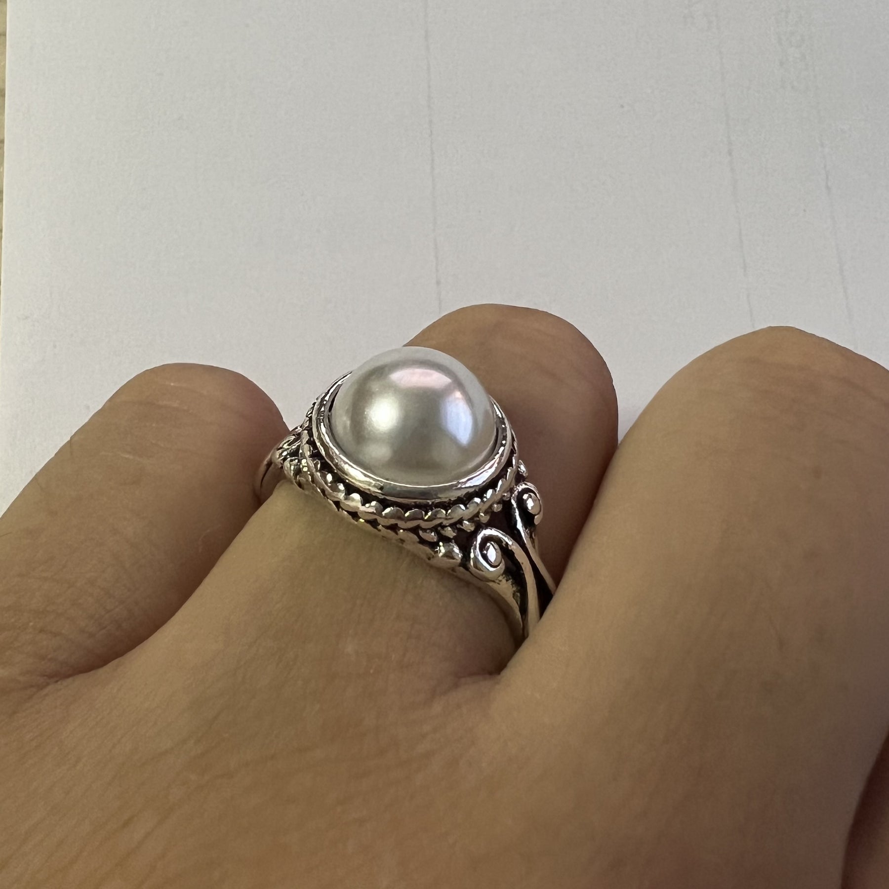 This exquisite vintage pearl ring features 925 silver plating and beautifully carved design. Perfect for weddings, engagements, parties, and daily wear.