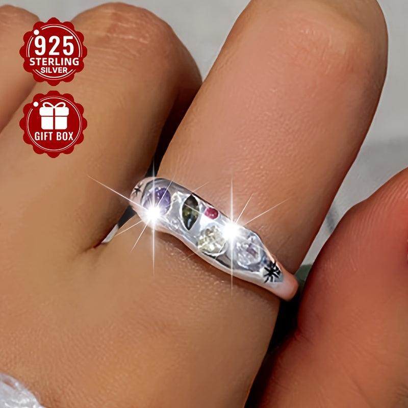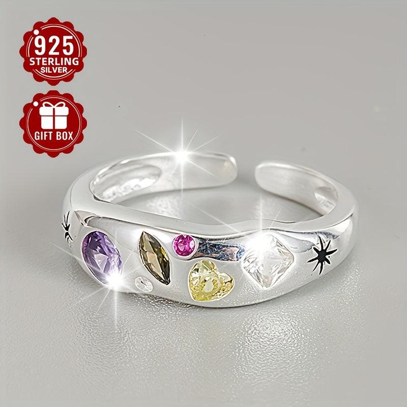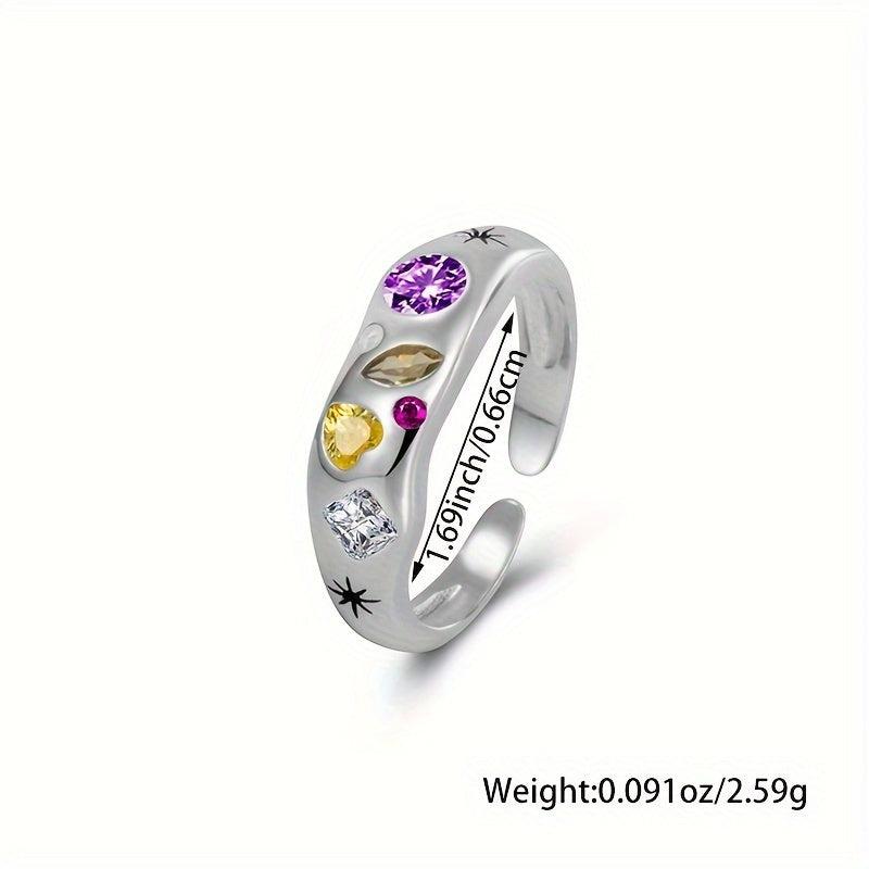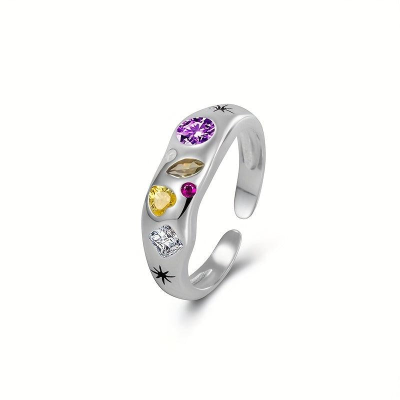 This open ring is made of 925 silver and features a colorful irregular synthetic zirconia geometric design. It is suitable for daily wear.