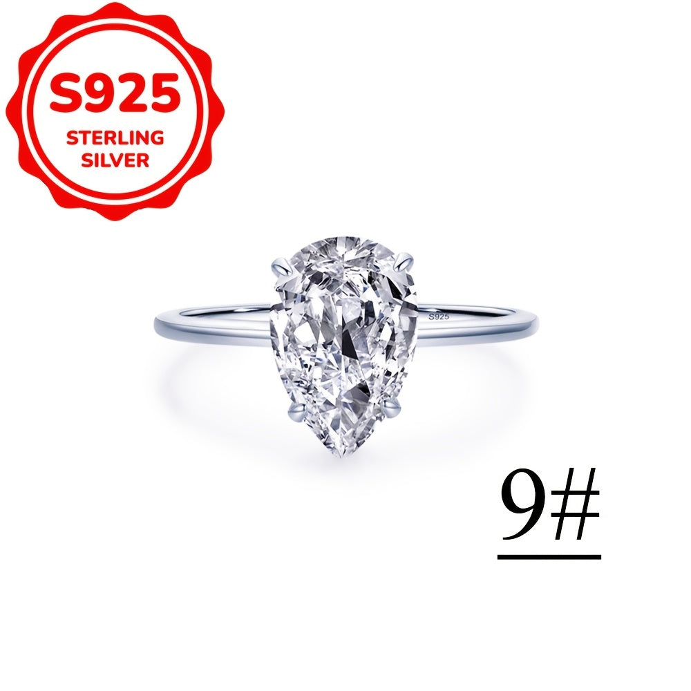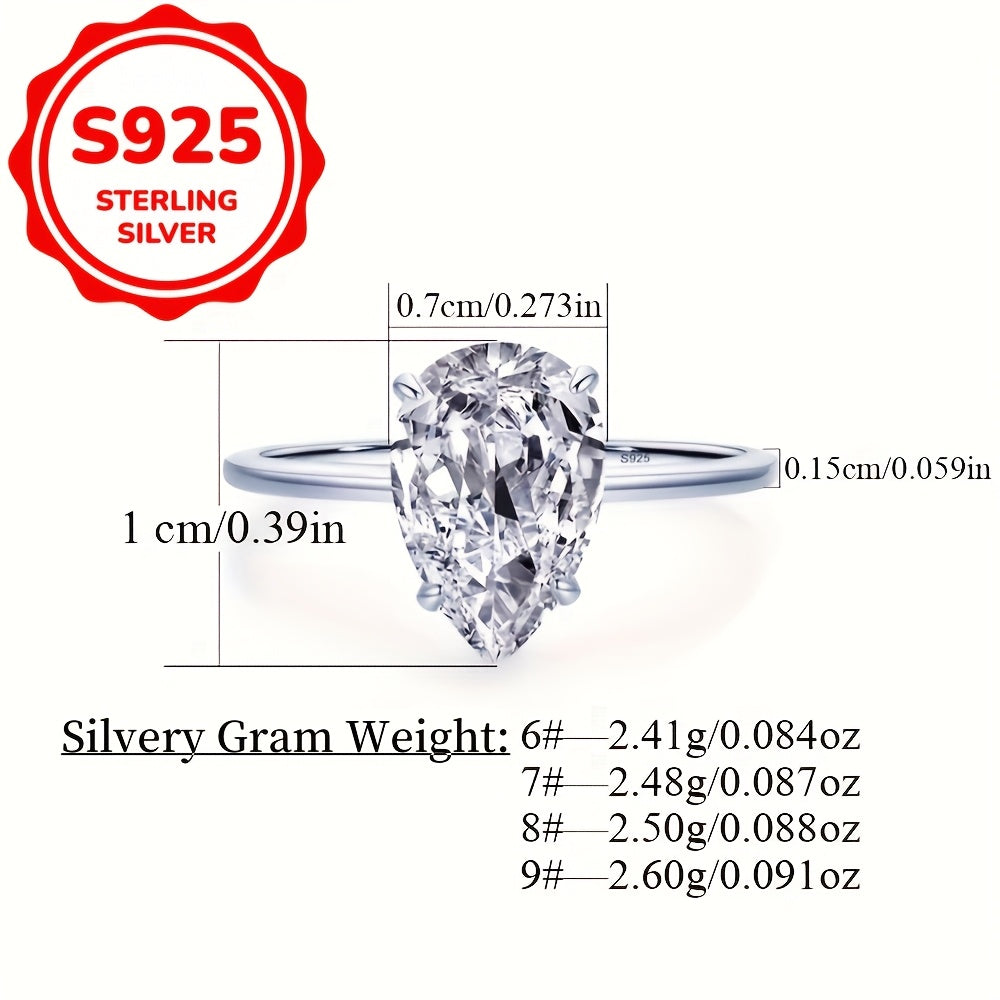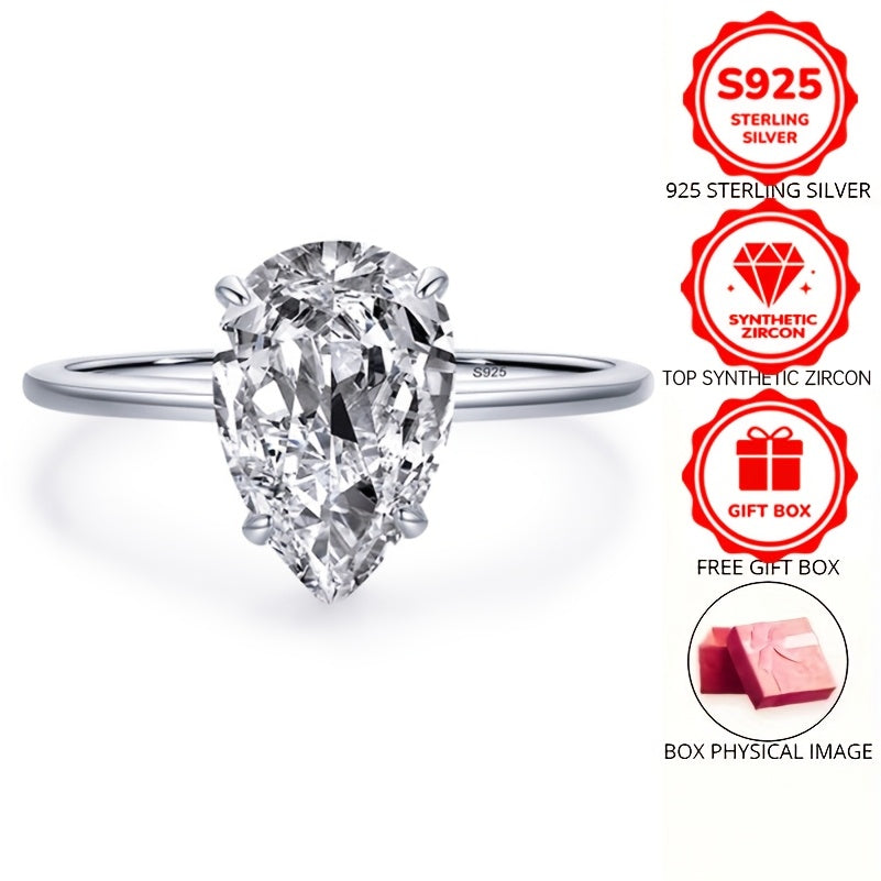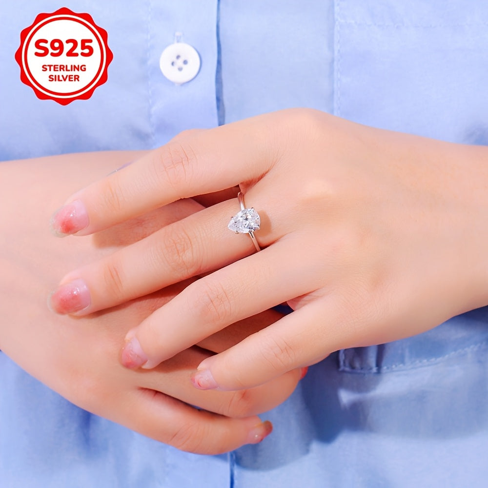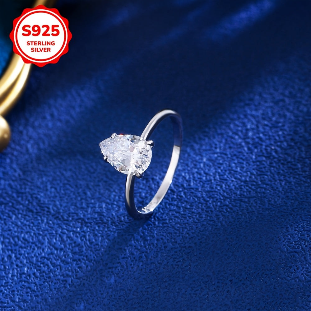 This elegant ring features a 925 pure silver band with a sparkling water drop cut synthetic Zirconia inlay. It is perfect for weddings, engagements, or promises.