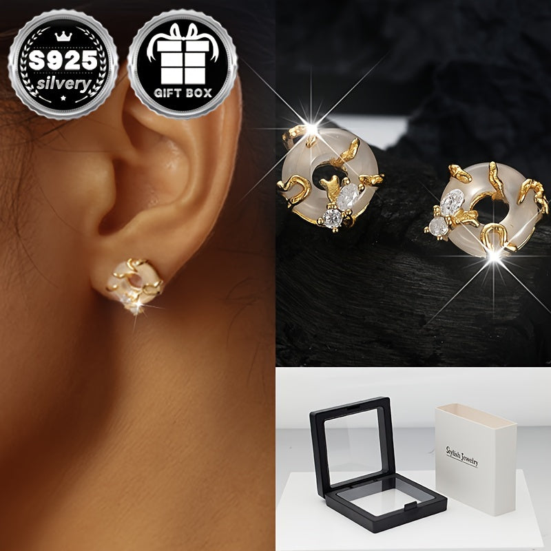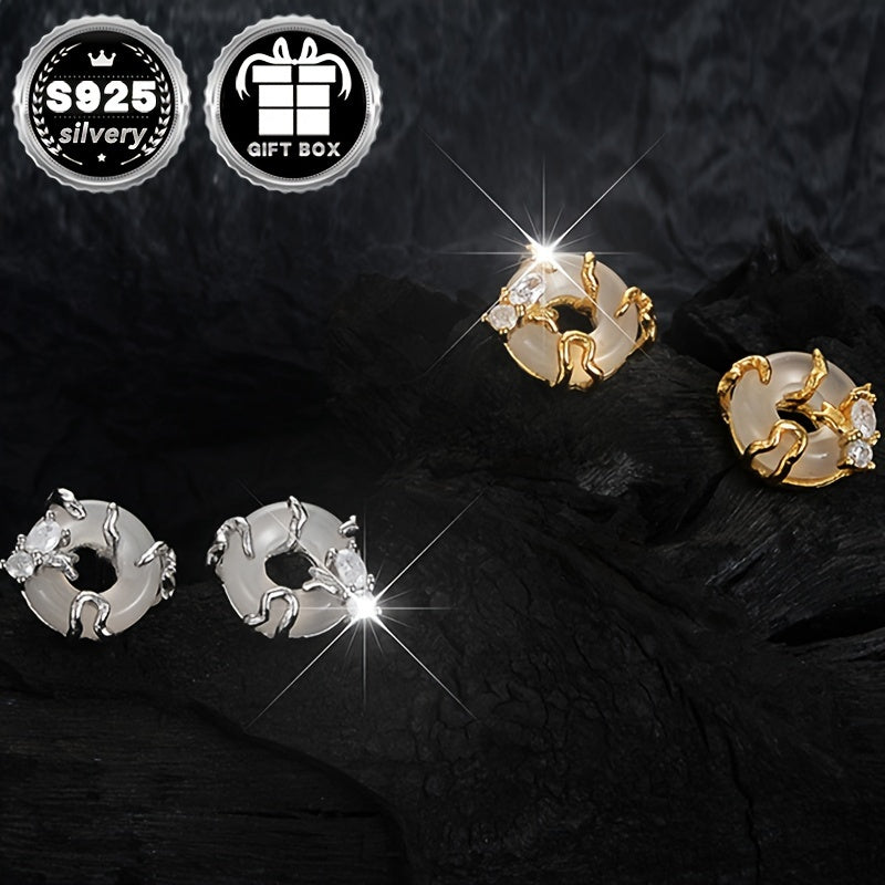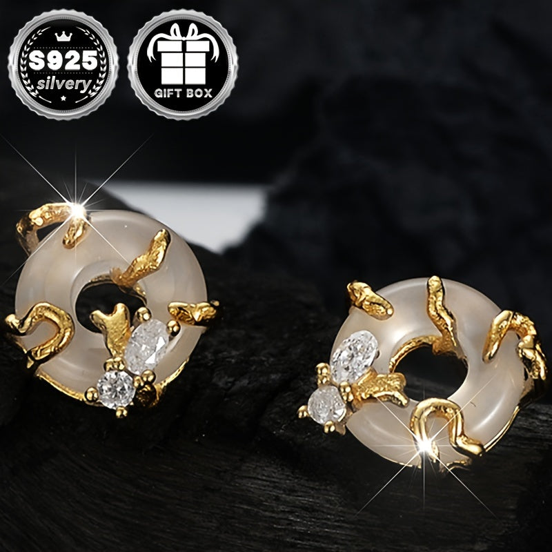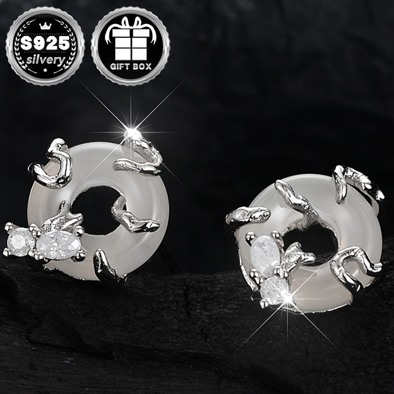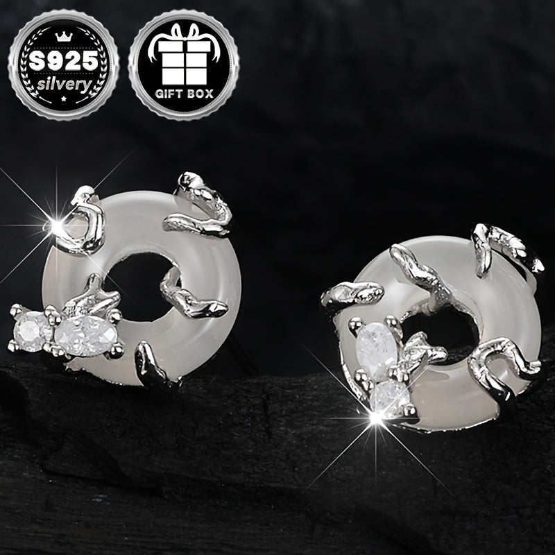 These stunning sterling silver stud earrings feature a Chinese style peace buckle design with sparkling zirconia inlay. They are hypoallergenic and perfect for daily wear.