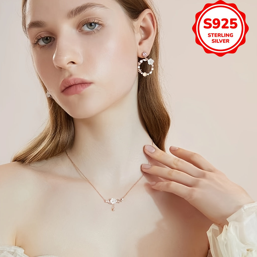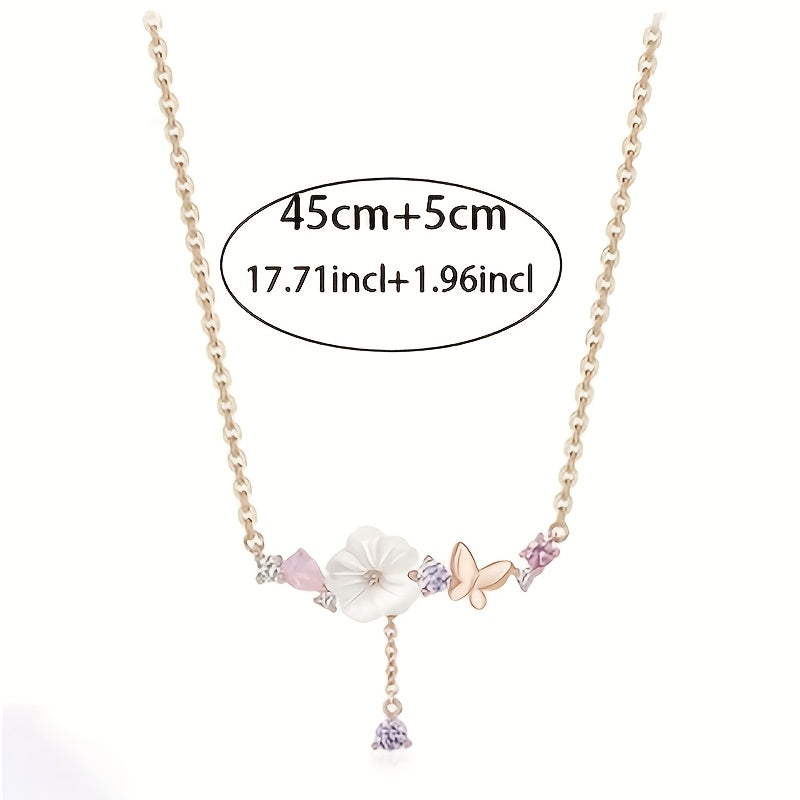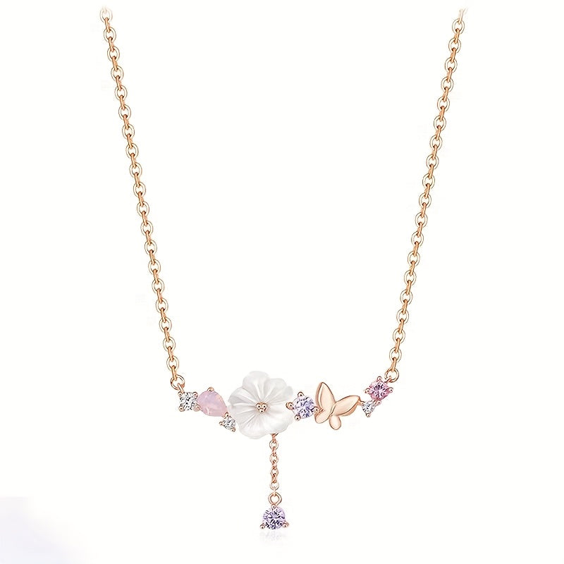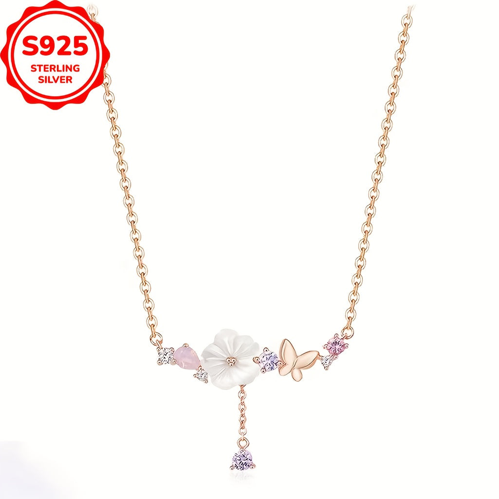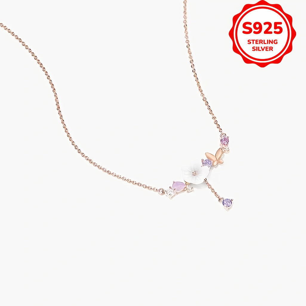 Vintage bohemian style pendant necklace with butterfly and flower design. Made of high-quality 925 sterling silver with sparkling cubic zirconia stones.