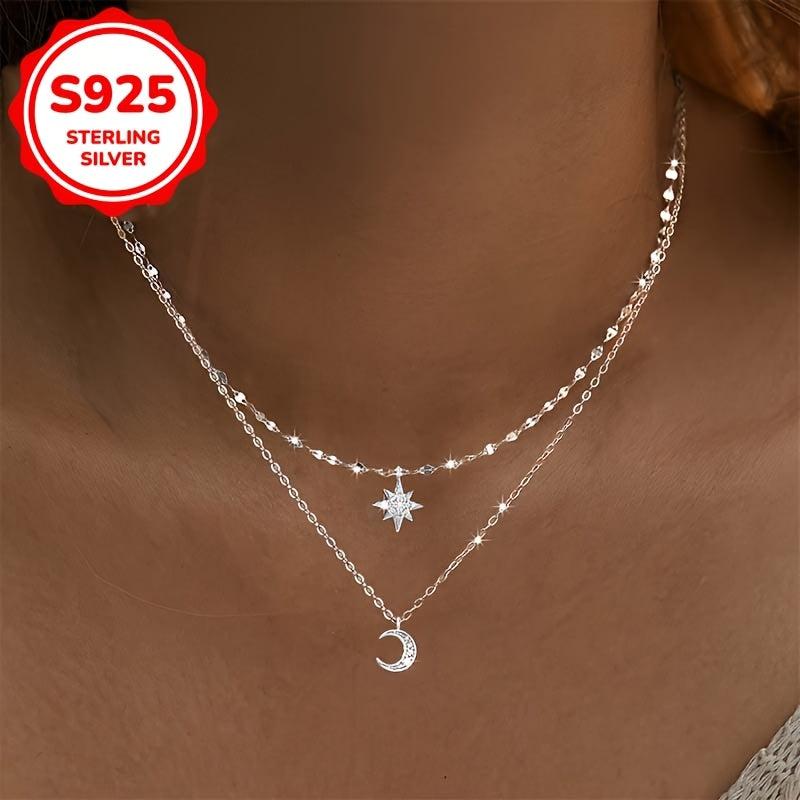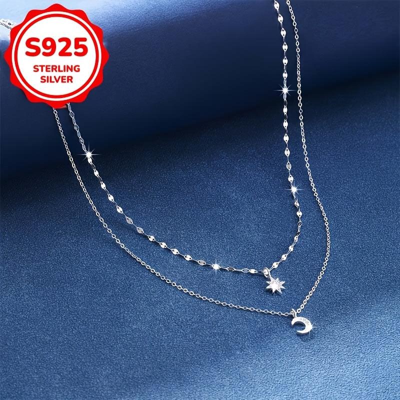 This stylish chain necklace features a moon and star double layer design with a fashionable star and moon pendant. Made of 5.3 grams of S925 silver.