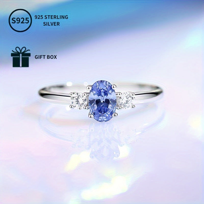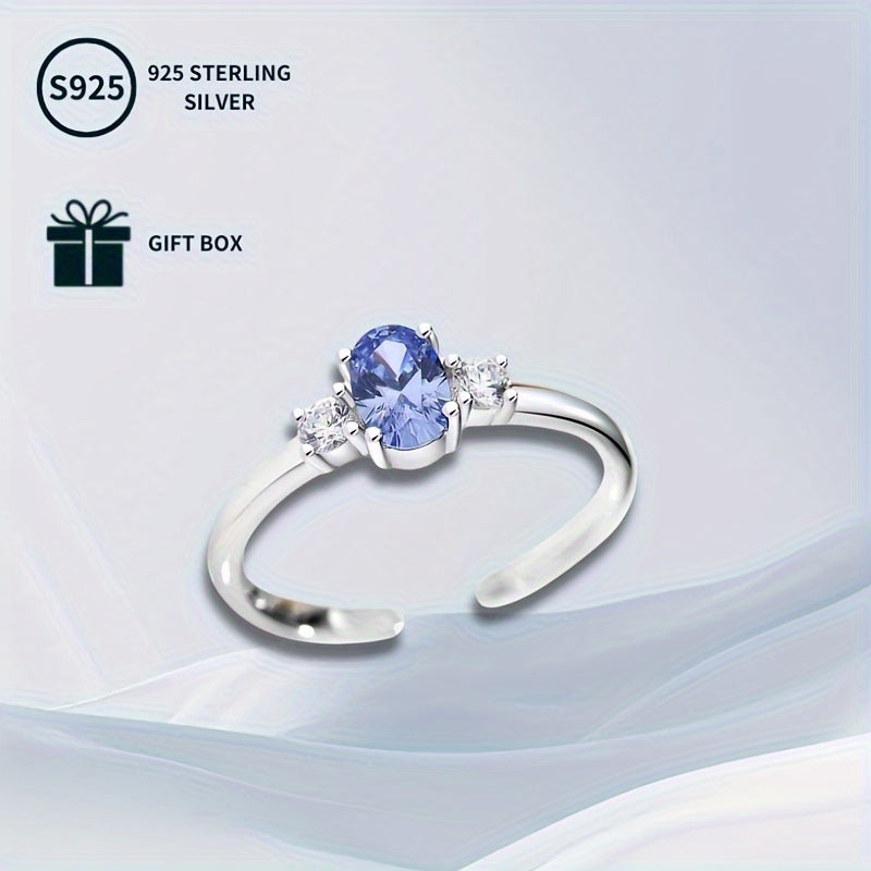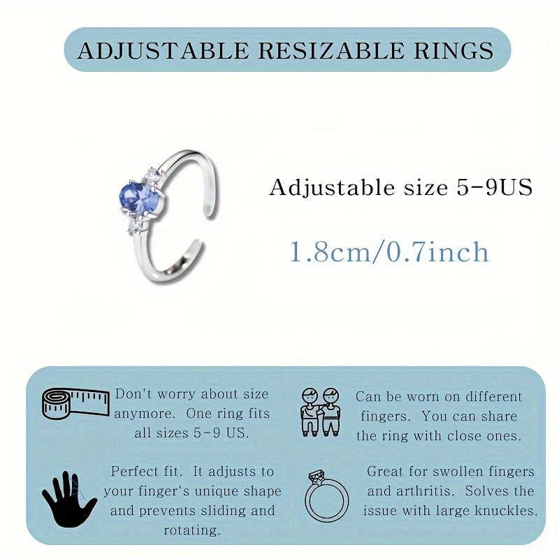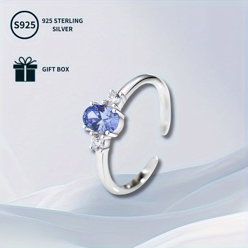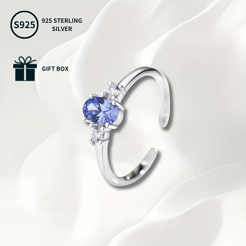 This elegant ring features a Tanzanite colored synthetic cubic zirconia stone set in a platinum-plated 925 sterling silver adjustable open band. Perfect for daily wear and vacation.