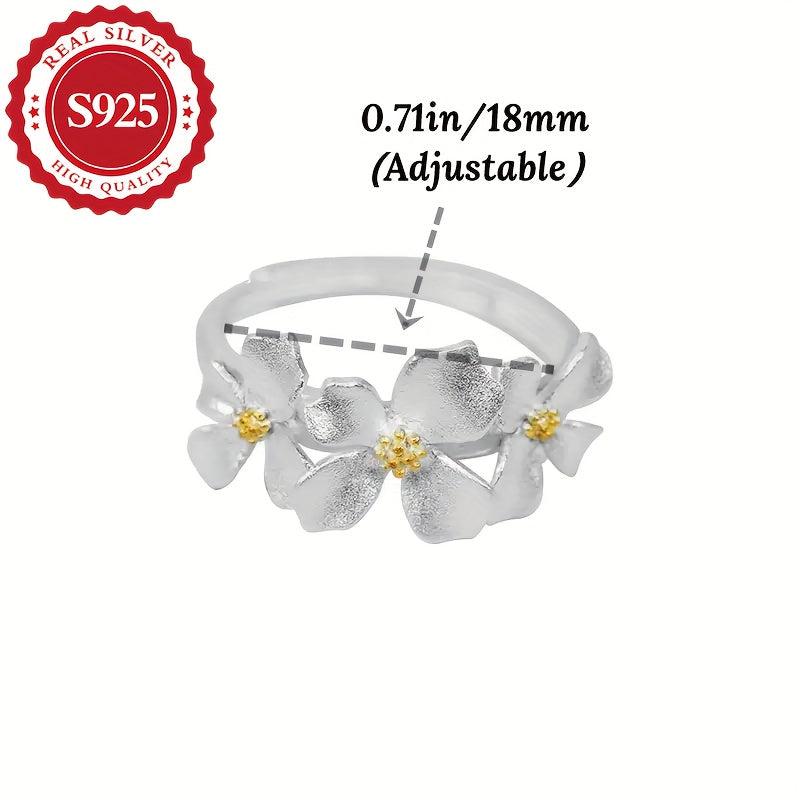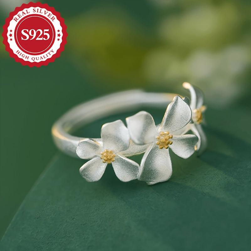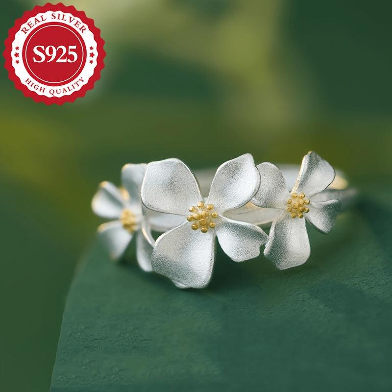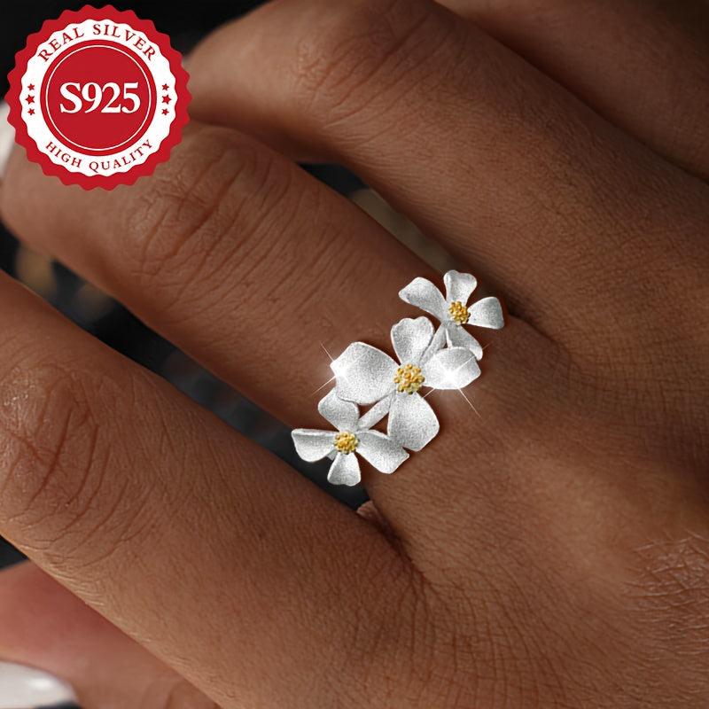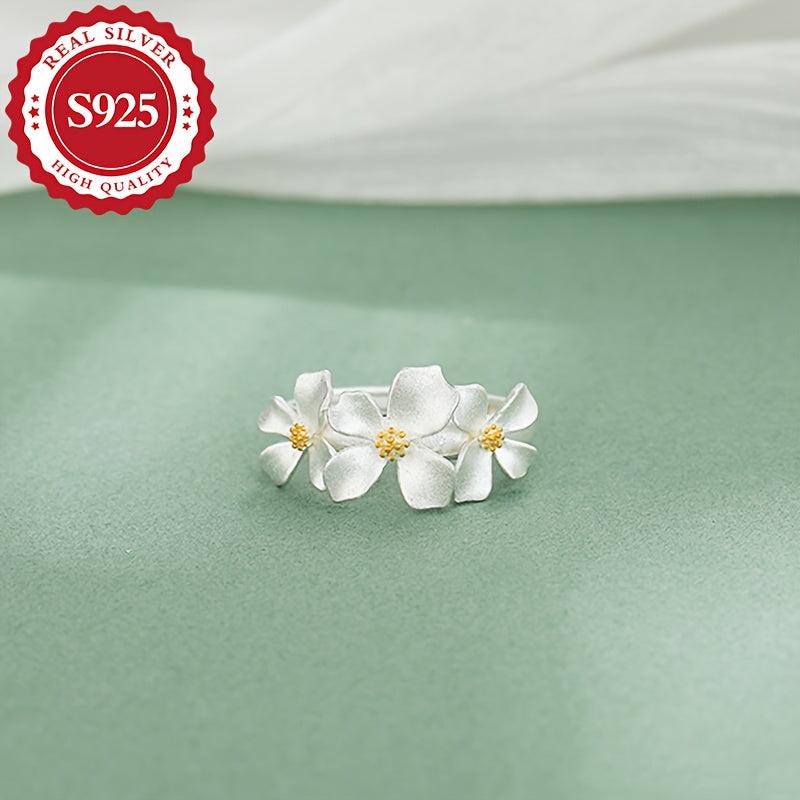 This women's ring features three gardenia and daisy flowers crafted from S925 silver that can be pulled out. It's a great gift for friends, suitable for daily wear, sweet, and hypoallergenic.