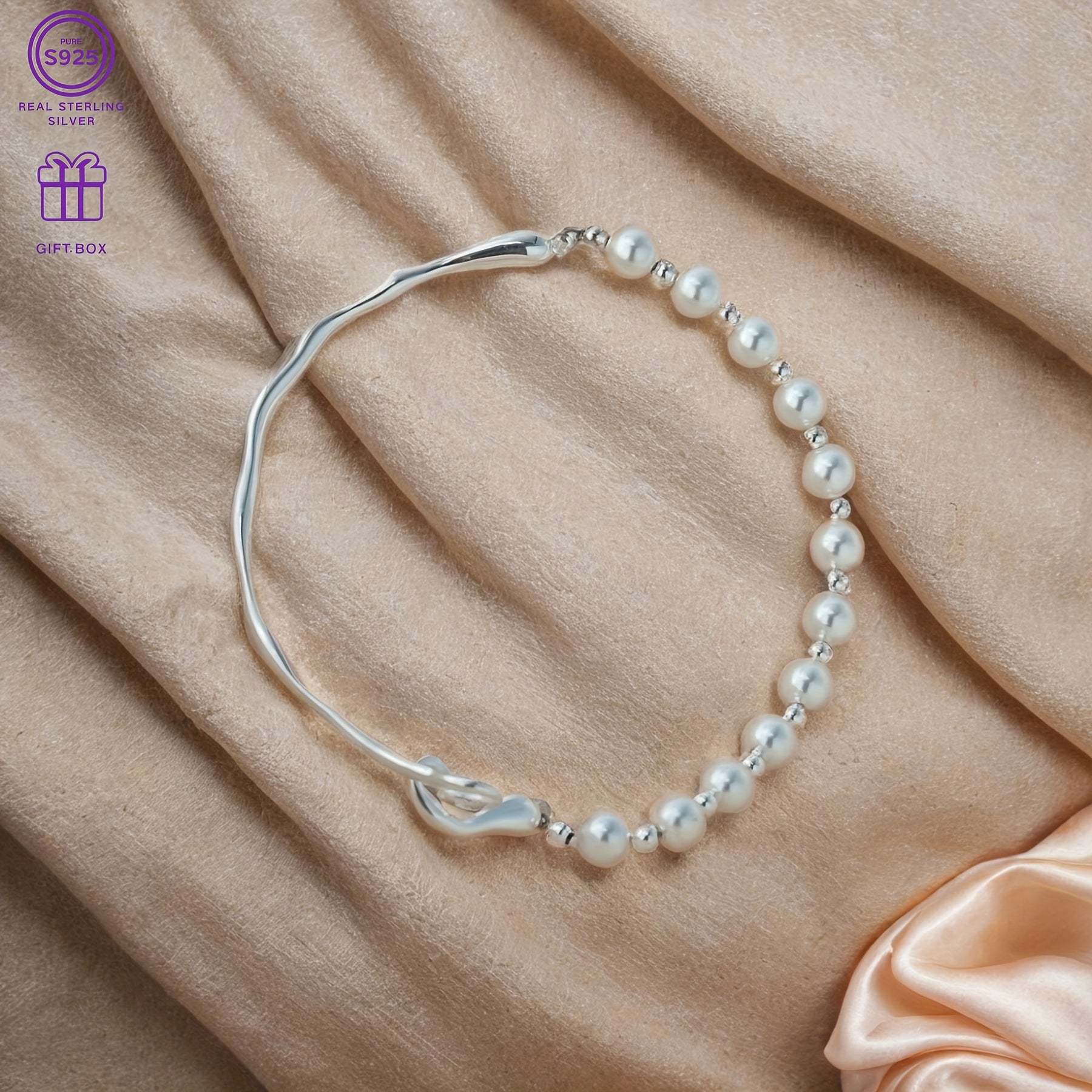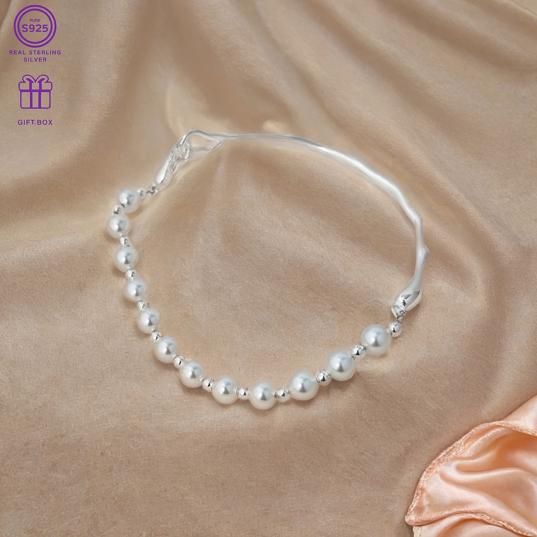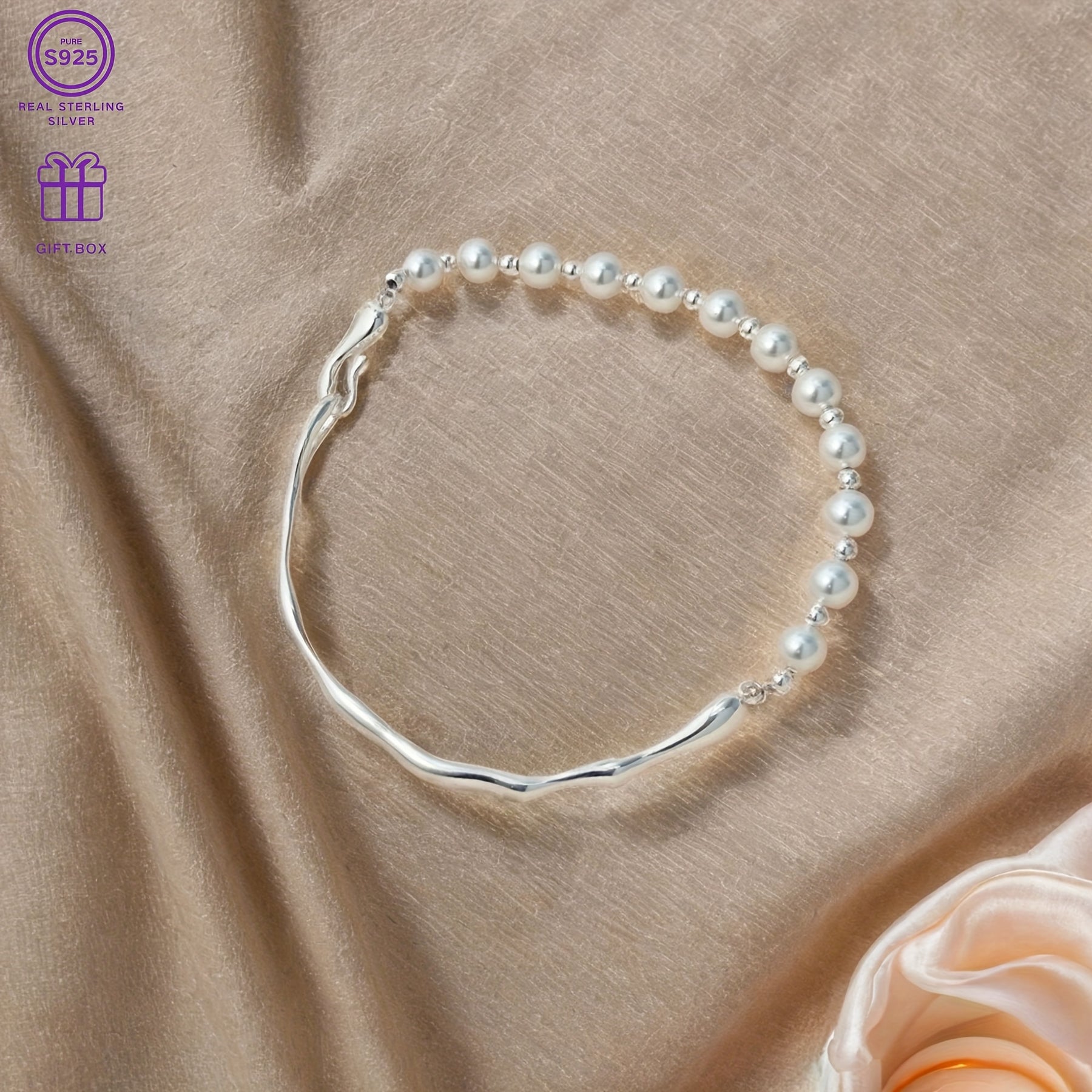 Unique silver bracelet with varying bead sizes and patterns. Crafted with natural freshwater pearls for an elegant look.