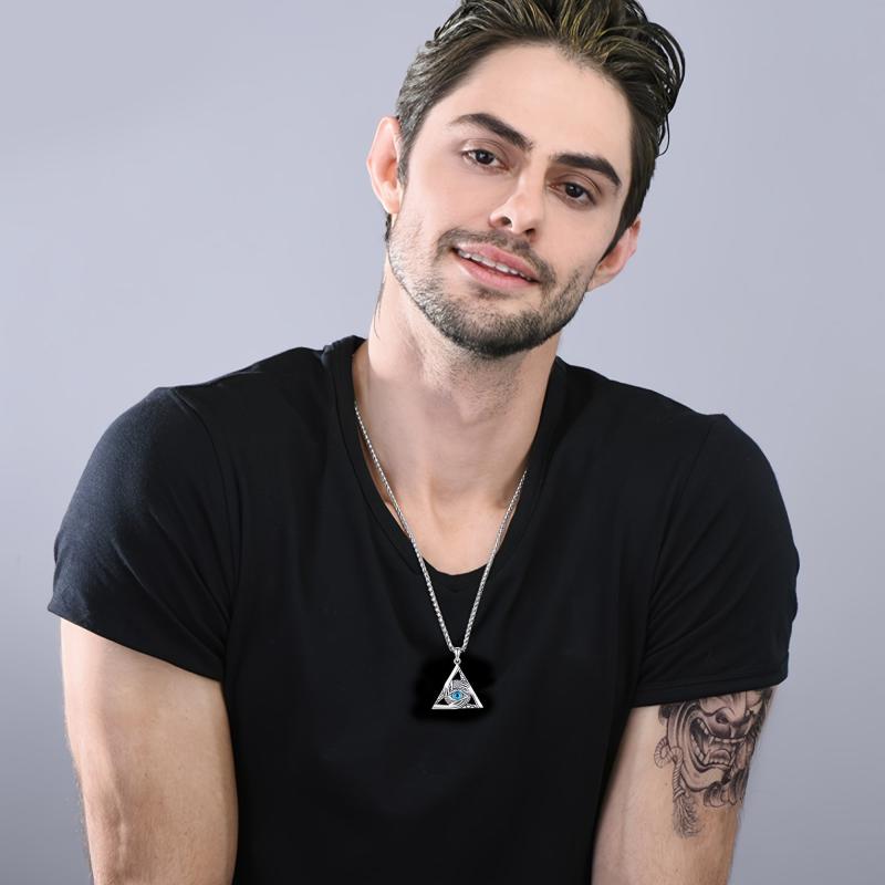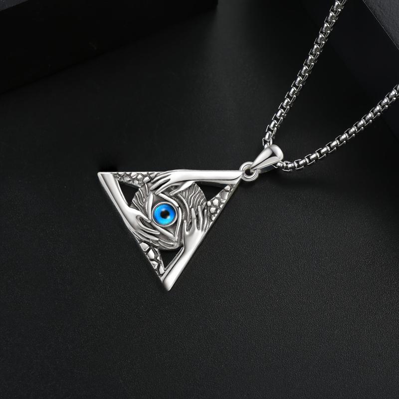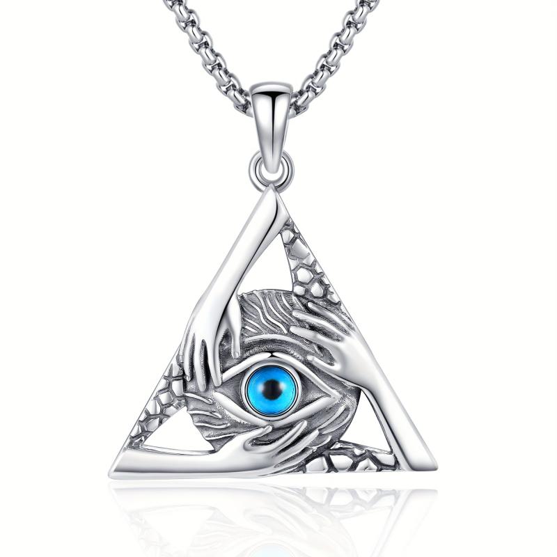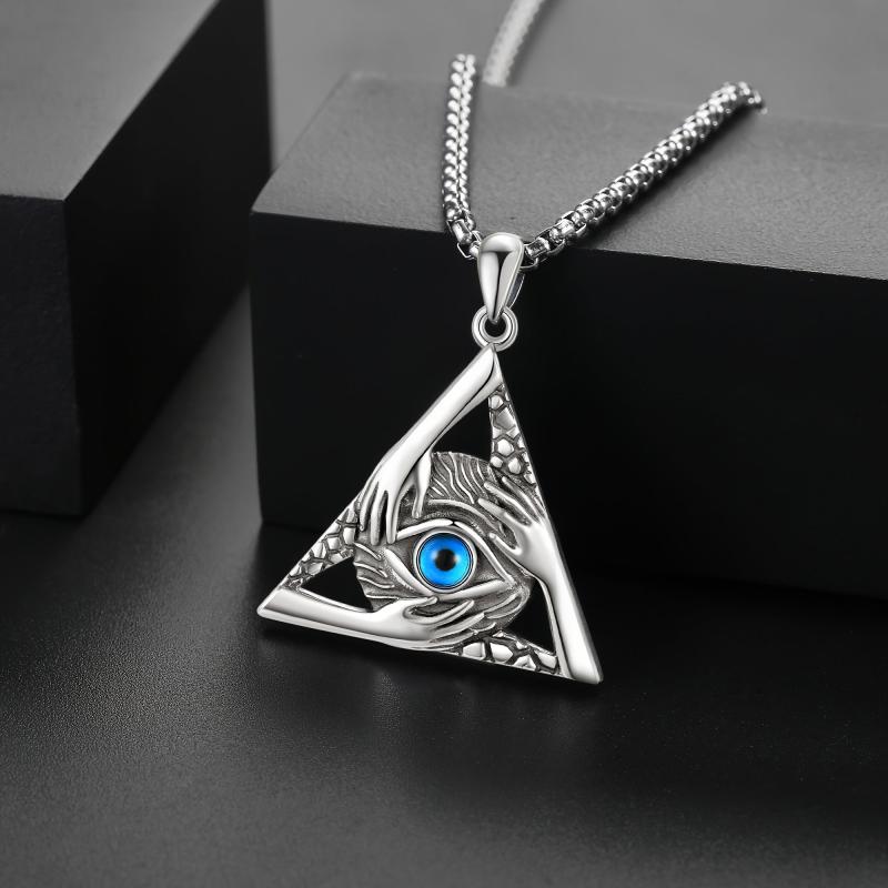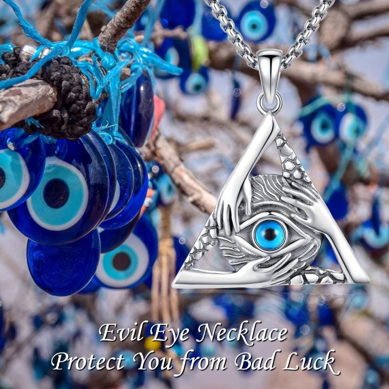 This sterling silver Evil Eye necklace features an Egyptian design, making it a unique and meaningful piece of jewelry. It is a symbol of protection and wards off negative energy.